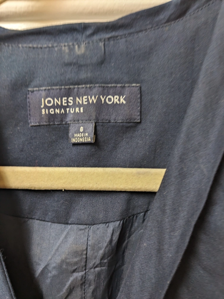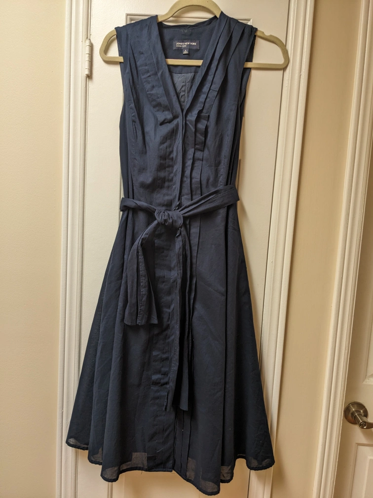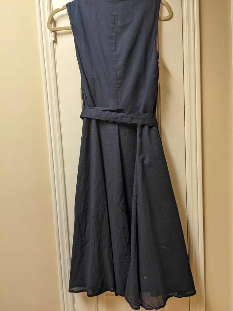Size 6 navy blue buttoned dress with a V-neck and a tie belt. The dress is sleeveless and has a flowy skirt.