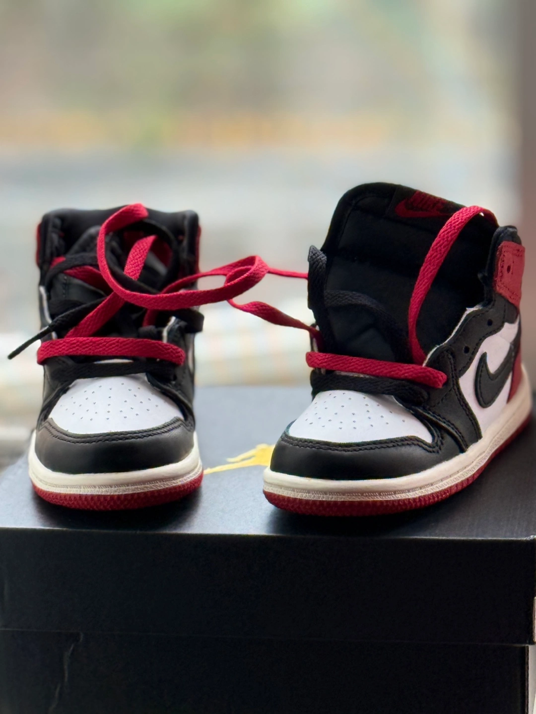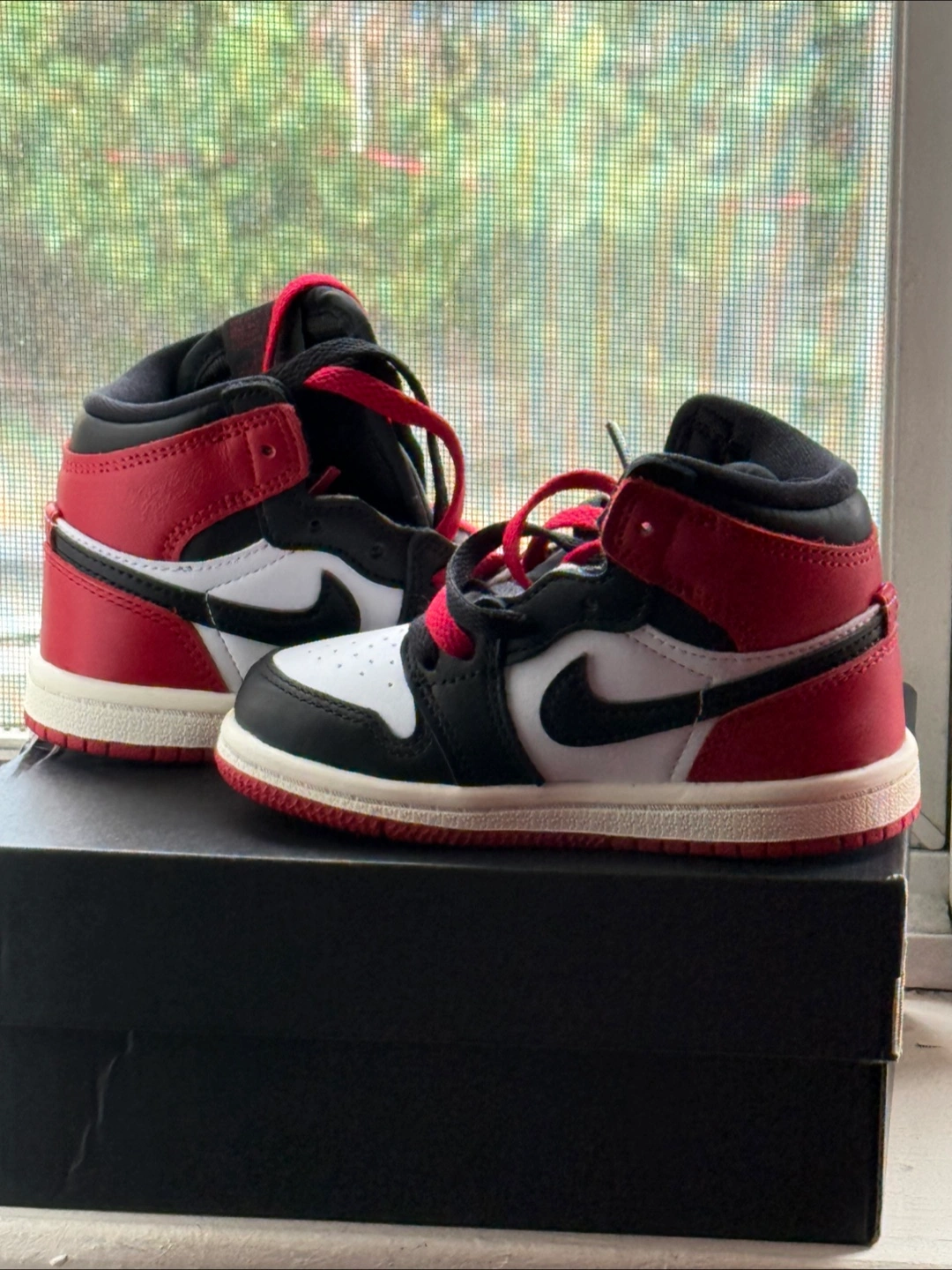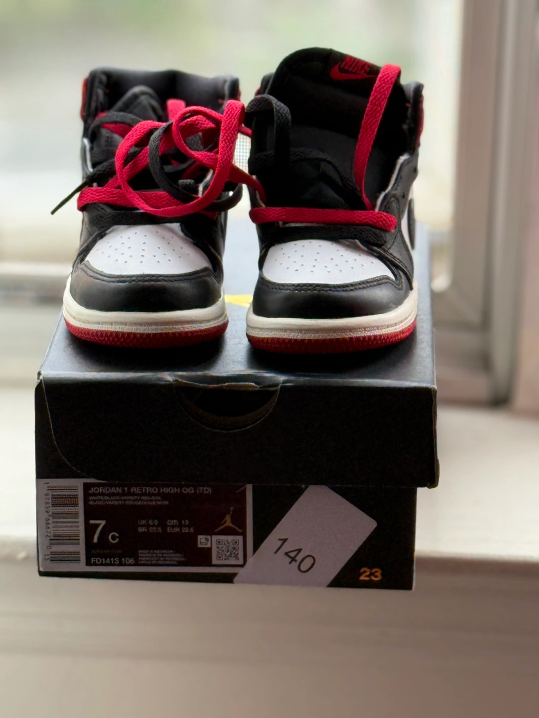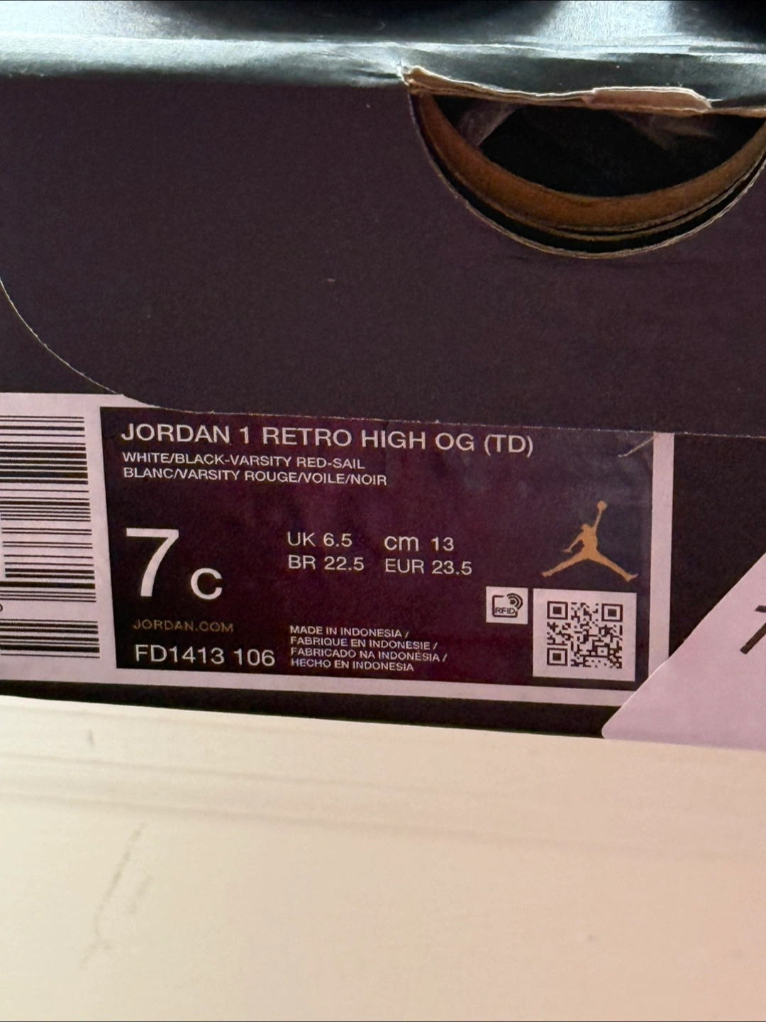 33Selling a pair of Jordan 1 Retro High OG (TD) in size 7C. They are in excellent condition and come with the original box! The colorway is White/Black-Varsity Red-Sail. Great for your little one!
