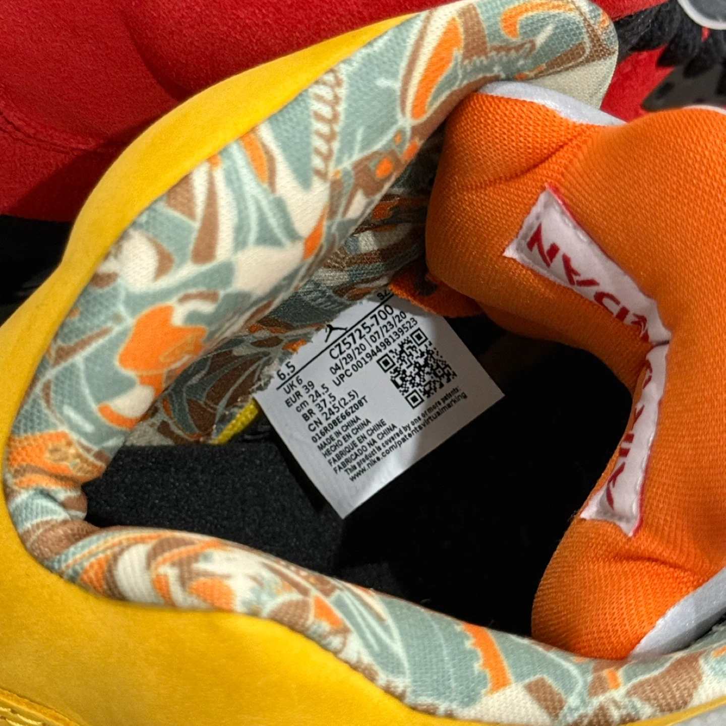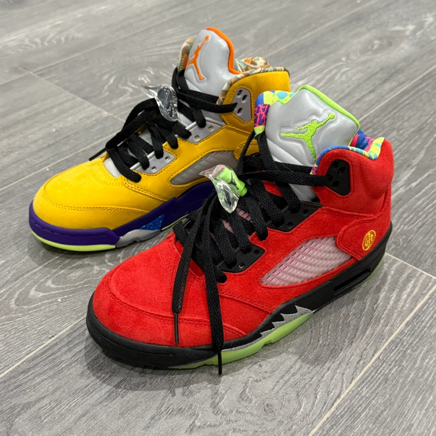 60Brand new without box Mens US 6.5, Womens US size 8 Pickup in ridgewood Product Description:: To honor the 30th Anniversary of the Jordan 5, Jordan Brand added a "What The?" treatment to its catalog with the Jordan 5 What The. In true mismatched fashion, each foot of the Jordan 5 What The showcases a different look. On the right, yellow suede from the Tokyo 5 smothers the upper atop a purple and blue speckled Belair 5 midsole with a patterned interior pulled from the Jordan 5 Olive. On the left, red suede tributing the Raging Bull Jordan 5 covers the upper atop a black, grey, and lime green sole that references the Quai 54 iteration. Heel embroidery nodding to the Shanghai and Tokyo models, icy translucent outsoles, and 3M reflective tongues complete this scrambled iteration. The Jordan 5 What The released in November of 2020 and retailed for $220.