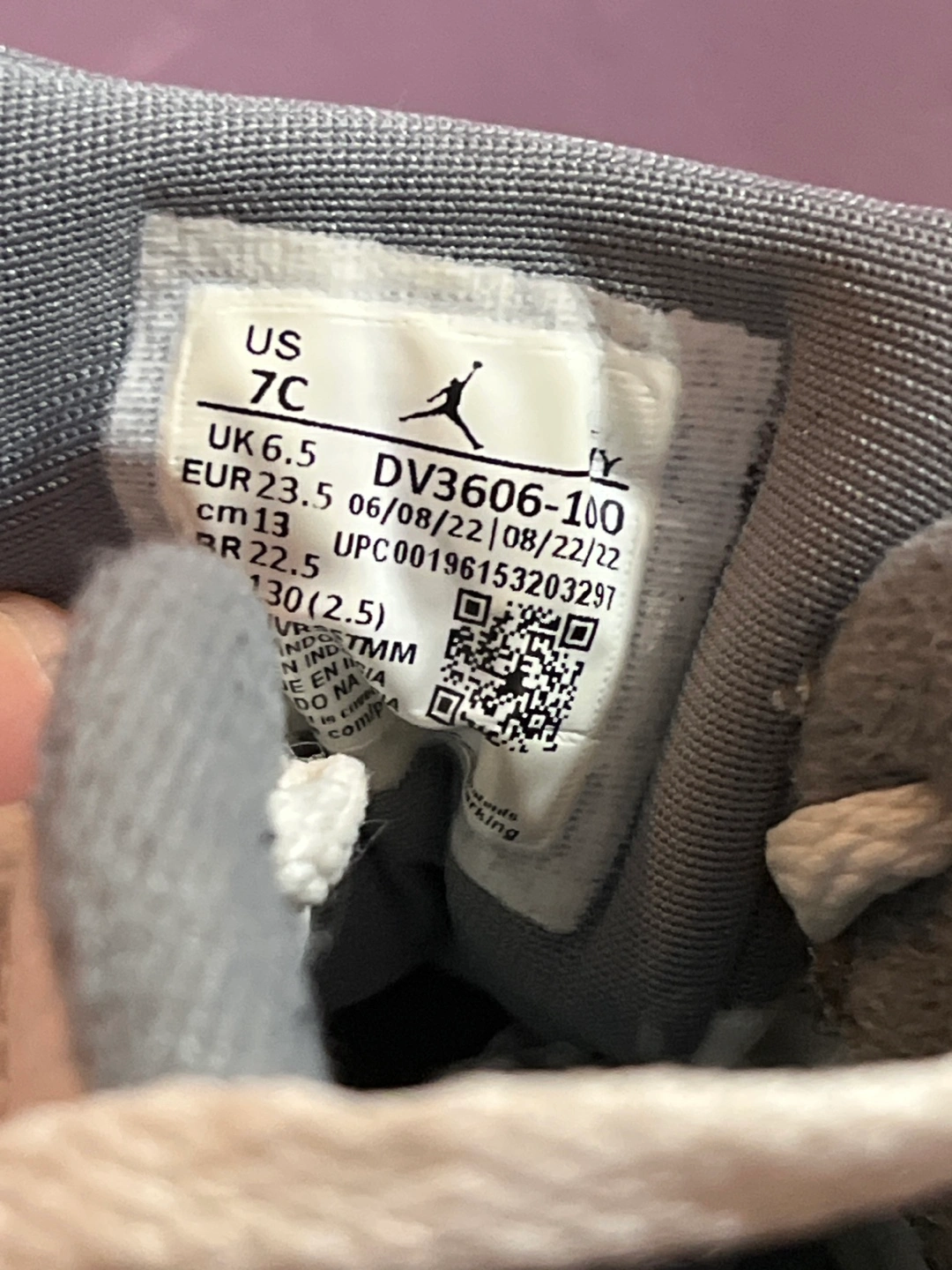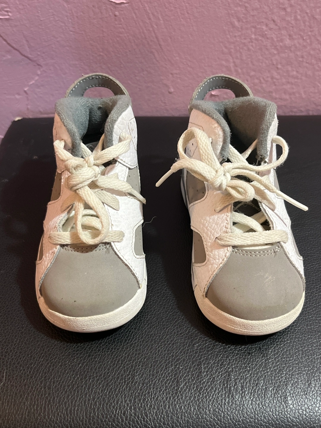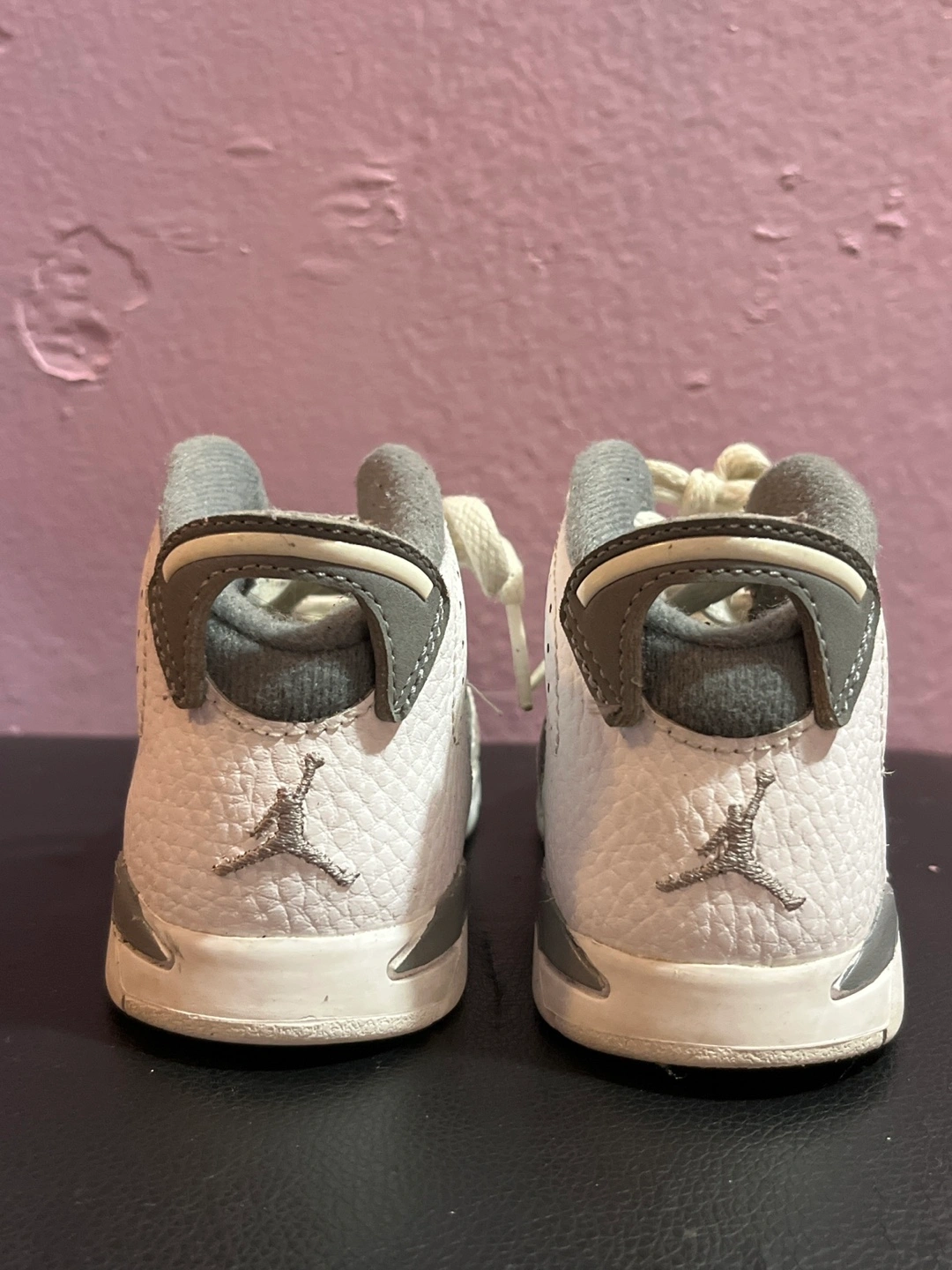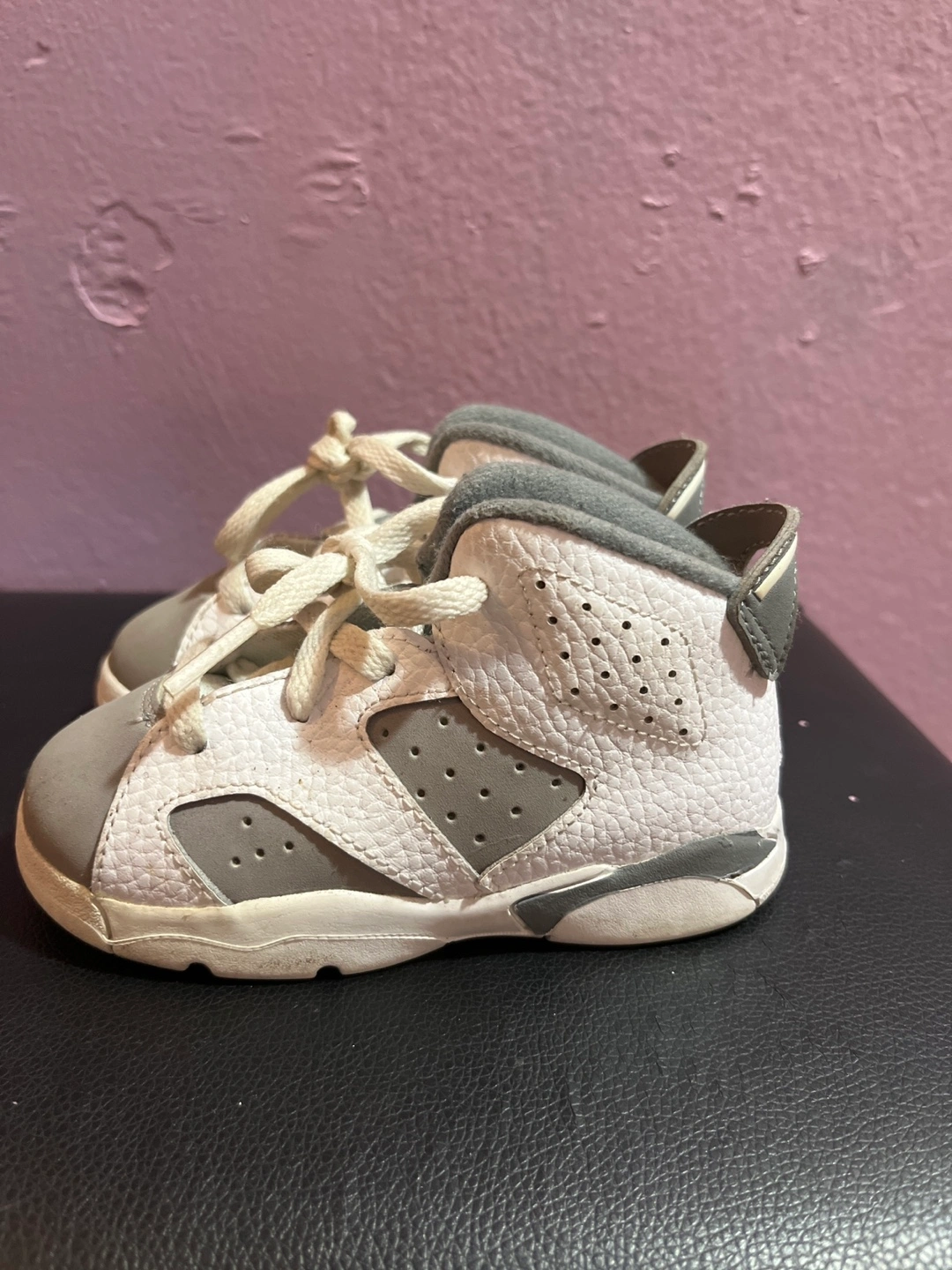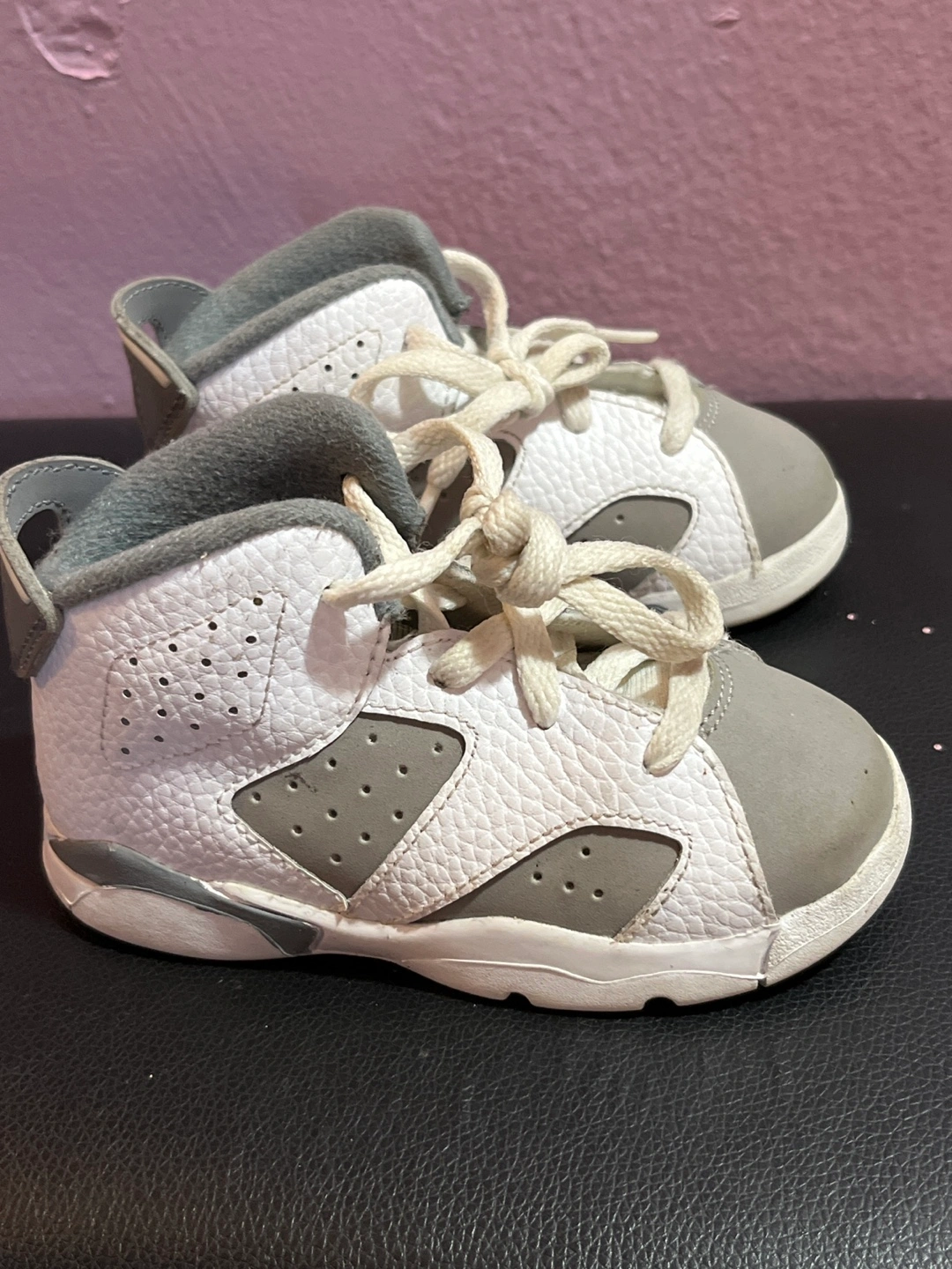 Selling a pair of Jordan 6 toddler shoes in size 7C. They are white and grey and have the Jordan logo on the back. Great for your little one!