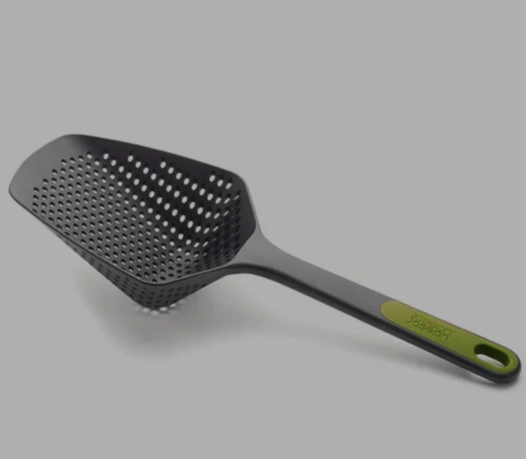 This is a Joseph Joseph scoop colander skimmer. It's great for scooping and draining food directly from pots and pans. The ergonomic handle makes it easy to use and the integrated tool rest prevents messes