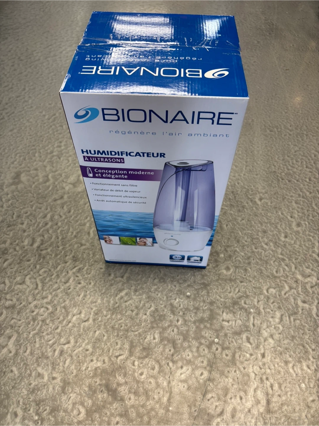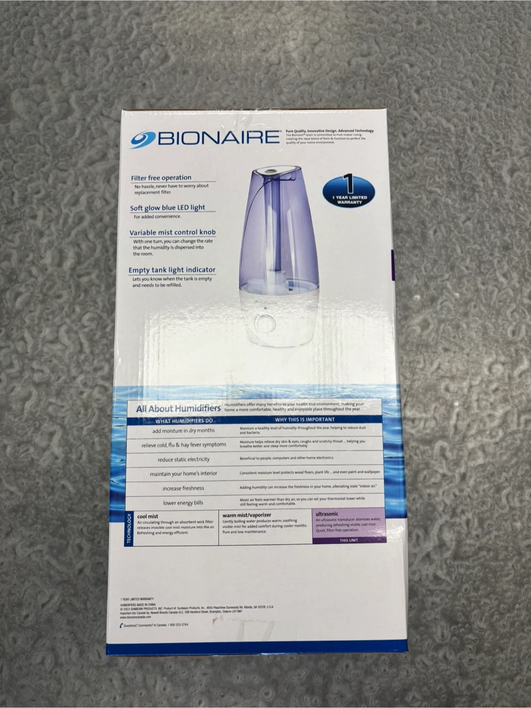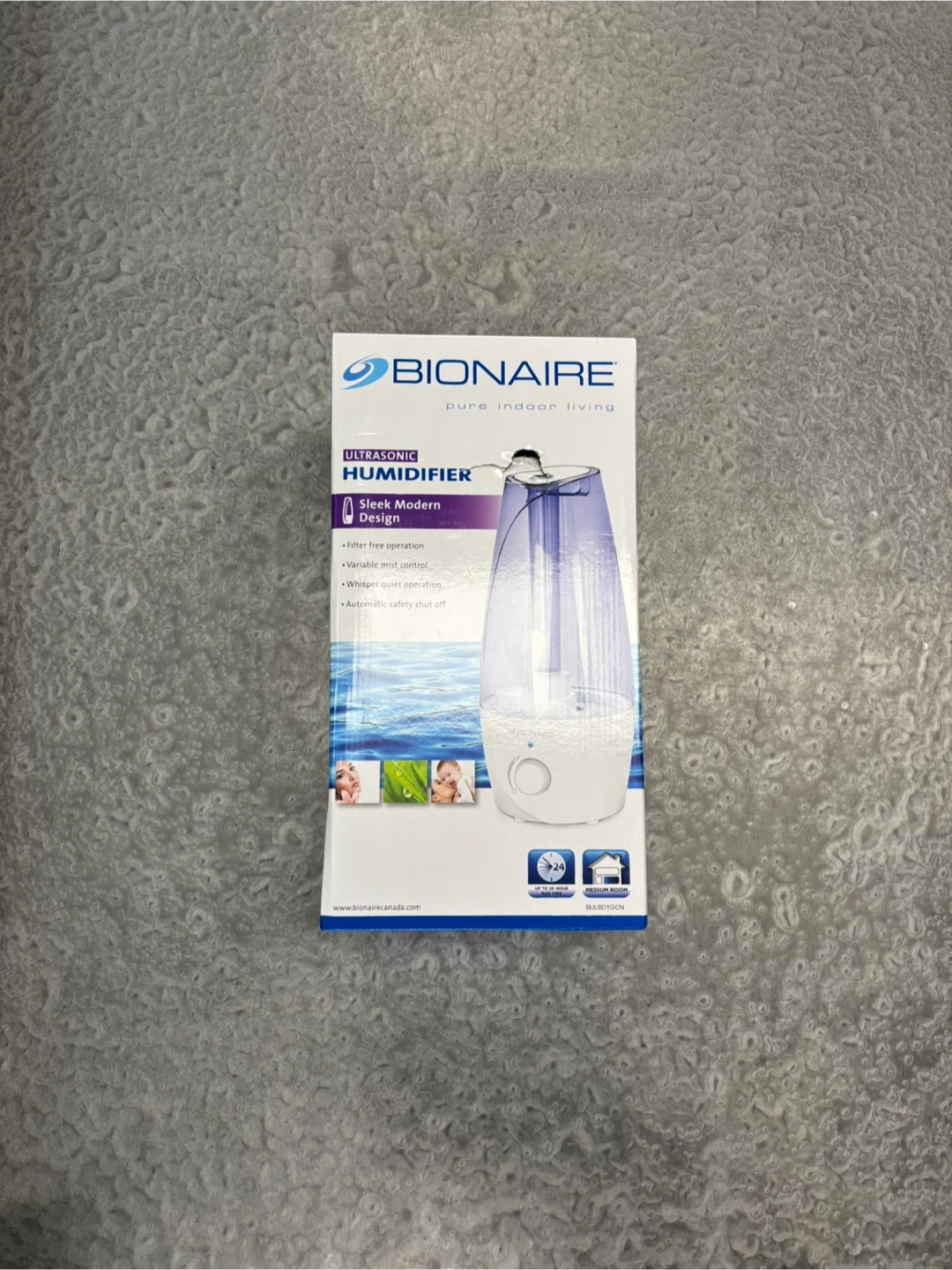 This Bionaire Ultrasonic Humidifier offers filter-free operation with variable mist control. It has a sleek modern design and an empty tank light indicator. This unit is great for adding moisture to dry air in any room.Brand new. Never used.