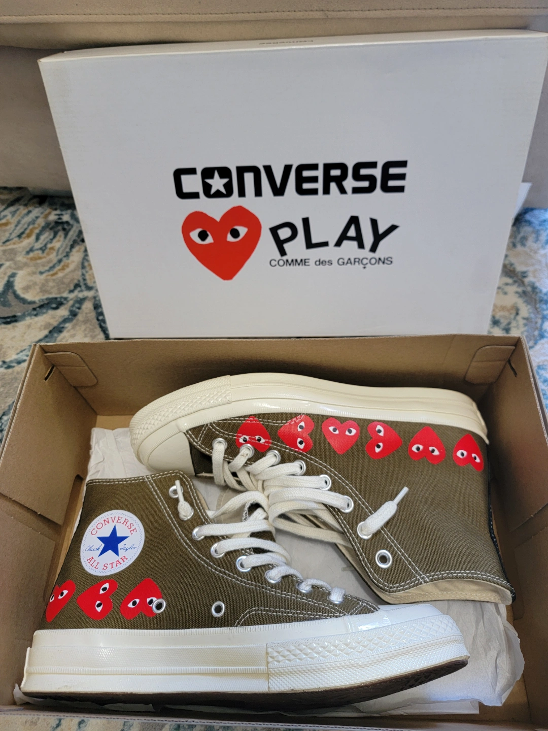 Olive green canvas high-top sneakers. Red heart detailing. Comme des Garçons Play collaboration. New with box.