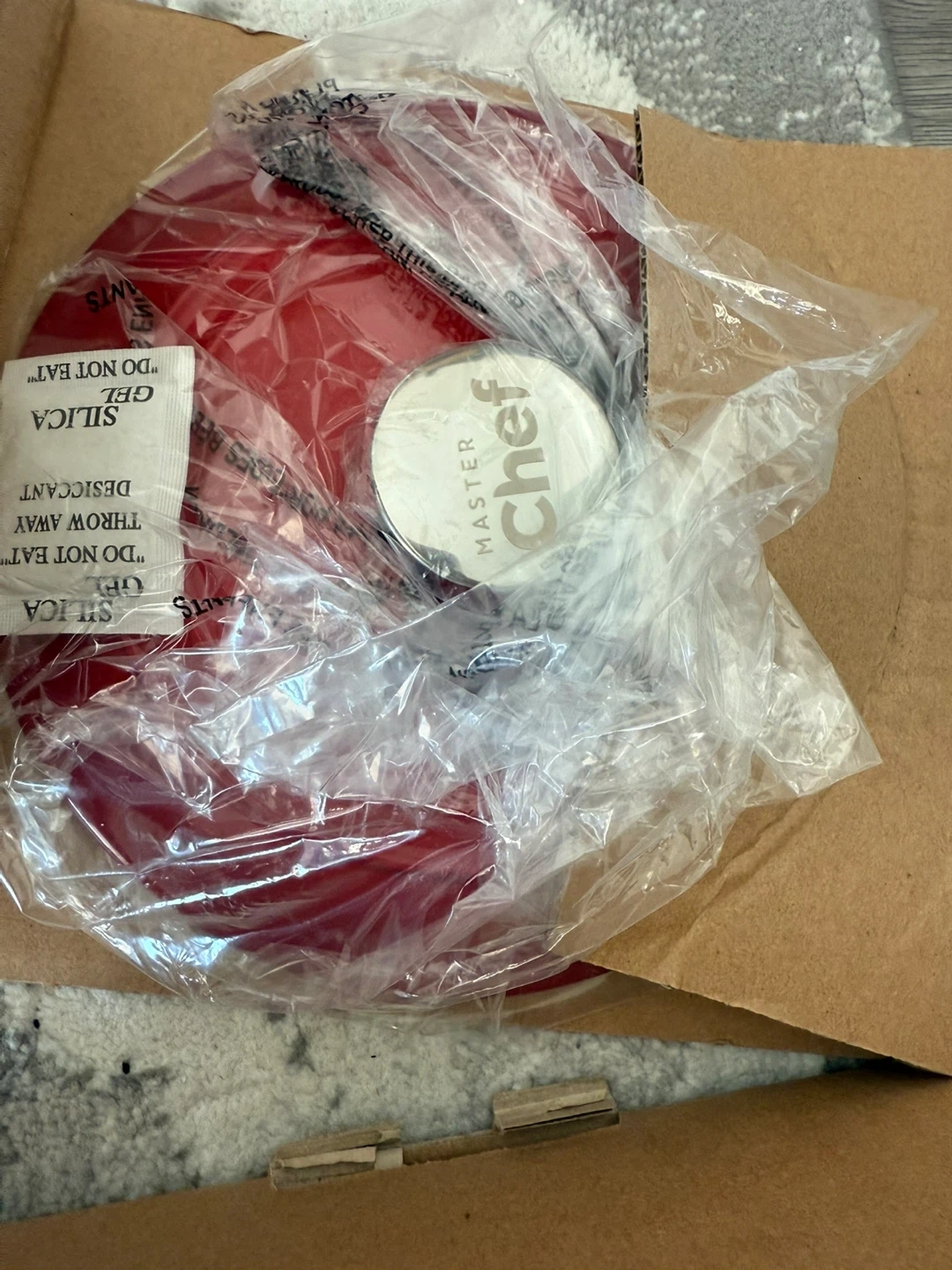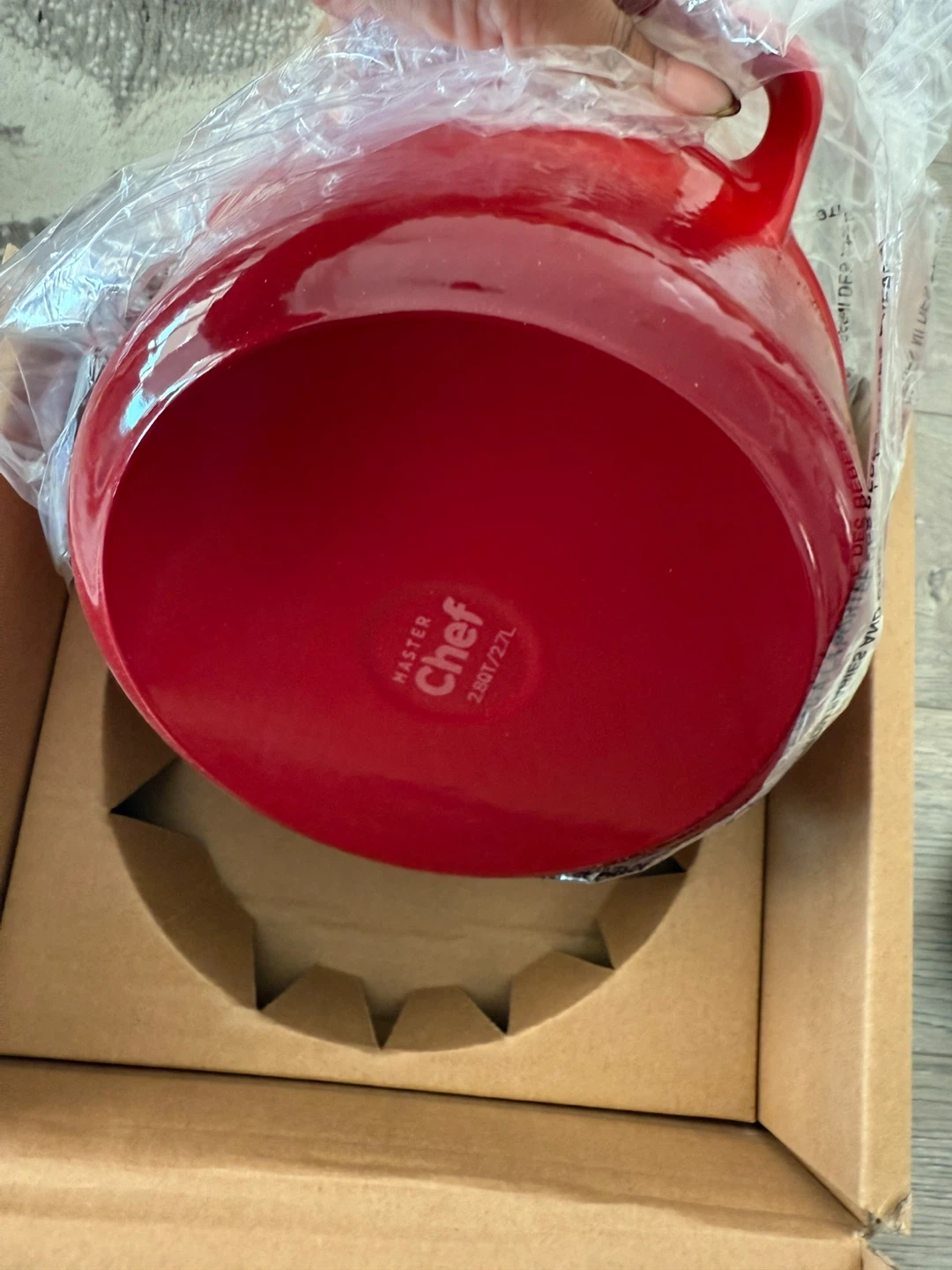 Selling a brand new Master Chef 2.7L Round Red Cast-Iron Dutch Oven! It's still in its original packaging and has never been used. This durable cast-iron oven provides excellent heat distribution and retention, and it's oven-safe up to 475°F/246°C. Perfect for all your cooking needs!