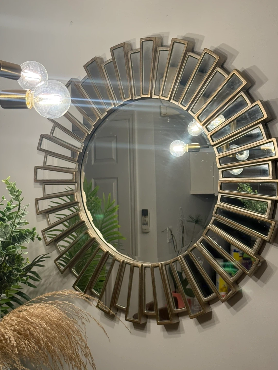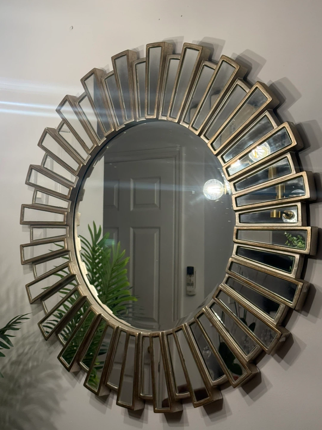 Decorative sunburst wall mirror. Features a gold-silver toned frame with radiating rectangular mirror accents. It's a stylish piece for any room!