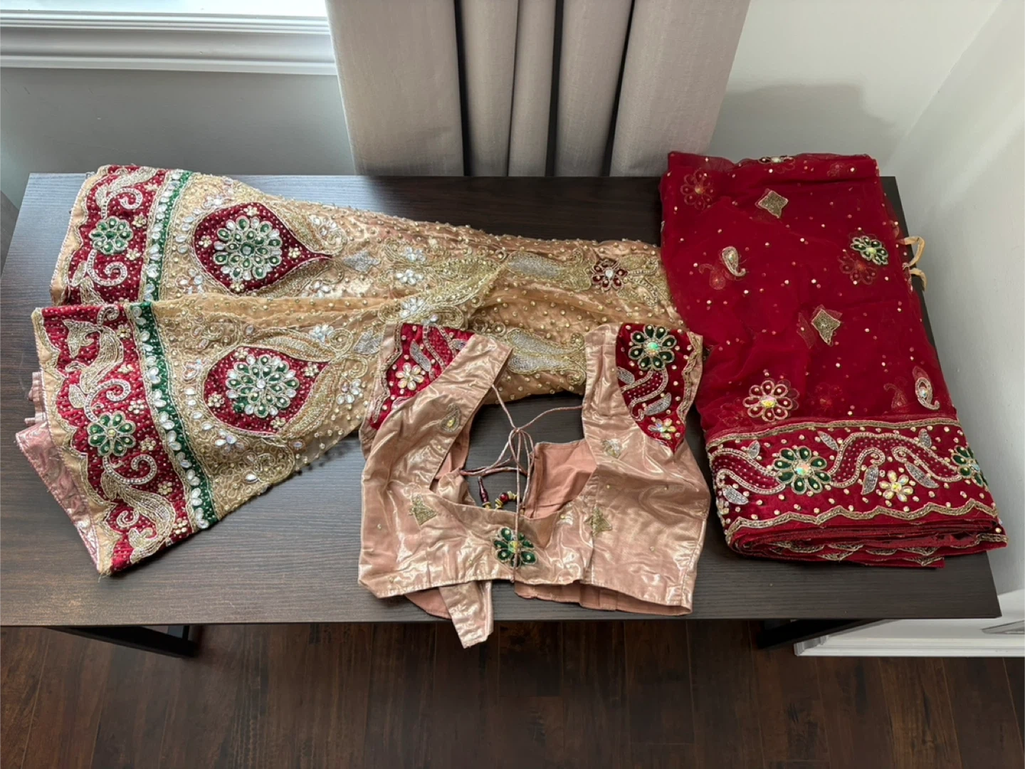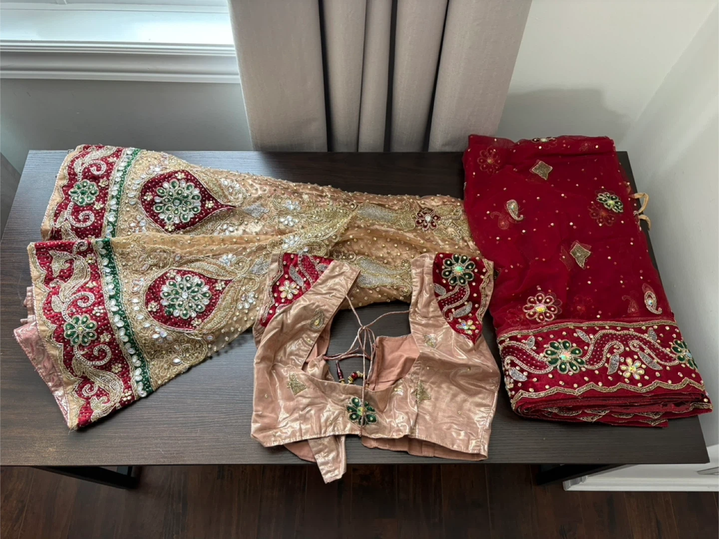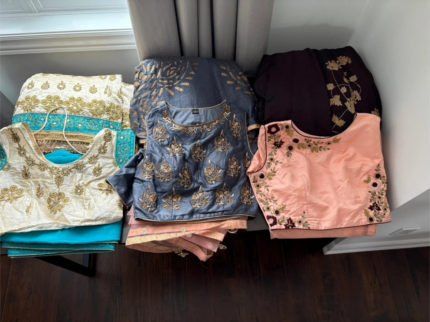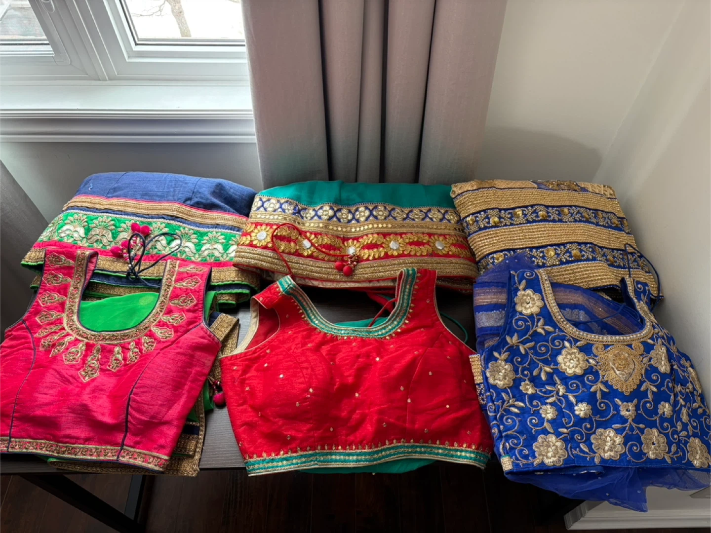 A collection of vibrant, intricately embroidered Indian sari blouses and skirts. These pieces feature detailed gold, red, and blue threadwork with bead embellishments on various colored fabrics. Ready for festive occasions!
