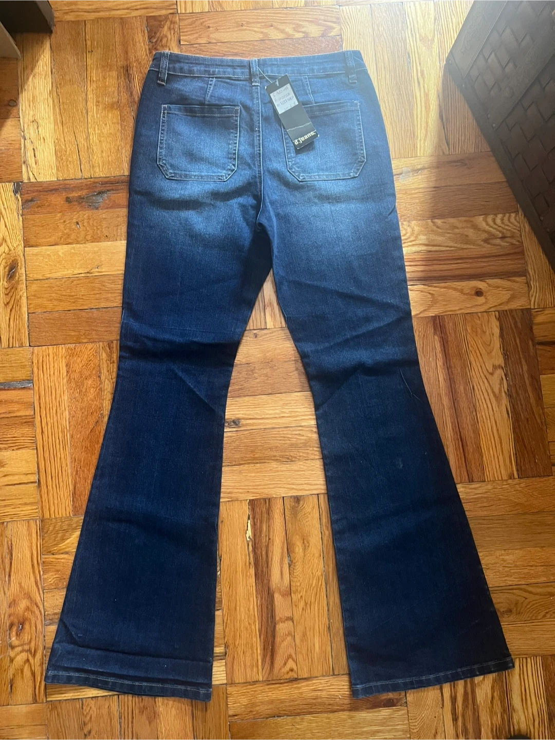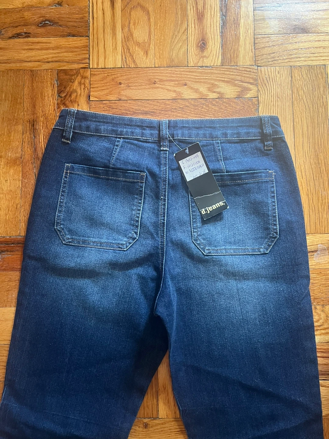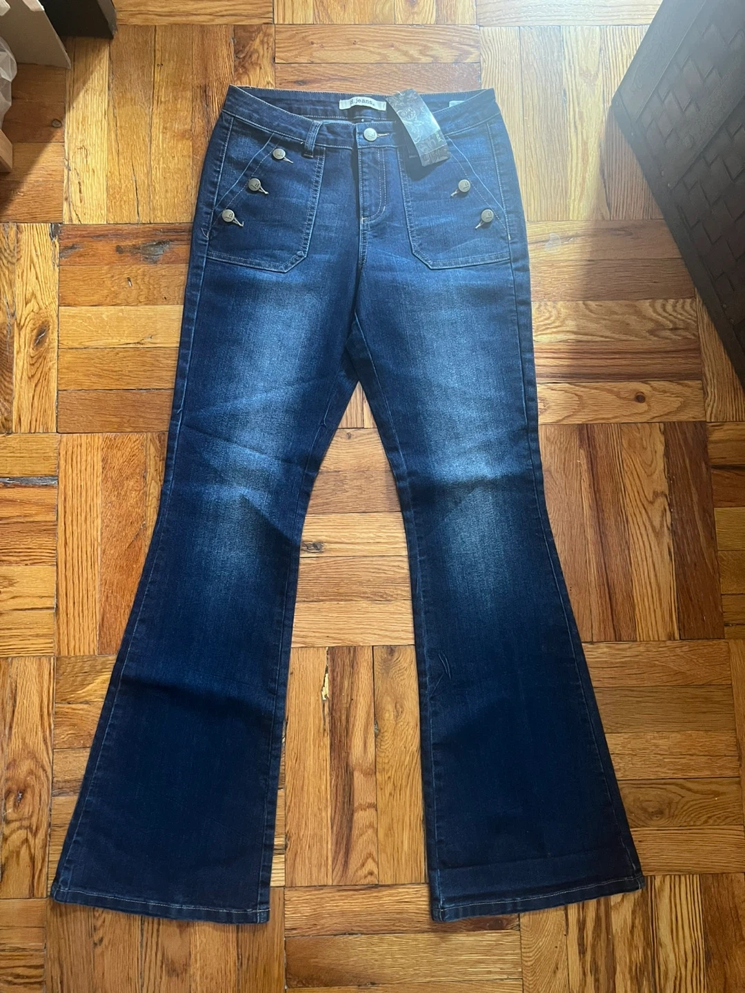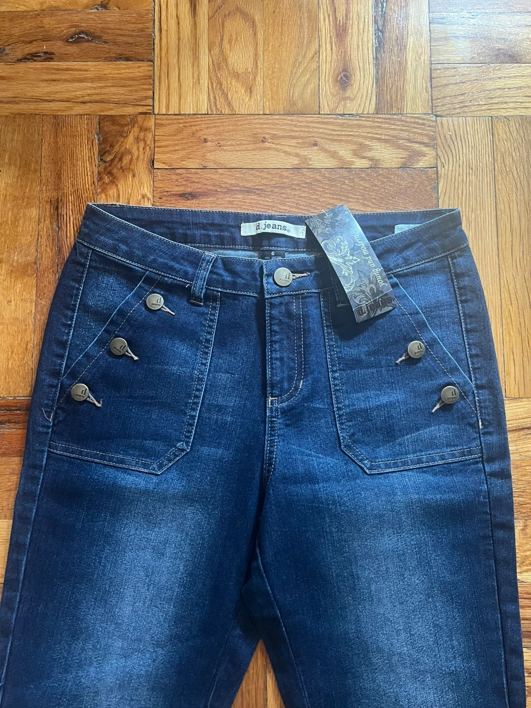 These are D. Jeans women's flare jeans in a size 6. They're a dark wash with button accents on the front pockets. Made from denim.