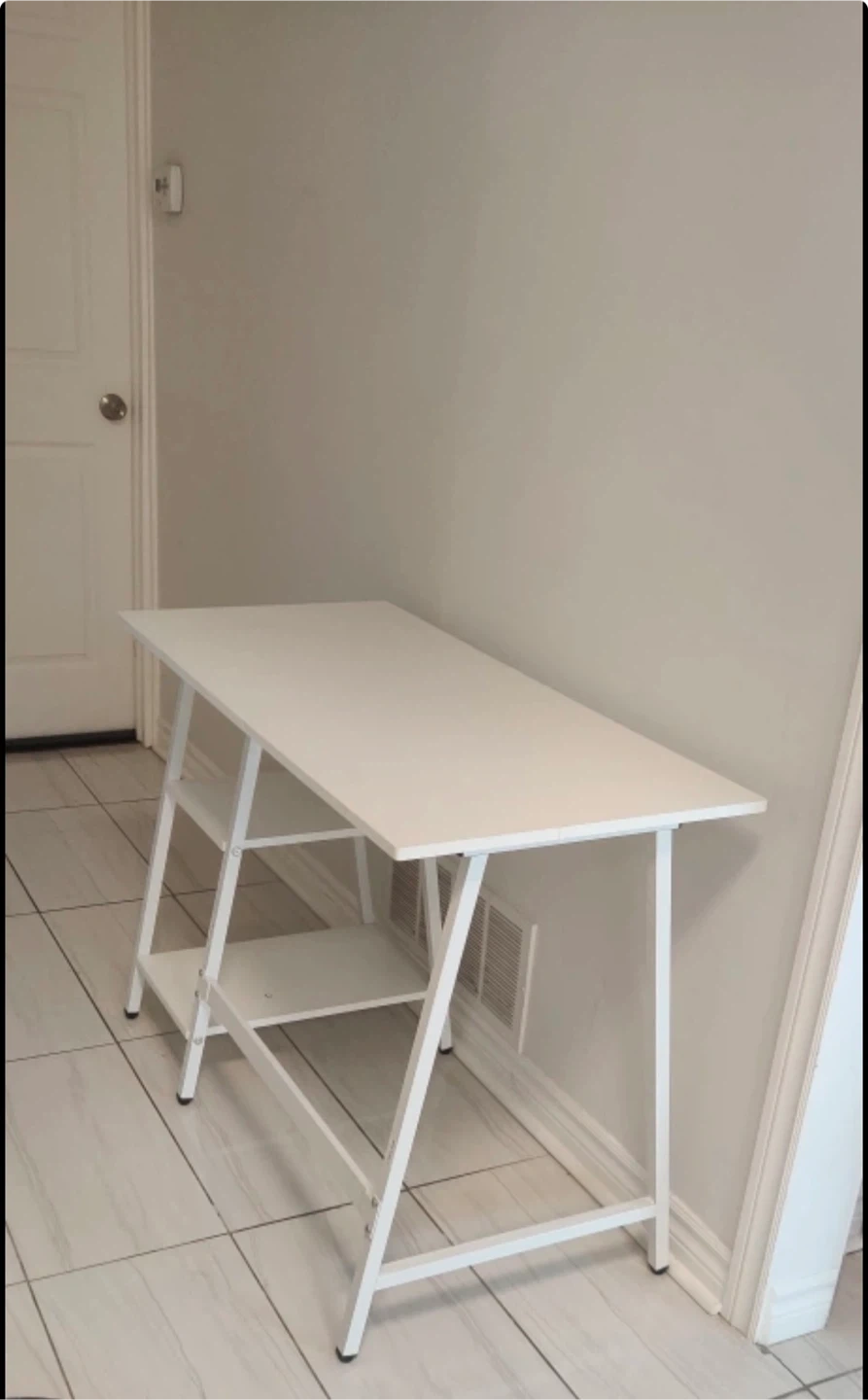 White metal frame desk with two white shelves. It's great for a workspace or study area. Simple and functional design.