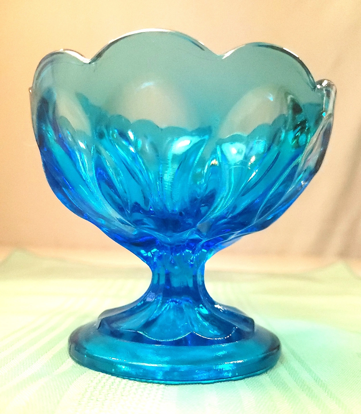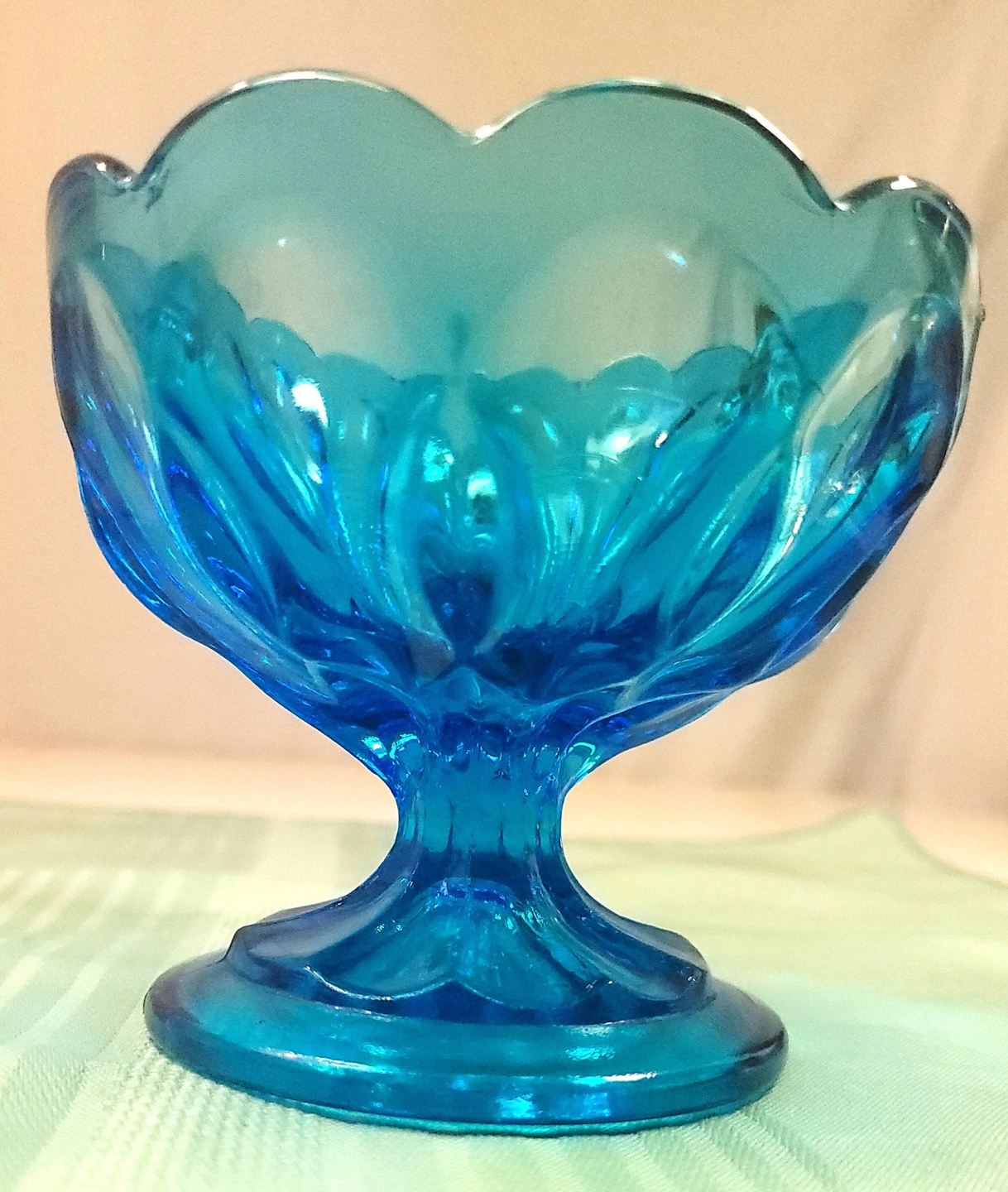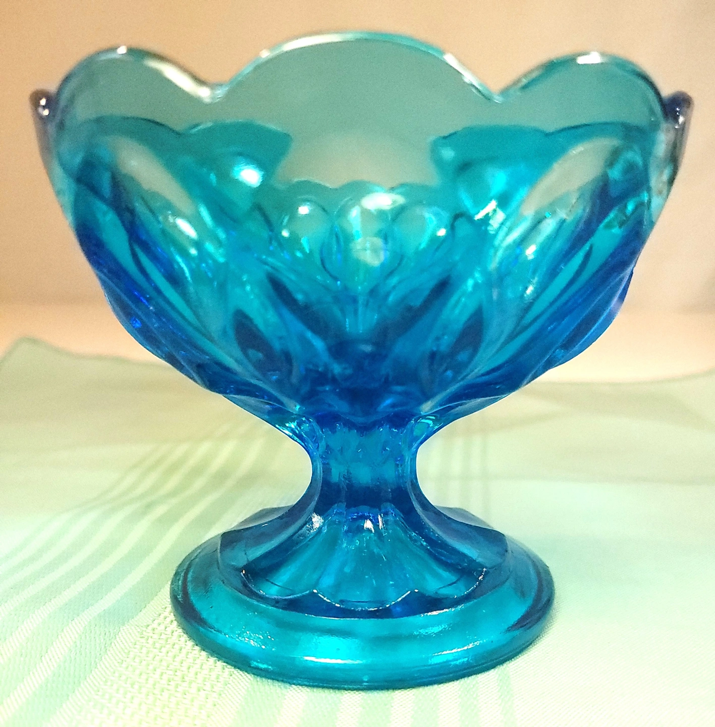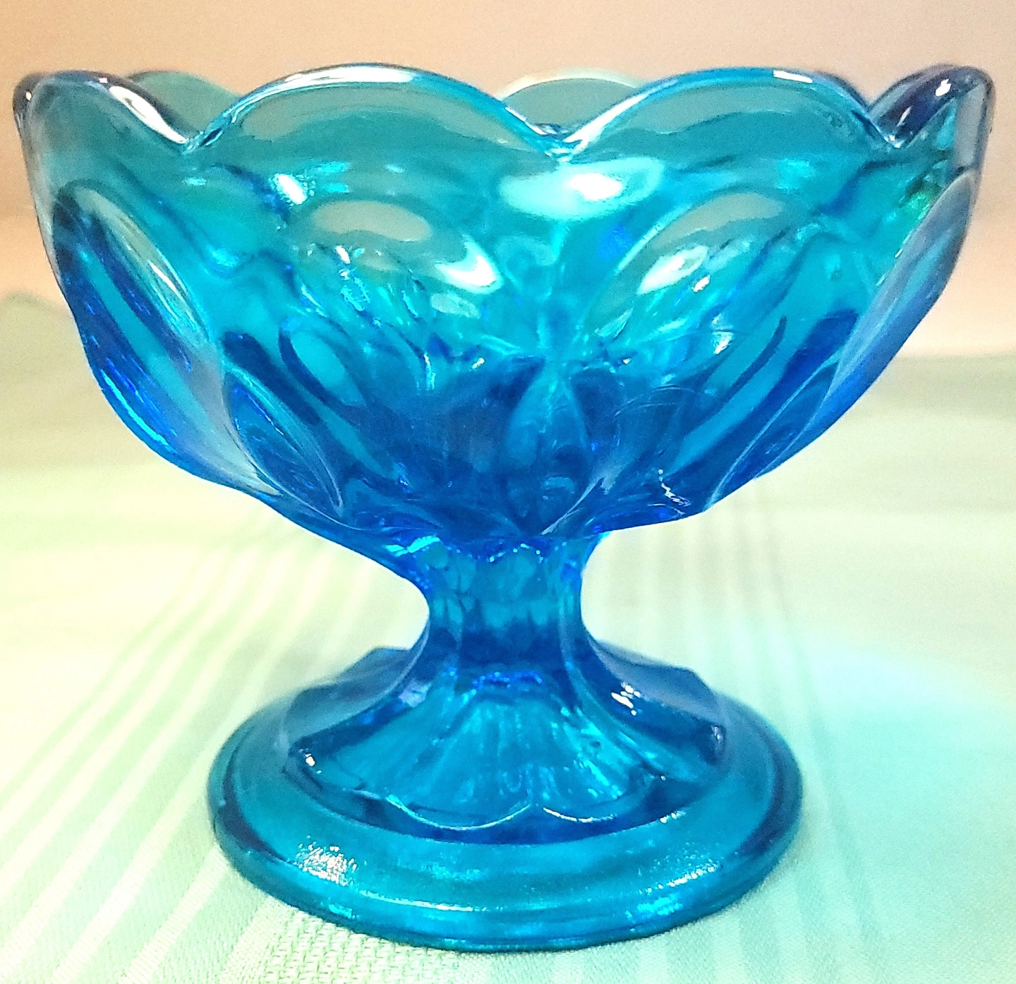 This striking Horizon Blue pedestal dish was manufactured by the Indiana Glass Company. Featuring the elegant Teardrop pattern, this piece is characterized by its scalloped rim and the distinctive teardrop-shaped indentations that circle the bowl and base. This specific colorway was a limited production from the early 1970s, making it a sought-after addition for collectors of mid-century colorful glassware.