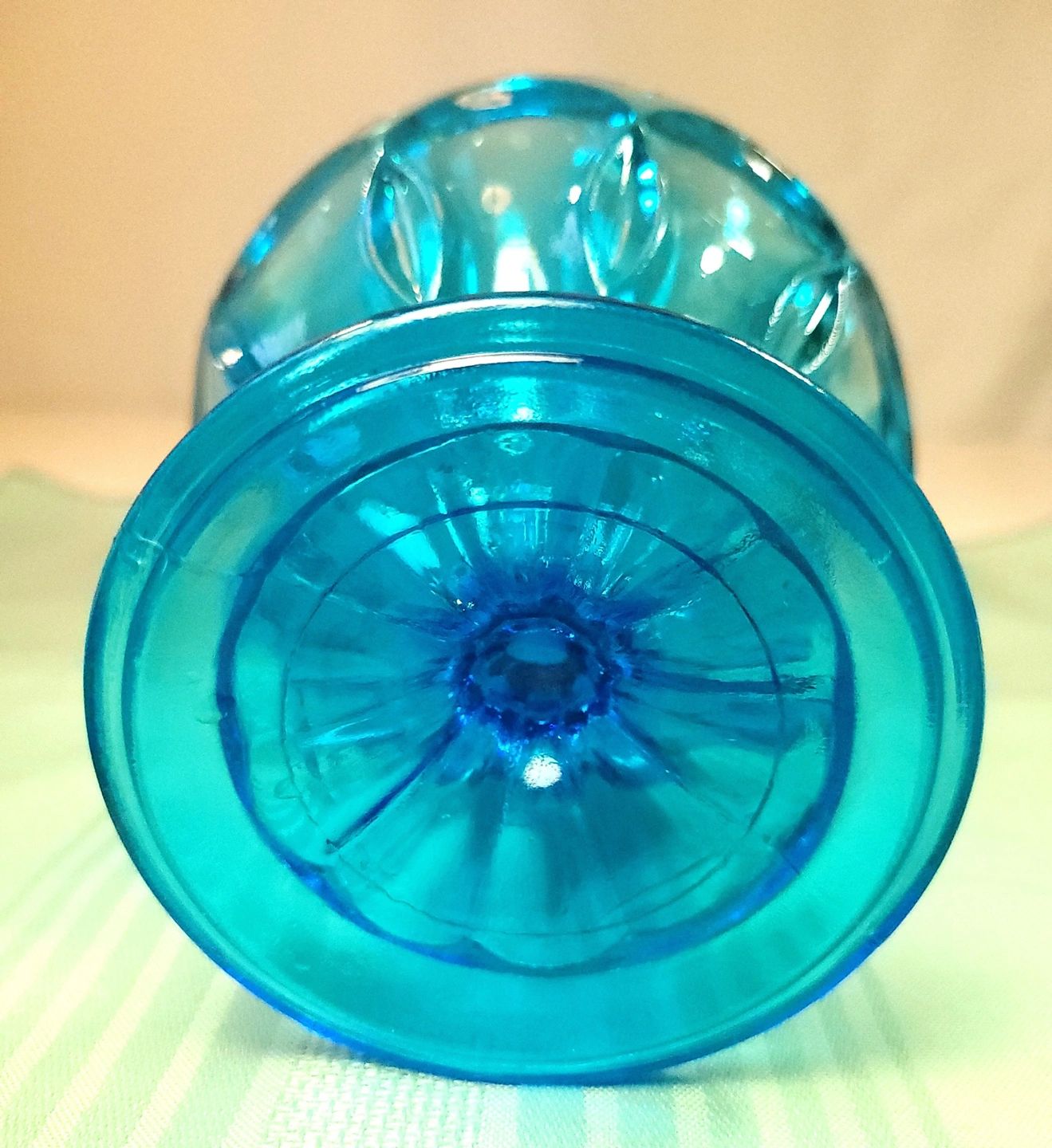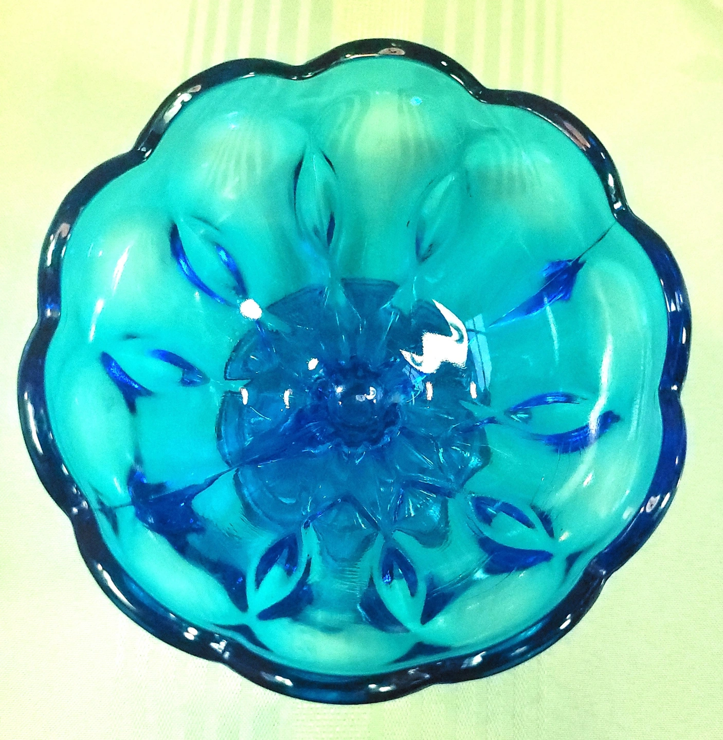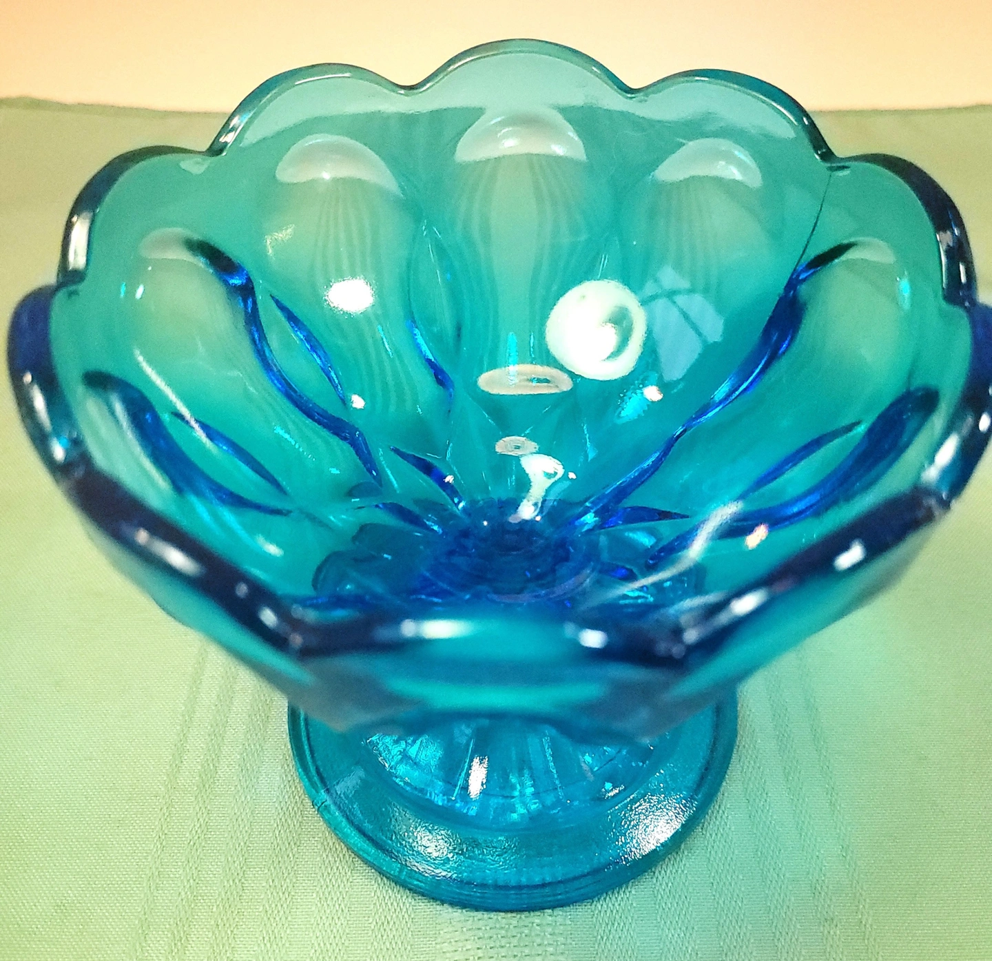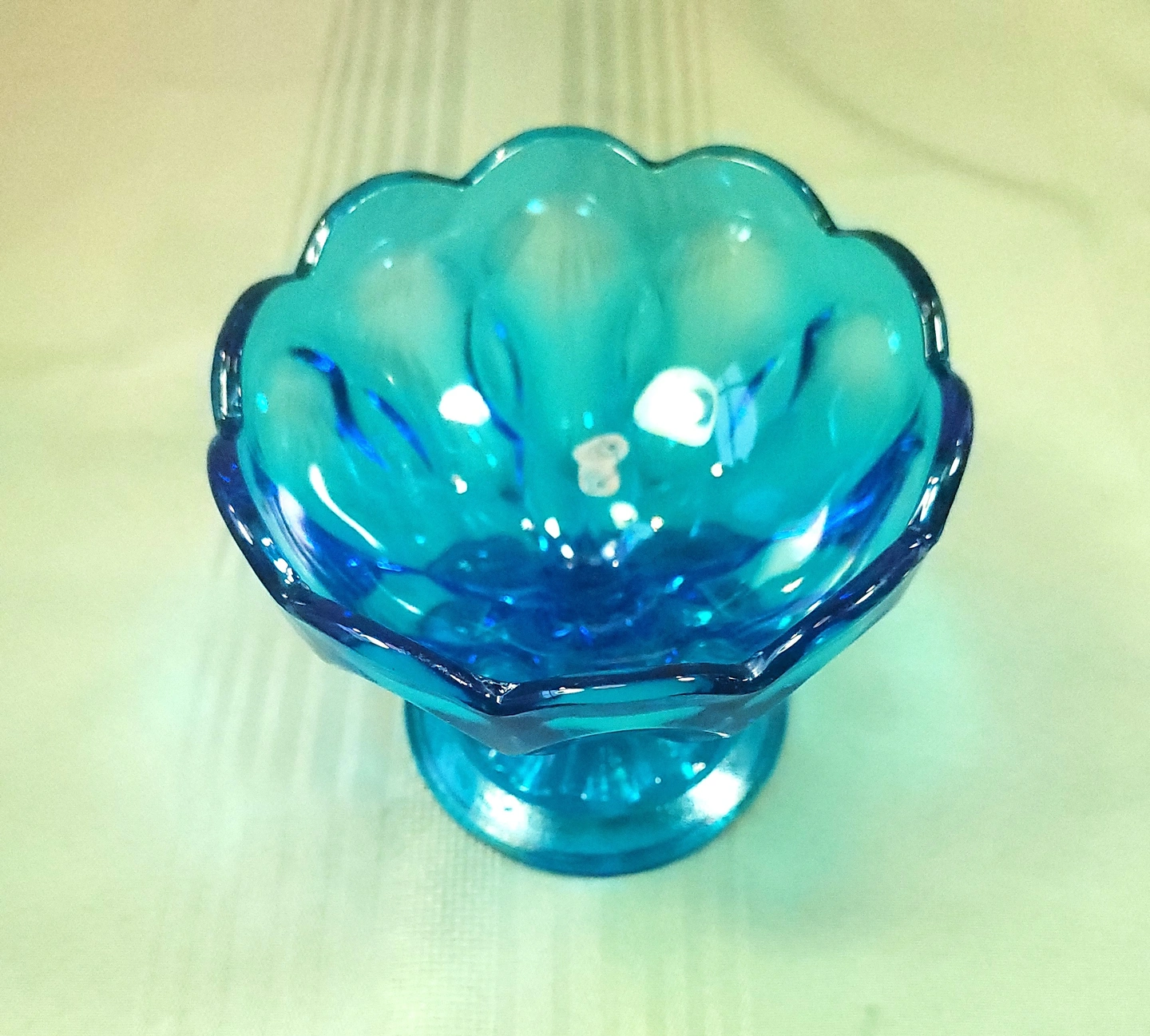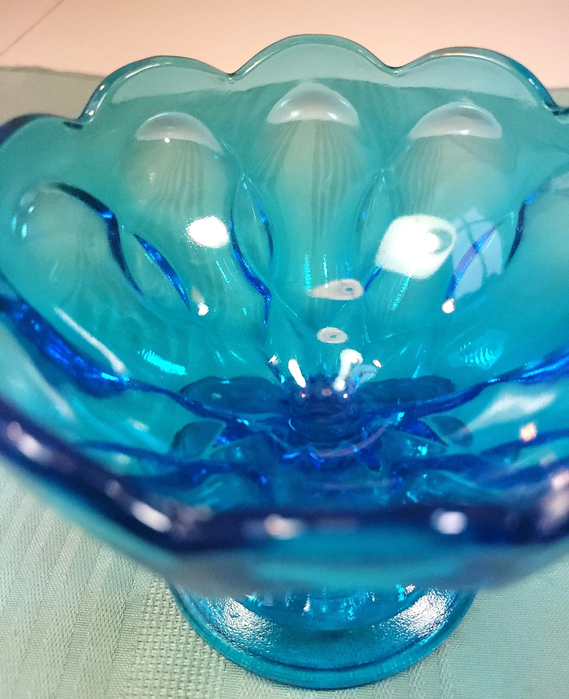 This striking Horizon Blue pedestal dish was manufactured by the Indiana Glass Company. Featuring the elegant Teardrop pattern, this piece is characterized by its scalloped rim and the distinctive teardrop-shaped indentations that circle the bowl and base. This specific colorway was a limited production from the early 1970s, making it a sought-after addition for collectors of mid-century colorful glassware.