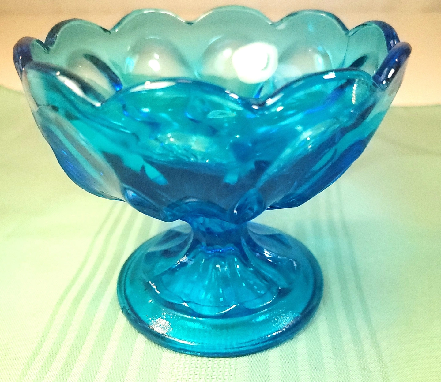 The vibrant aqua-blue pressed glass catches light beautifully, making it an ideal choice for serving desserts, sherbet, or as a stand-alone decorative accent.