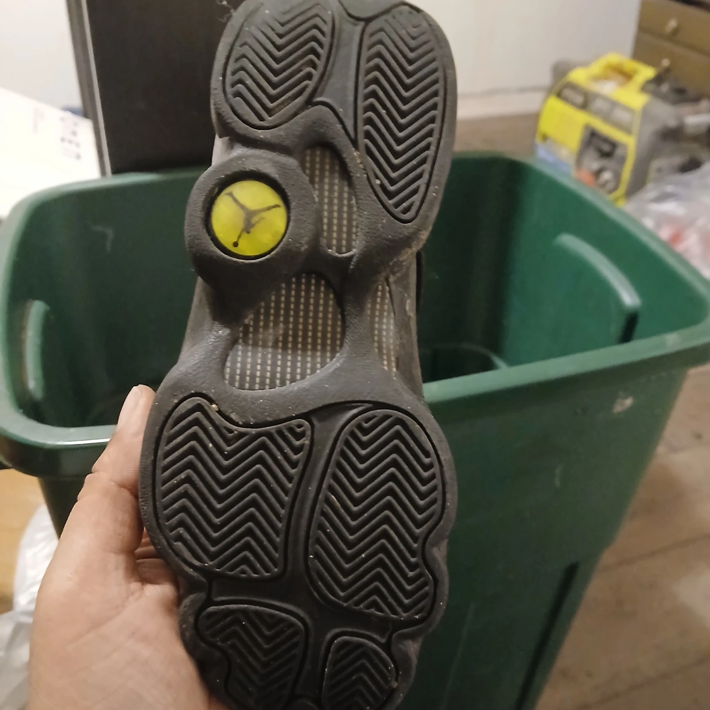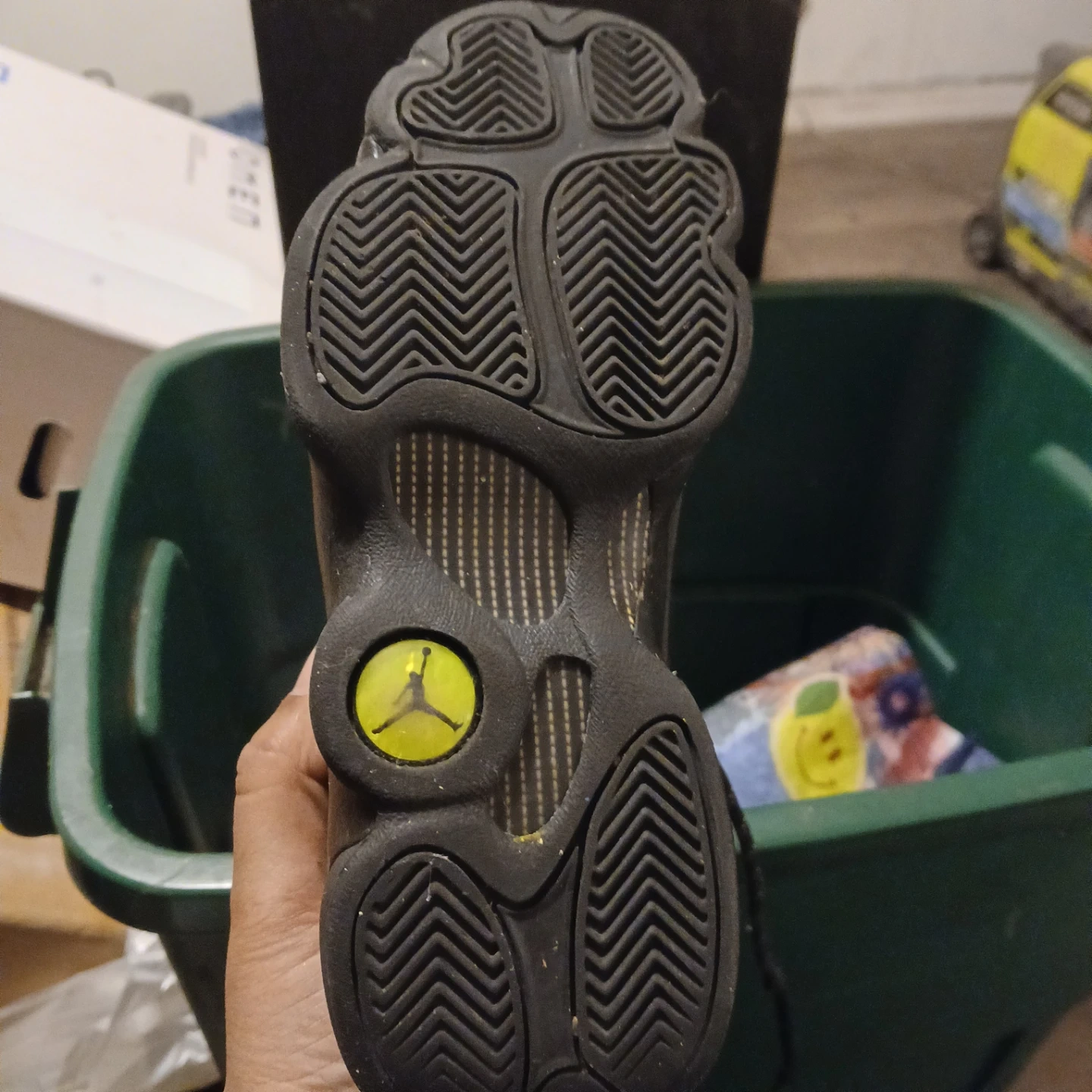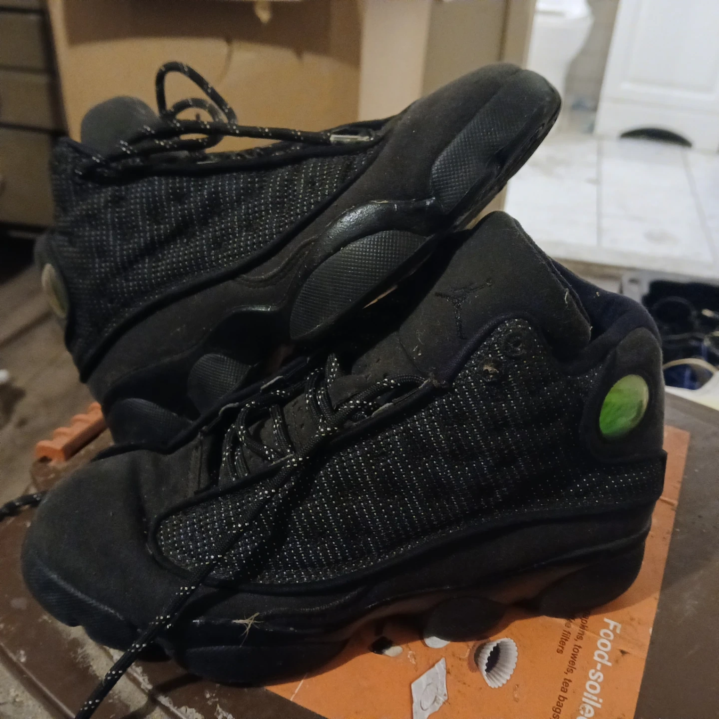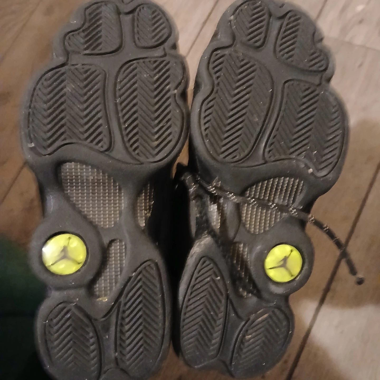 Selling a pair of used Air Jordan 13 Retro sneakers in black and green. They show signs of wear, as seen in the pictures, but still have plenty of life left!