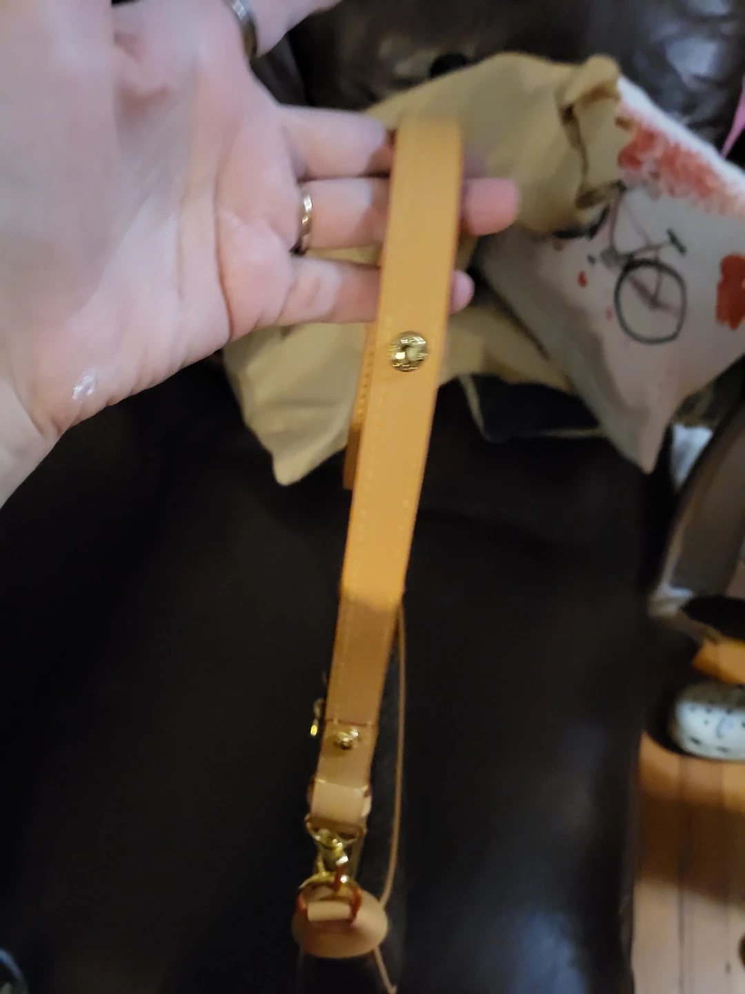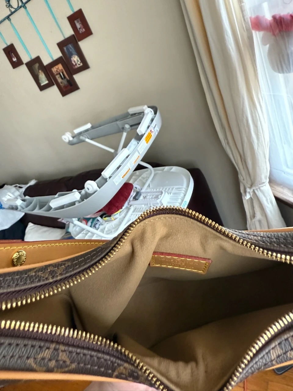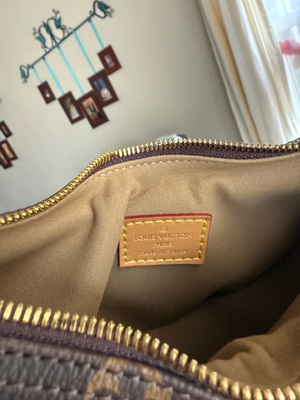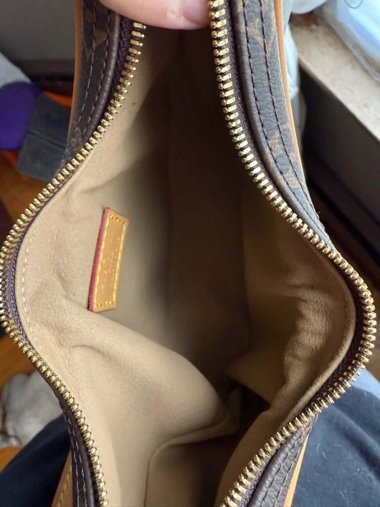 This is a Louis Vuitton Crescent PM handbag. It's made in France with the iconic monogram canvas and tan leather trim. This bag features a zip-top closure and a leather lining.