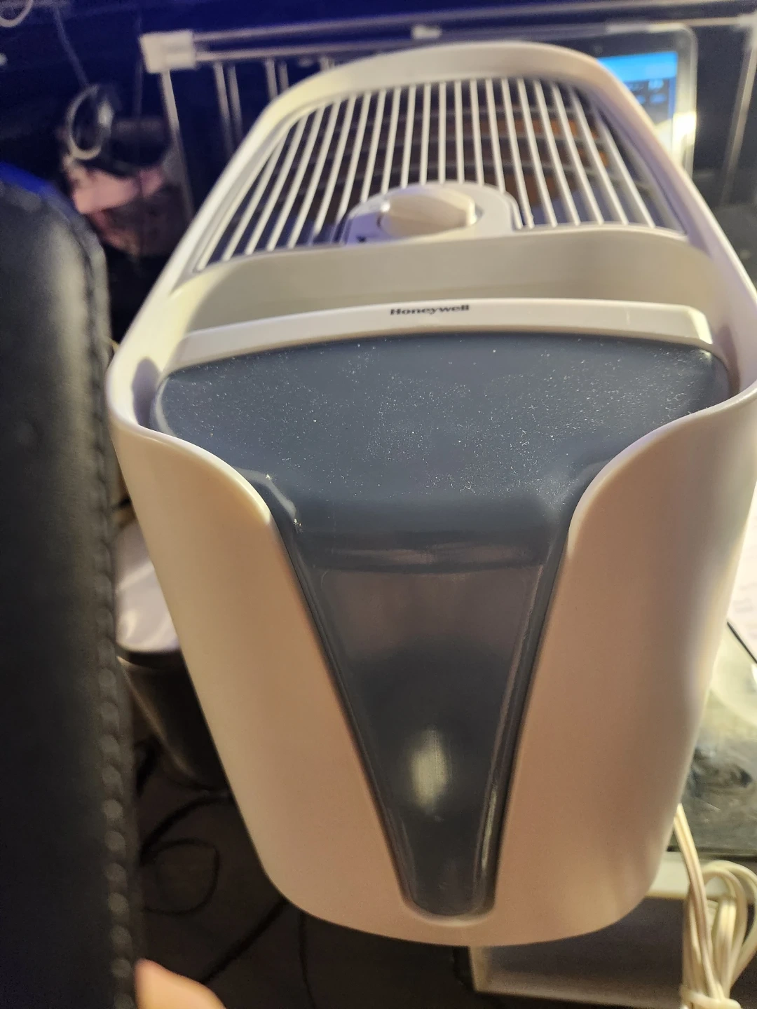 This Honeywell personal air cooler is beige and grey. It has a rotary dial for speed control and a translucent water reservoir. It's perfect for keeping your personal space cool and comfortable.