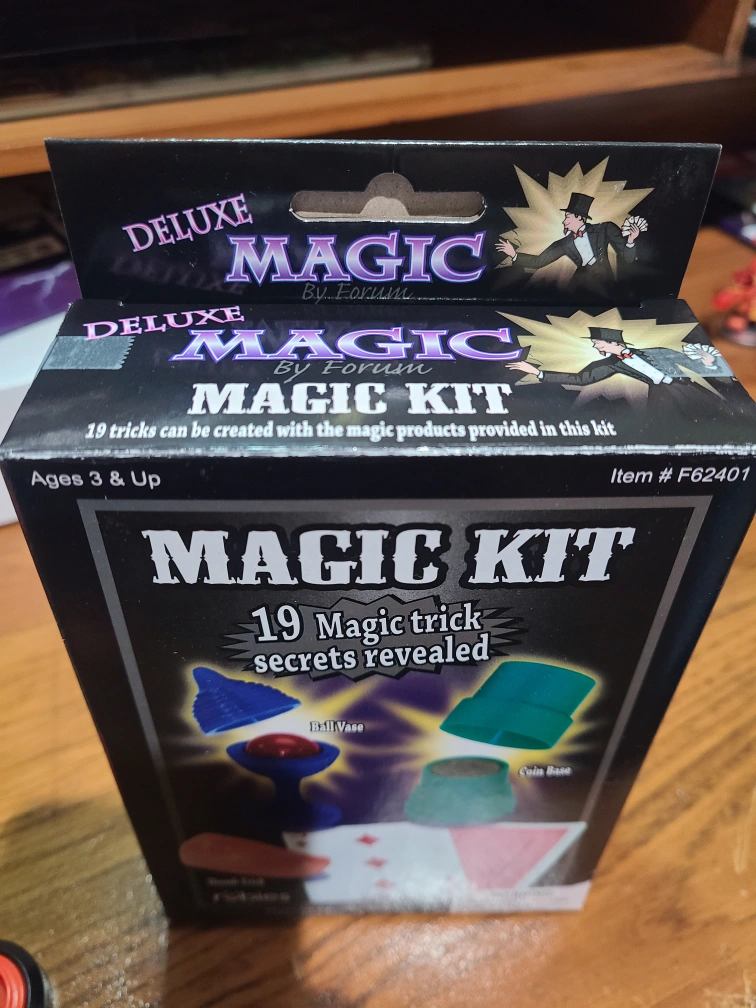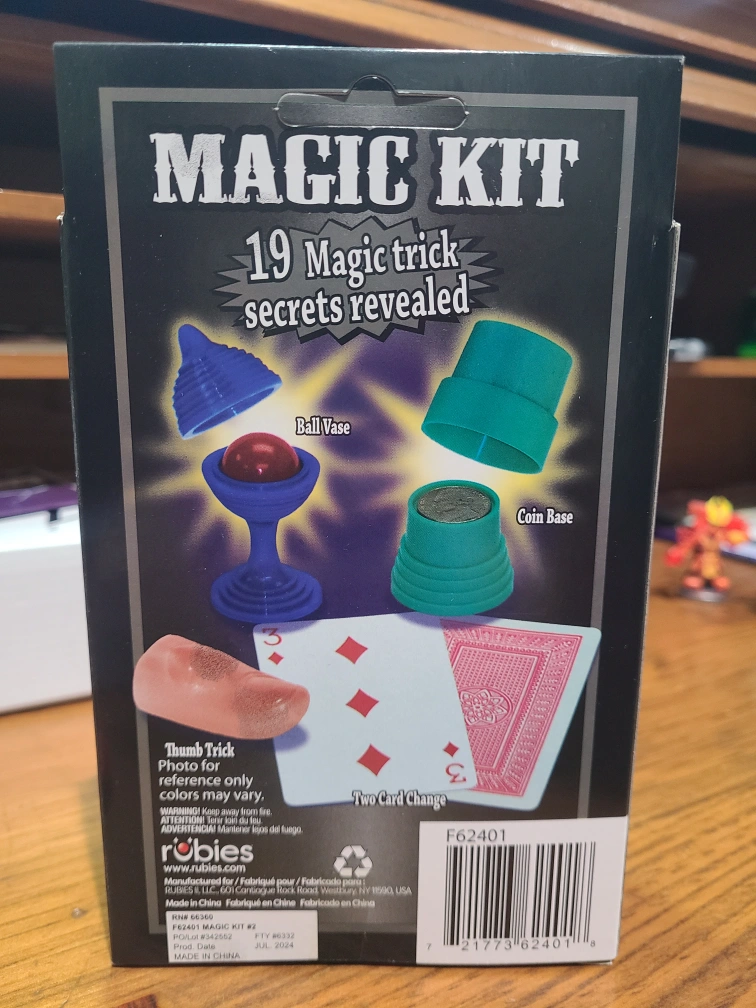 This magic kit includes 19 magic trick secrets revealed. It's recommended for ages 3 and up. Learn cool illusions like the Ball Vase, Thumb Trick, and Two Card Change!