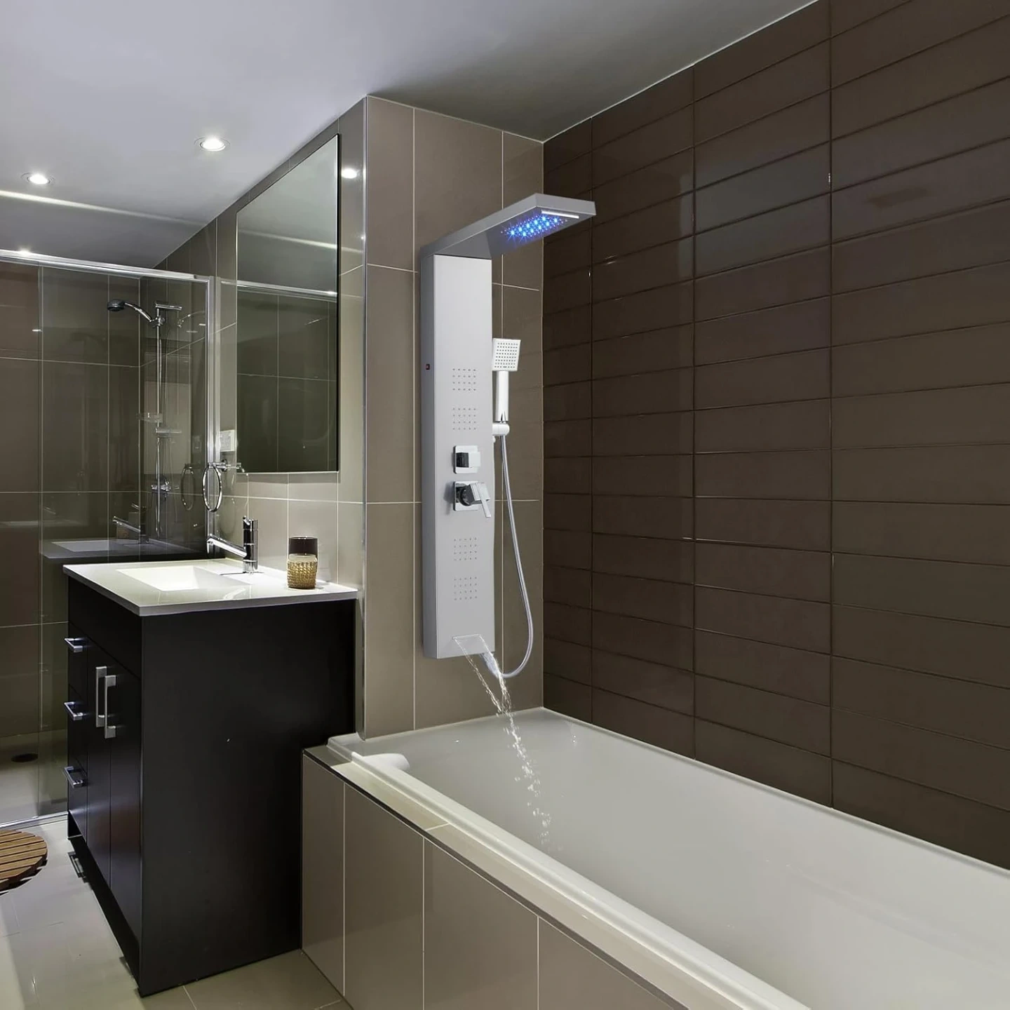 Shower, Bathroom, Bath, Tub, Reno, Bathtub, Water, Tower, Massage, Rainfall, Waterfall, Jets, LED, Lights, Column, Valve, Wand, Spray, Renovation, Temperature, Pressure, Balanced, kit, system, trim