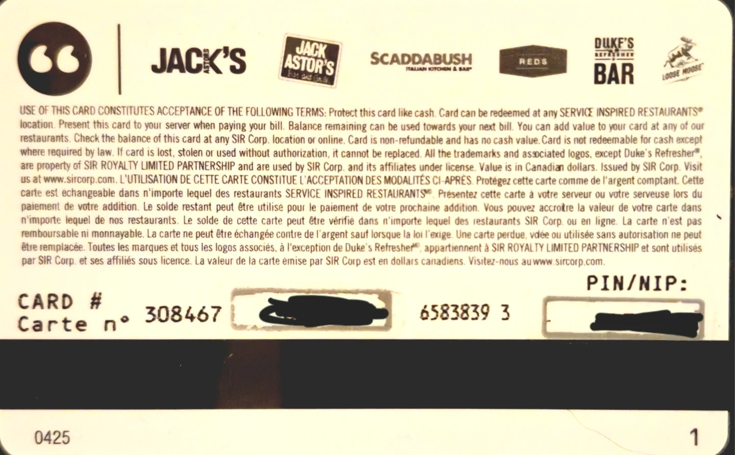 I am selling a Scaddabush Italian Kitchen & Bar gift card with a balance of $50 CAD. This gift card can be used at any Scaddabush location in Canada. It's a fantastic way to enjoy a delicious Italian meal! This is a new card that hasn't been used.