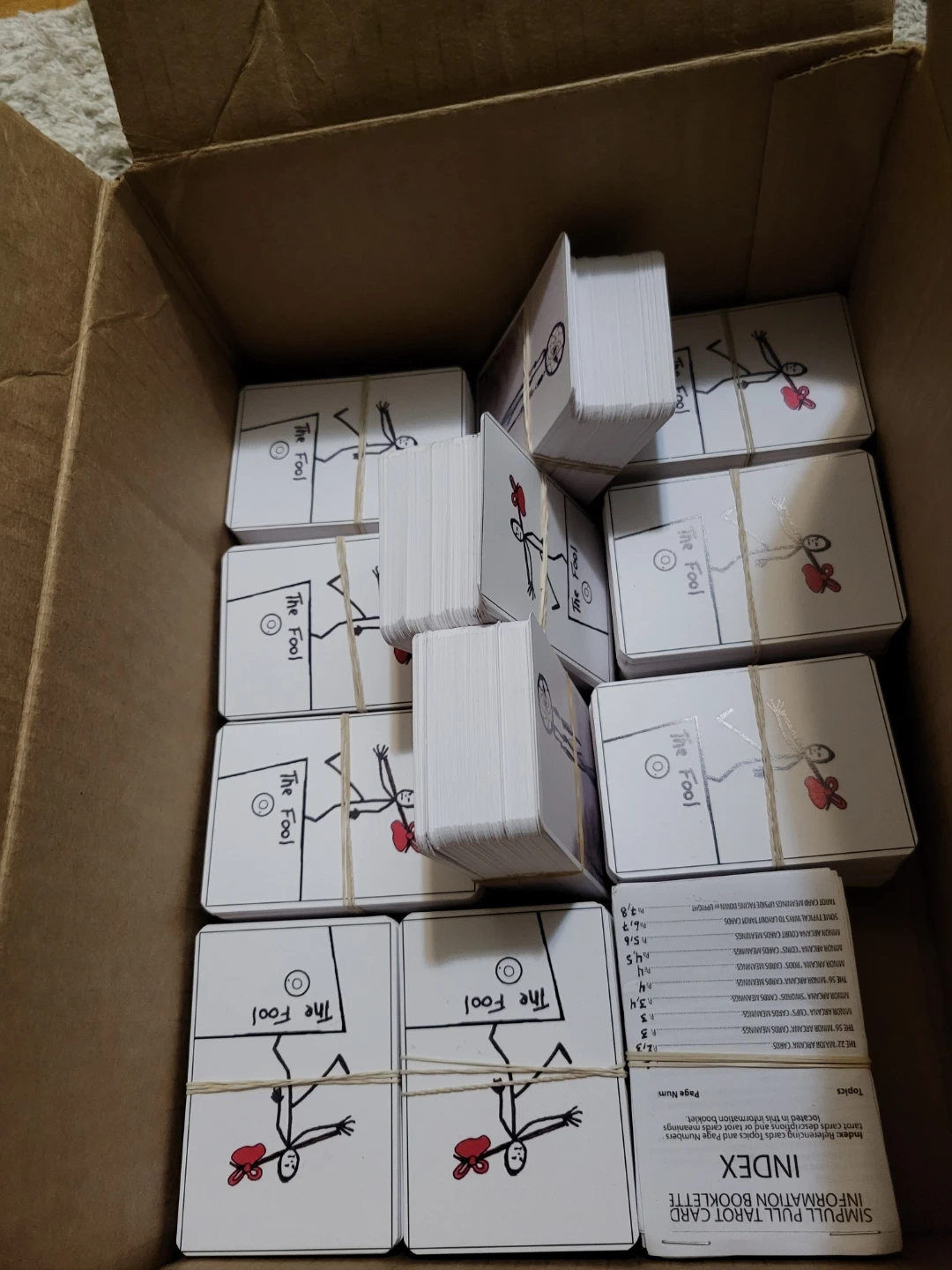 A bulk lot of tarot cards featuring 'The Fool' card. Each deck is bound with twine and includes an information booklet with card descriptions and page numbers. Some decks have a red heart detail.