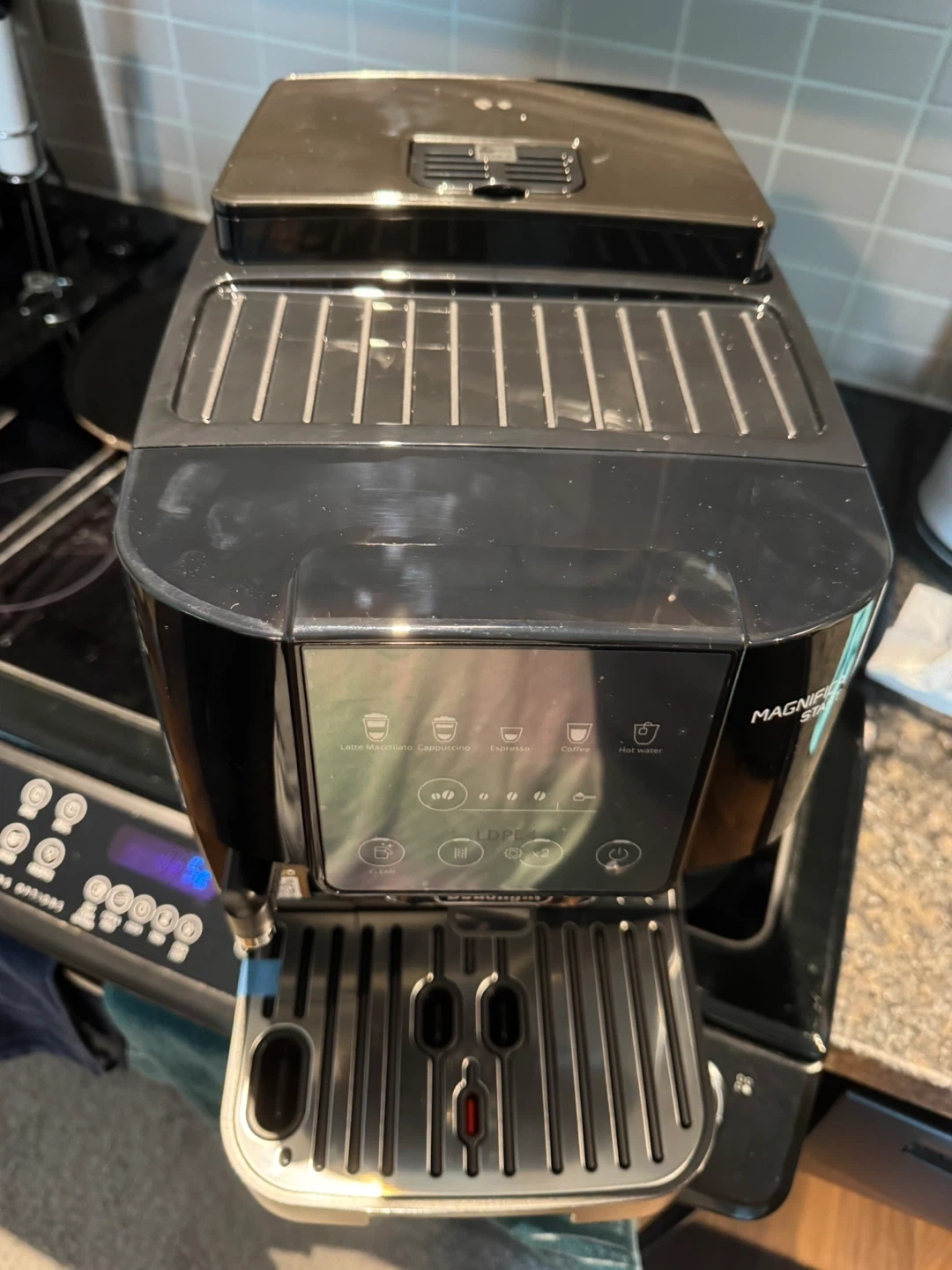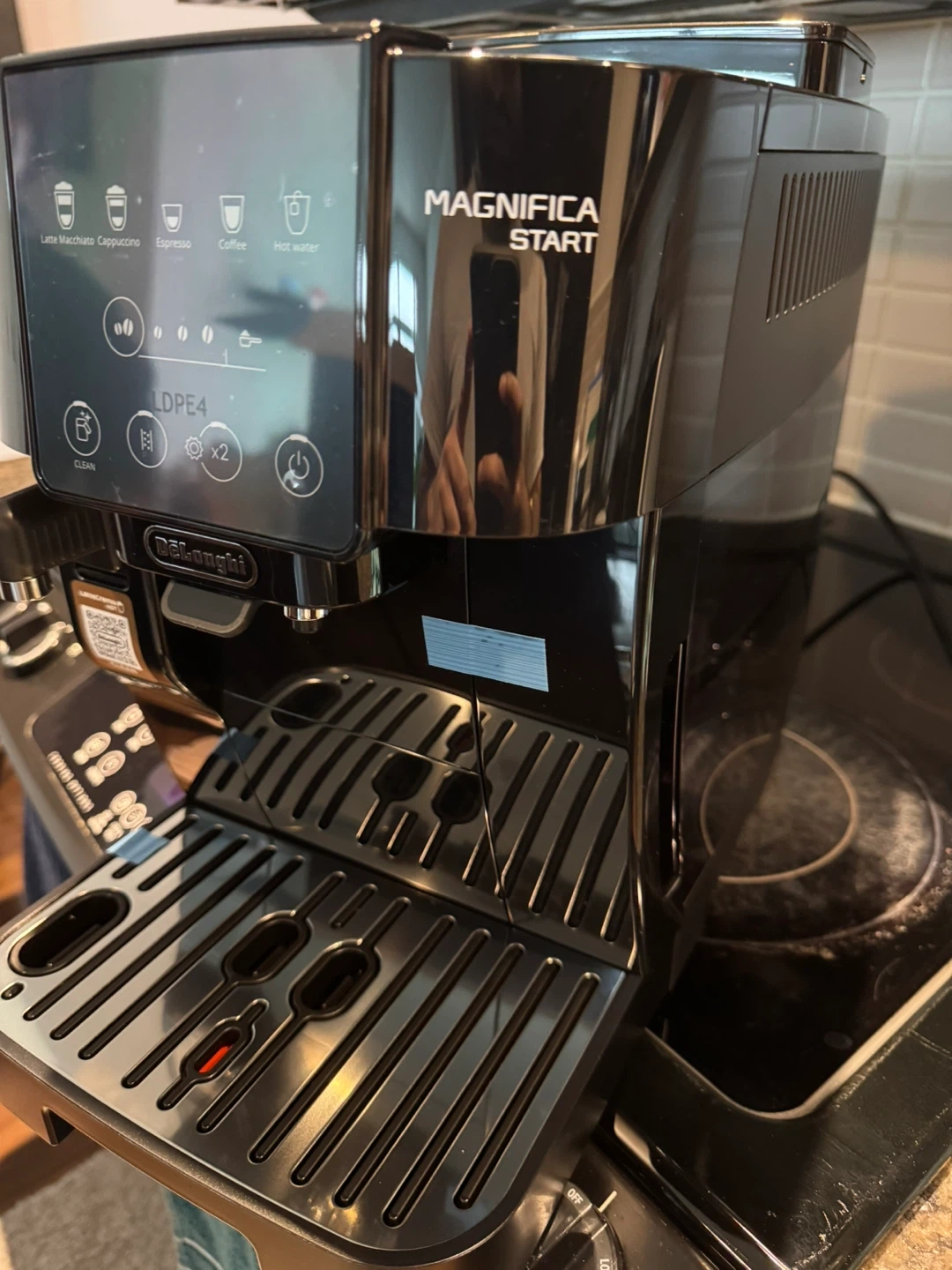 This De'Longhi Magnifica Start espresso machine brews a variety of coffee drinks. It includes settings for Latte Macchiato, Espresso, Coffee, and Hot Water. The machine features a sleek black design, perfect for any kitchen counter.