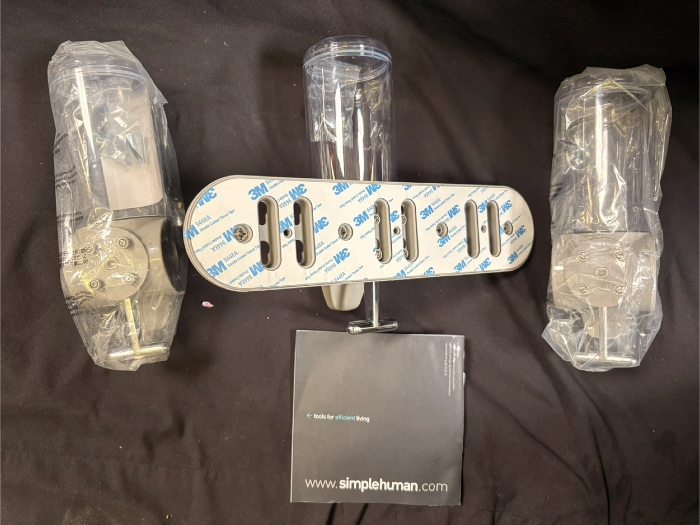 This is a Simplehuman 3-chamber soap dispenser designed for wall mounting. It's great for organizing your shower space with shampoo, conditioner, and body wash. Includes mounting hardware for easy installation.