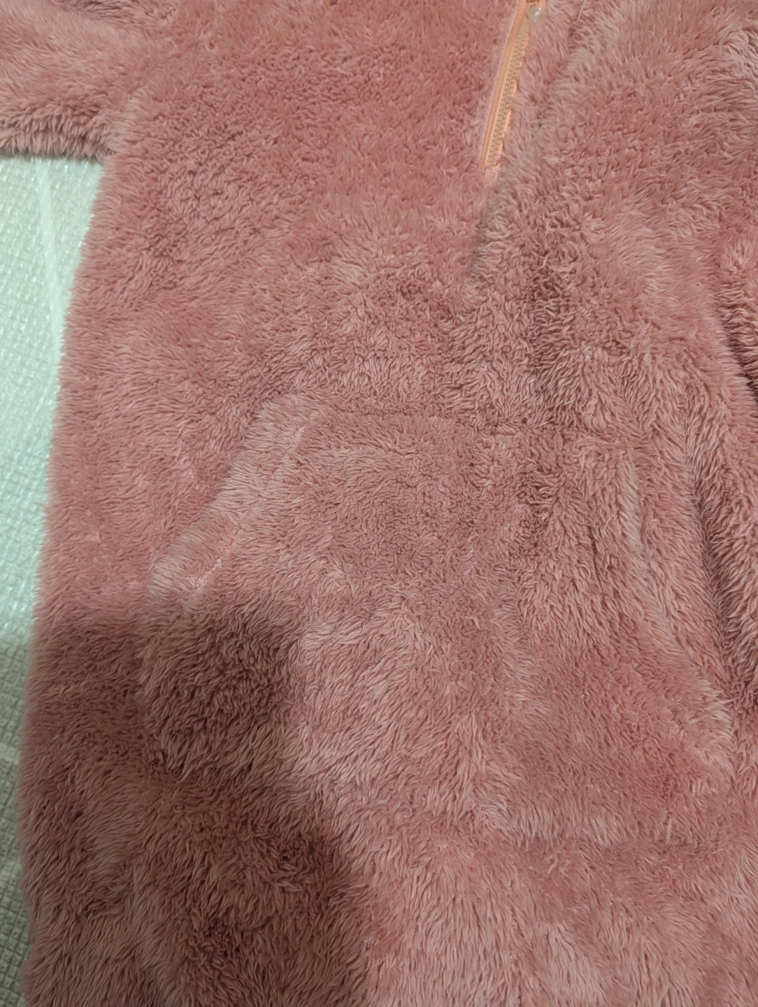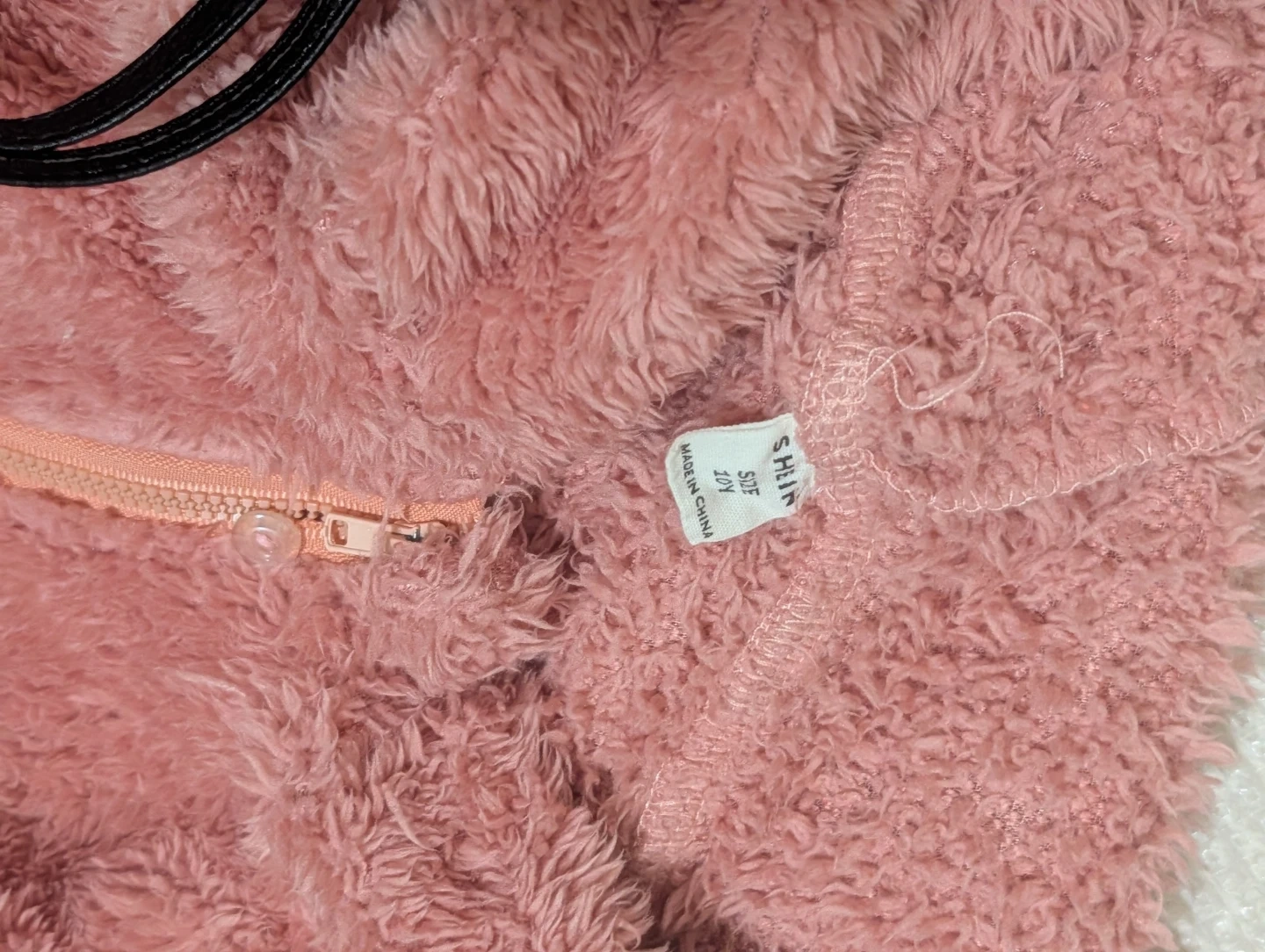 This pink fuzzy fleece hooded onesie pajamas are a kids size 10. It features a half-zip closure and a front pocket. It's made of soft, plush material perfect for cozy nights!