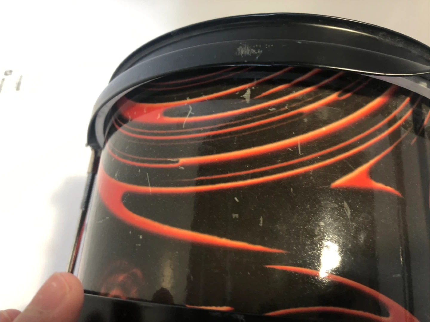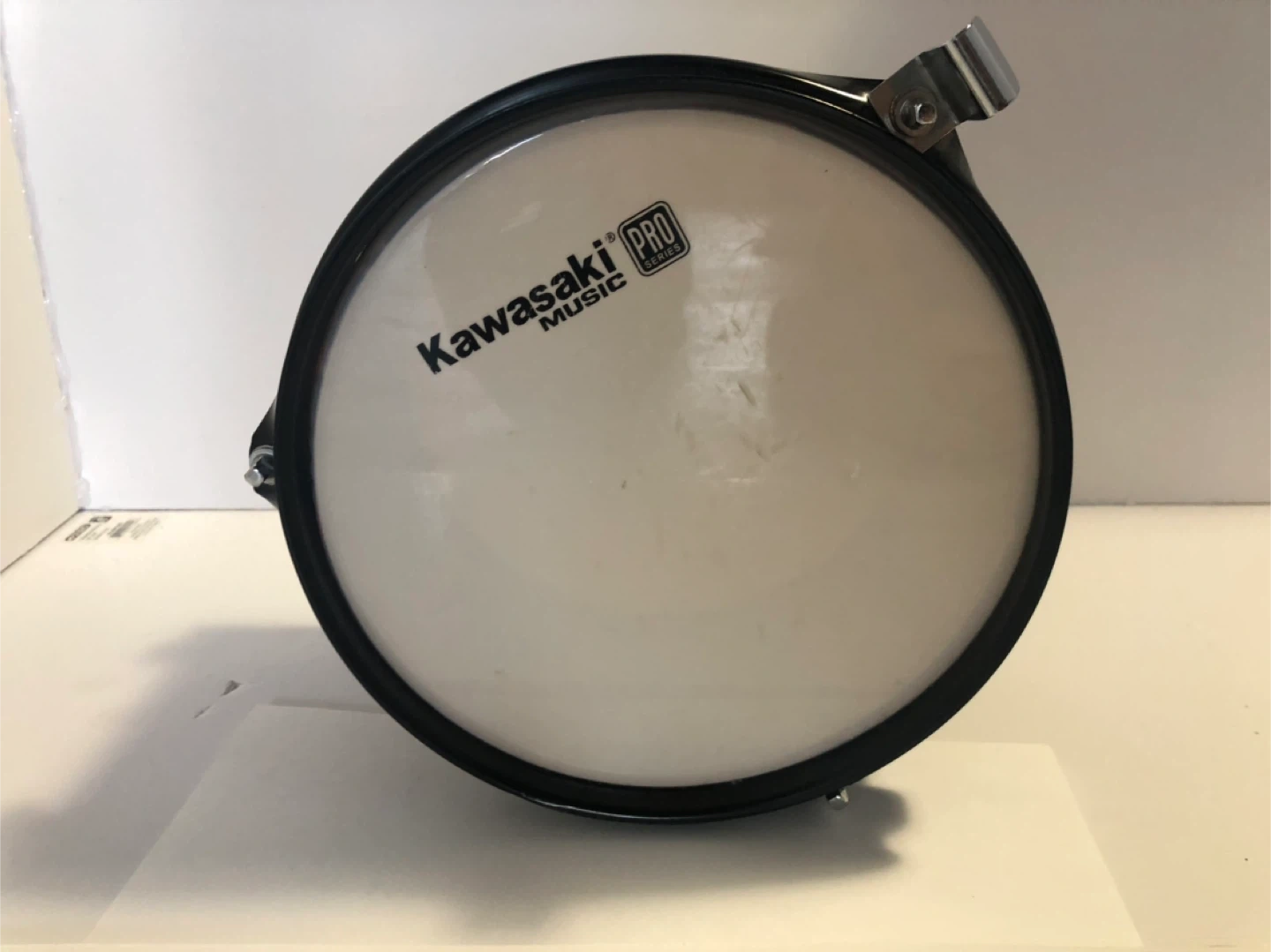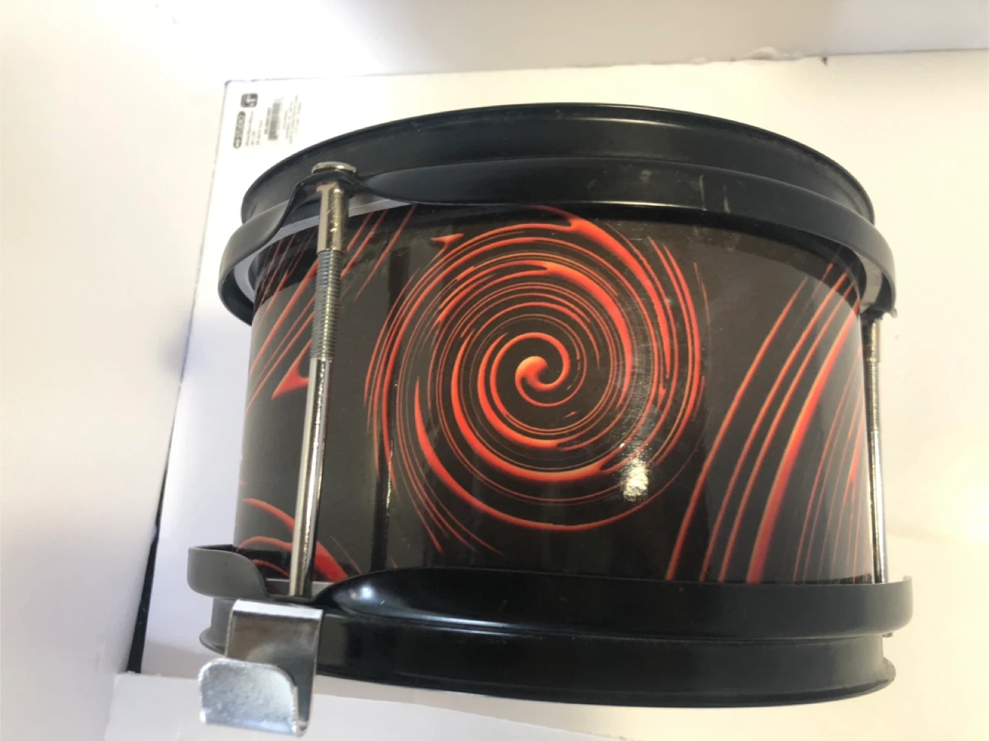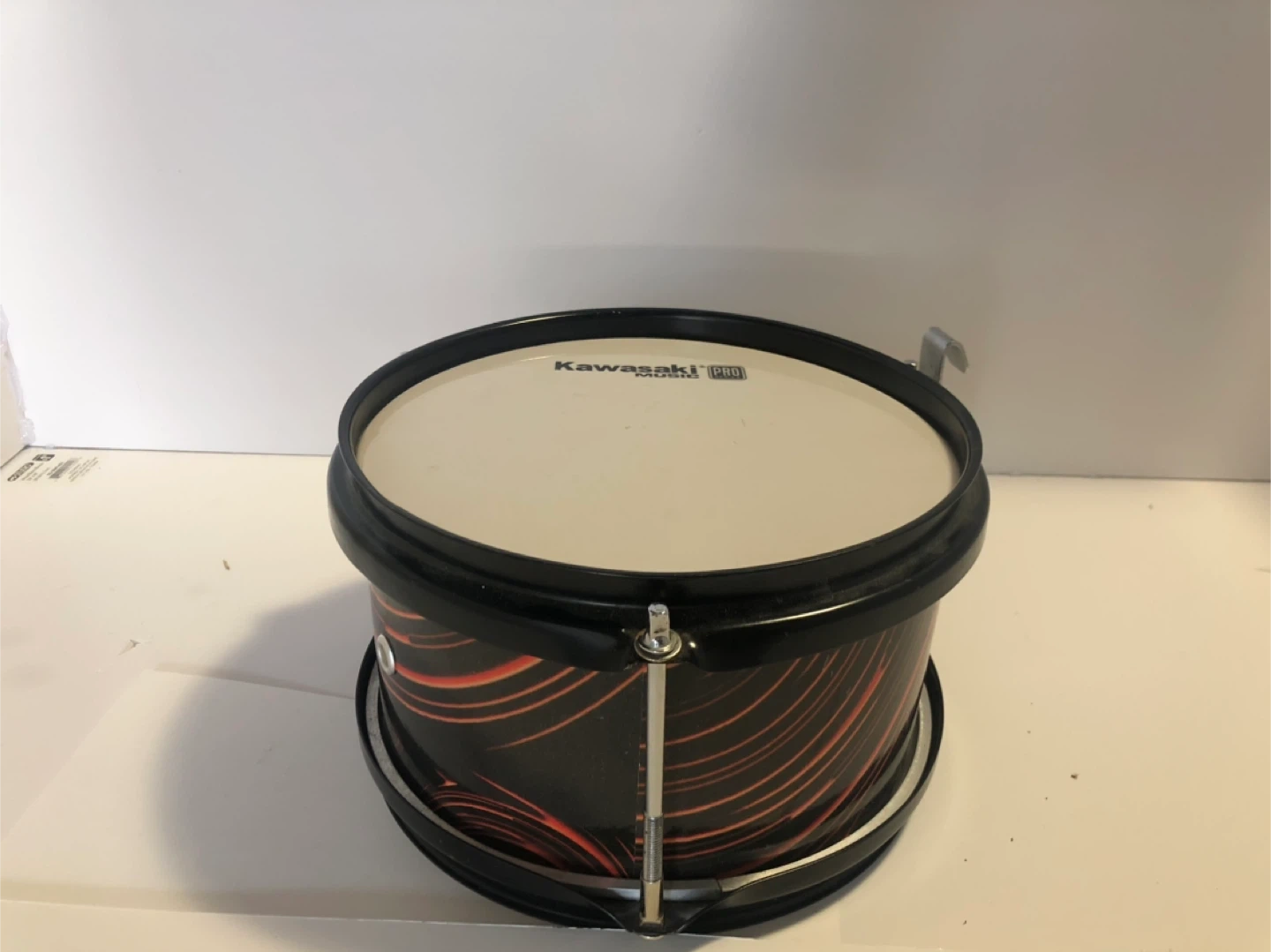 This is a Kawasaki Pro Music snare drum with a cool flame design. It's great for practicing your drumming skills. The drum has a black finish with red and orange swirling graphics.