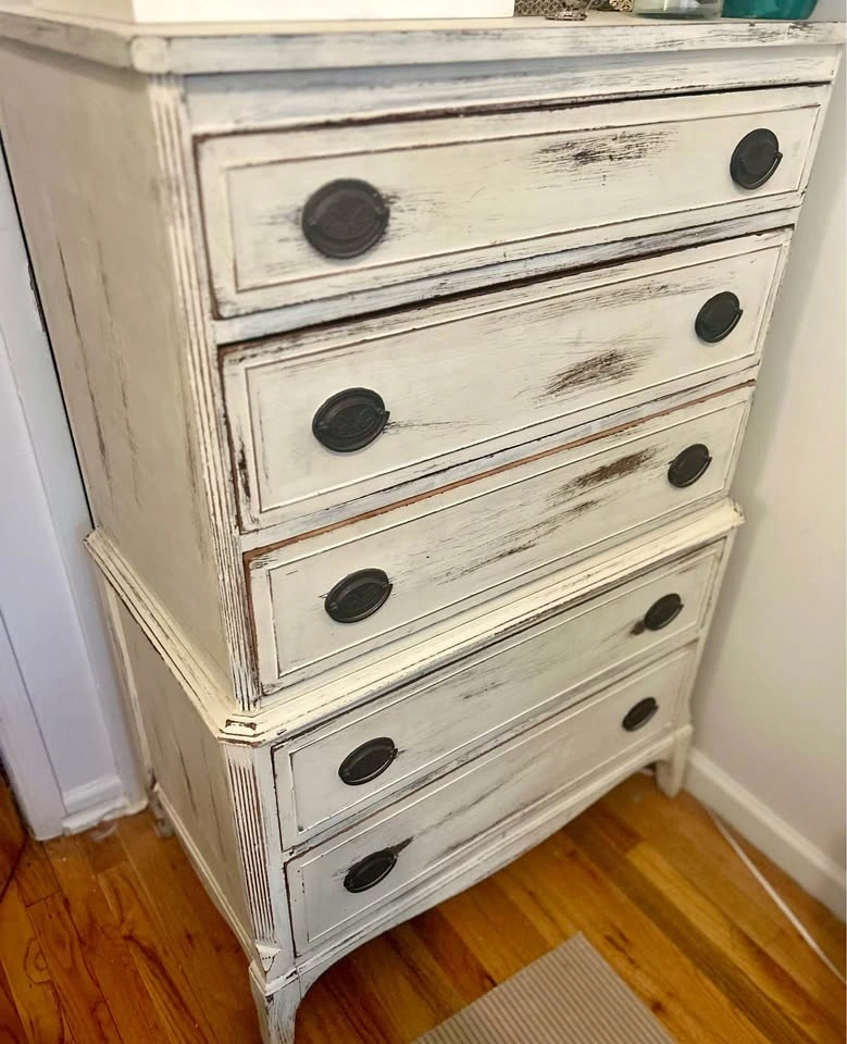 Vintage refinished farmhouse 5-drawer dresser with ample storage space. It’s in great condition with the exception of a minor chip on the corner left side on the top (see reference image).