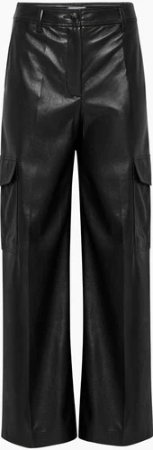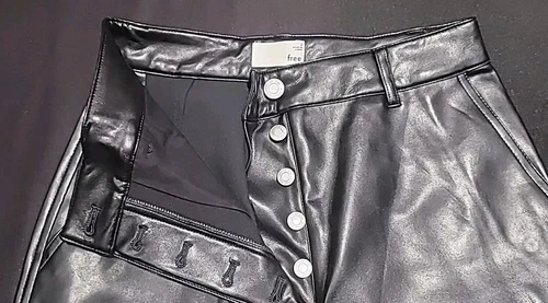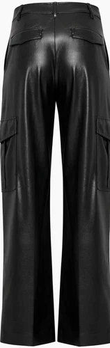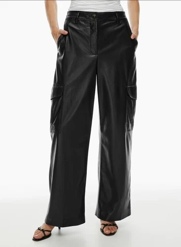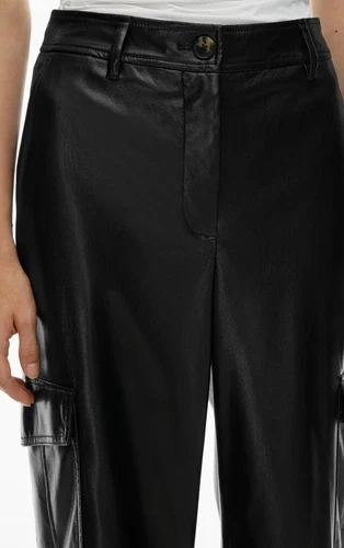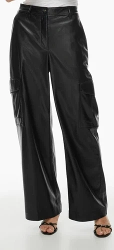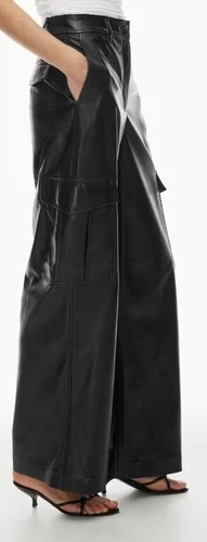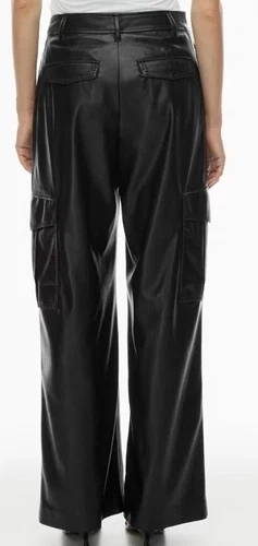 These are high-rise cargo pants with a wide leg and classic fit. They're made with our premium Stretch Vegan Leather from Japan, crafted for superior shape retention, easy care and an authentic look and feel.