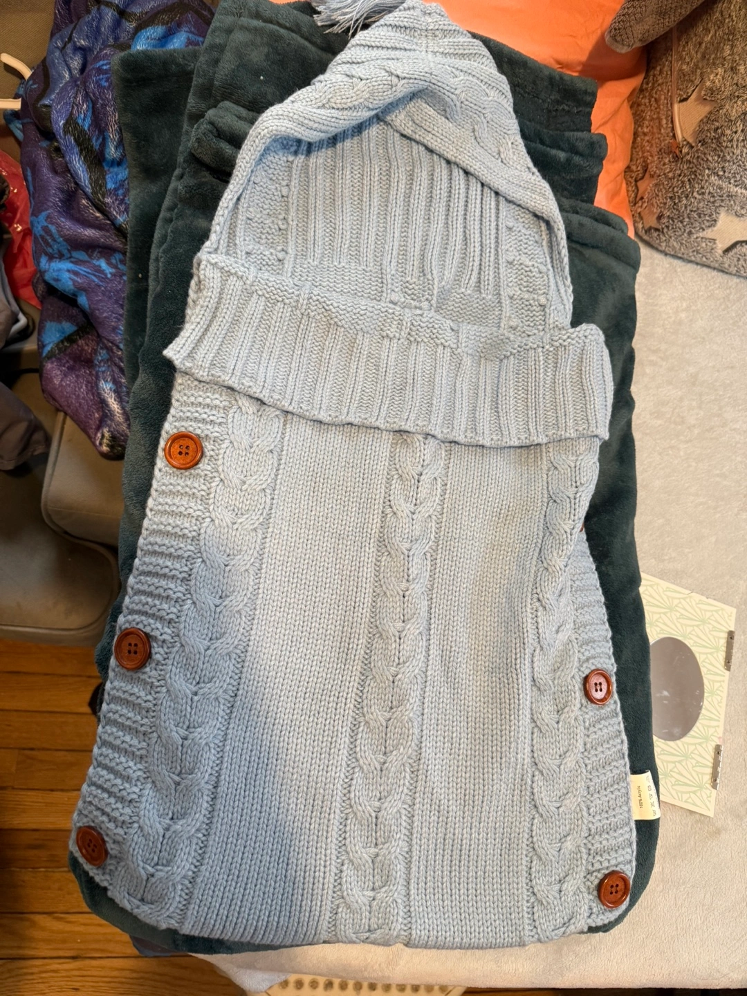 A cozy baby blue knitted bunting with a hood! It features a cable knit design and wooden buttons. Perfect for keeping your little one warm and snug