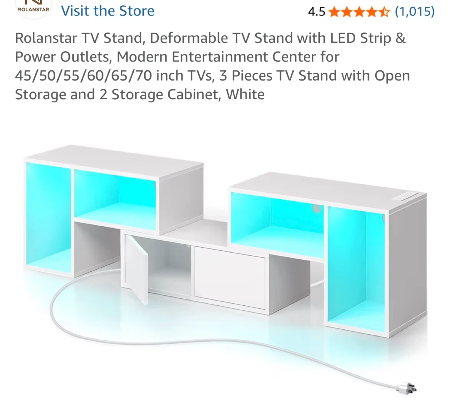 This white TV stand is designed to hold TVs up to 70 inches. It includes a built-in LED strip with multiple colour options. The unit offers open shelving and two cabinets for storage. It's a modern entertainment centre that'll fit nicely in your living room!