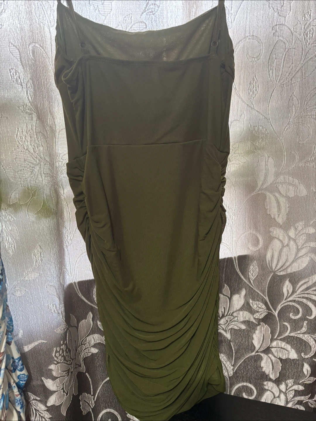 Selling an olive green ruched bodycon dress! It's in great condition and ready for a new home. The ruching detail gives it a flattering fit, perfect for a night out or special occasion