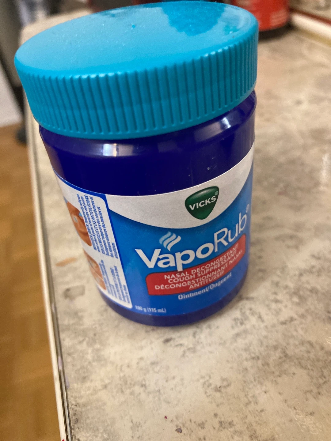Vicks VapoRub is a nasal decongestant and cough suppressant ointment. It temporarily relieves minor muscle aches and pains. This ointment is 100g (115 mL).