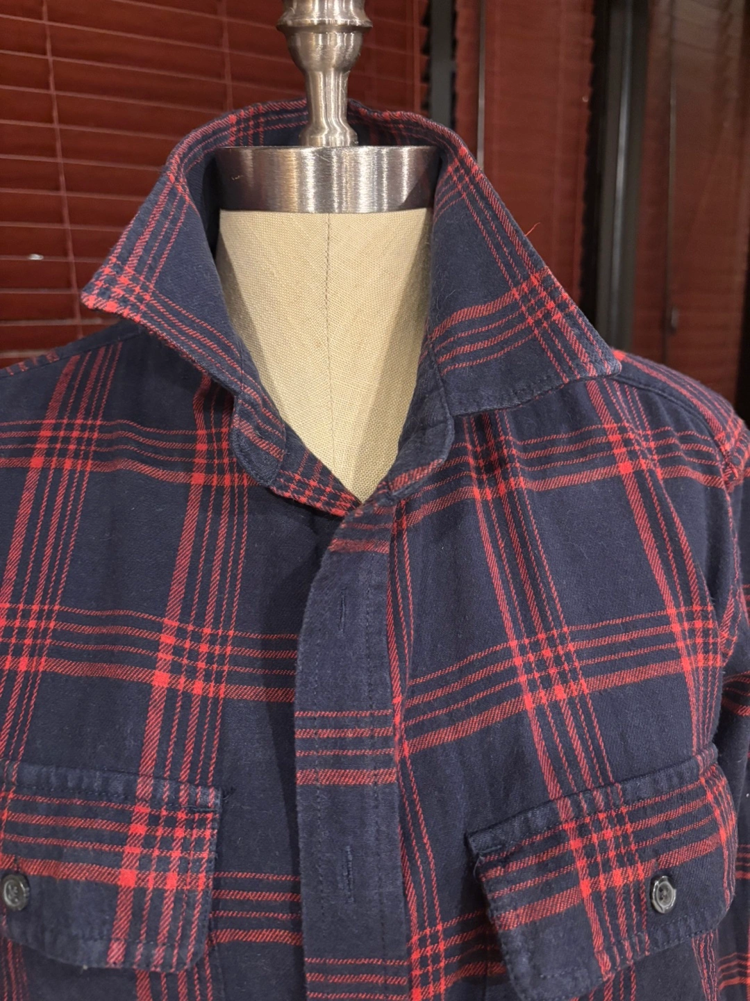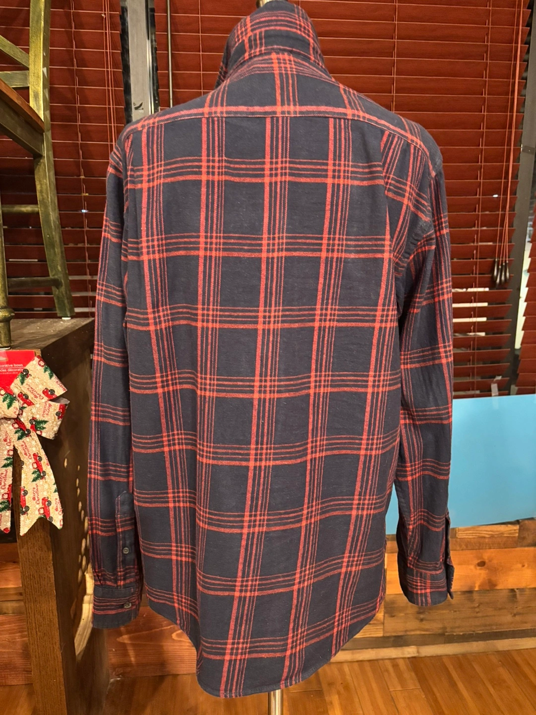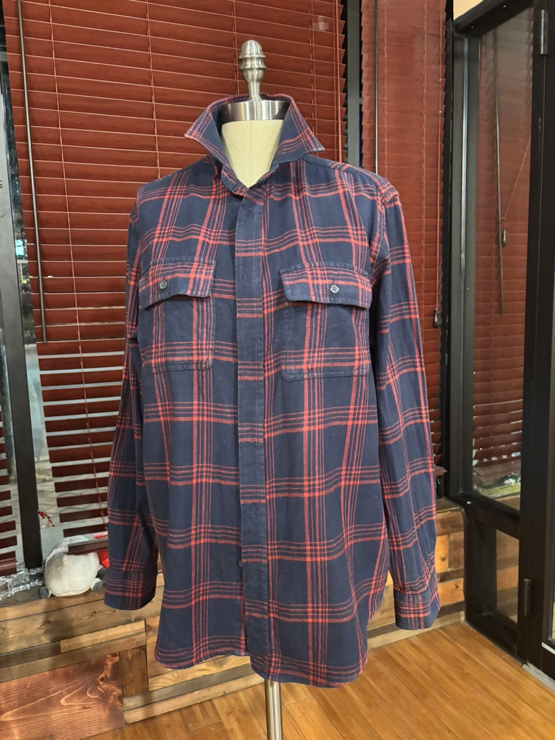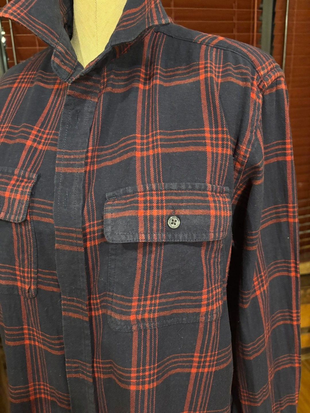 Long sleeve button-down shirt with two chest pockets. Red and blue plaid pattern. It’s large but close to medium.