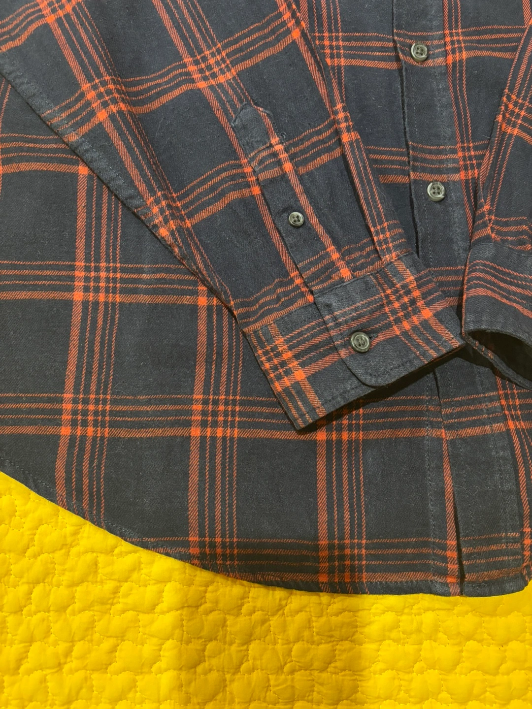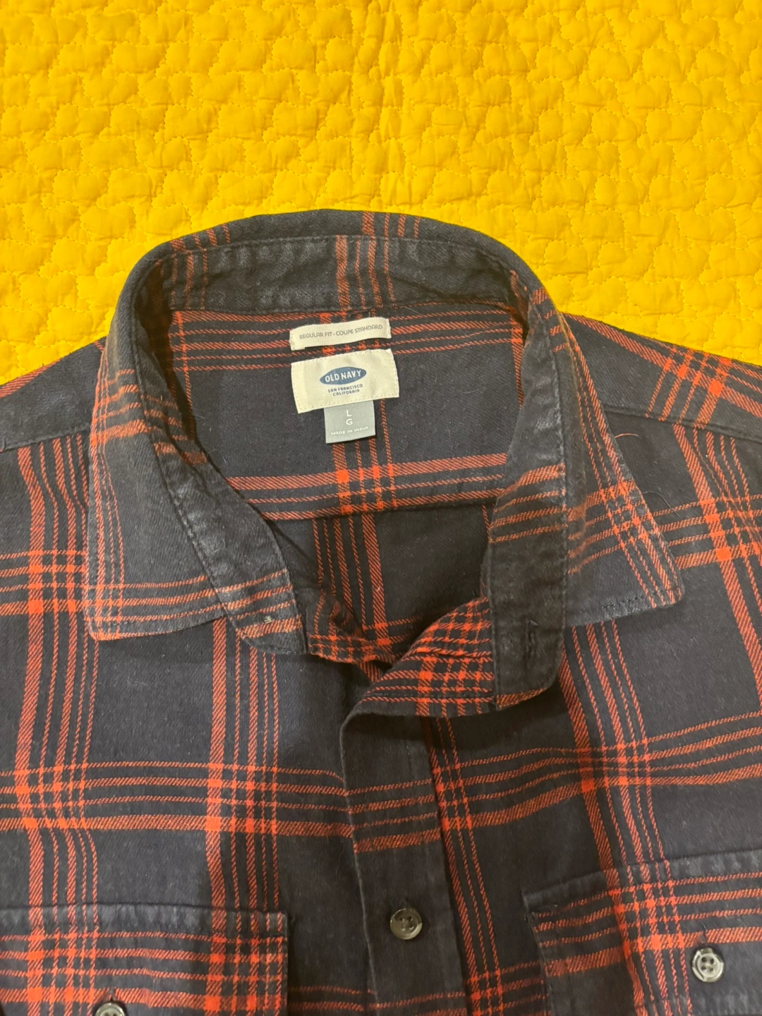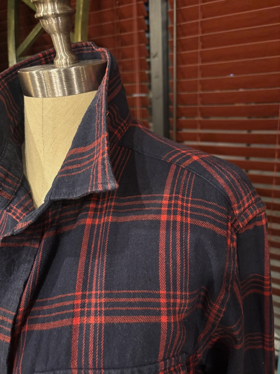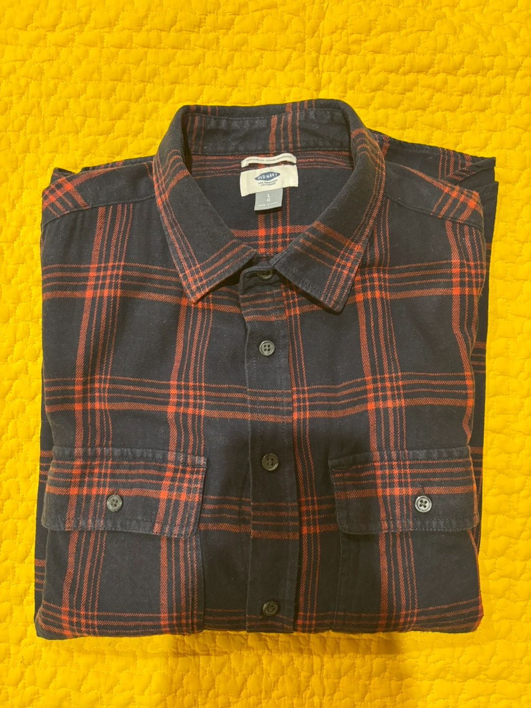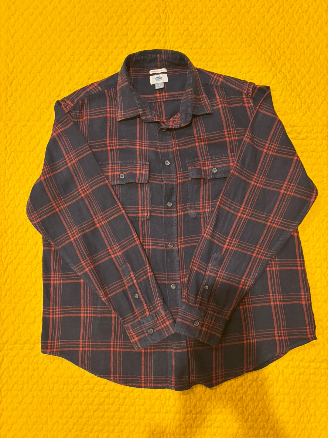 Long sleeve button-down shirt with two chest pockets. Red and blue plaid pattern. It’s large but close to medium.