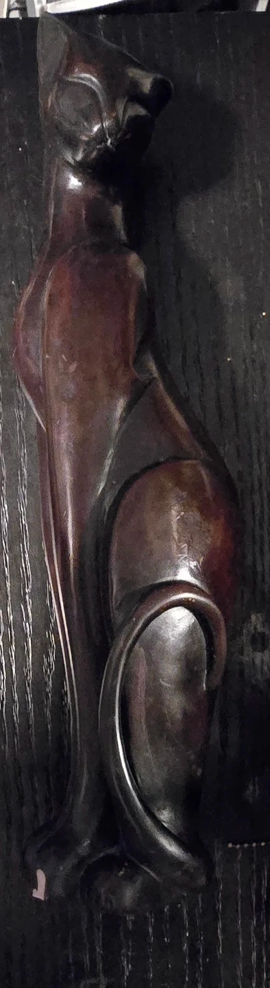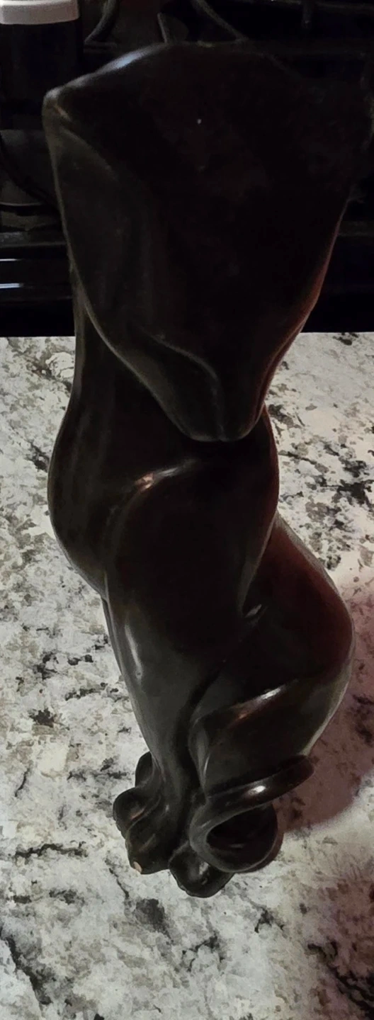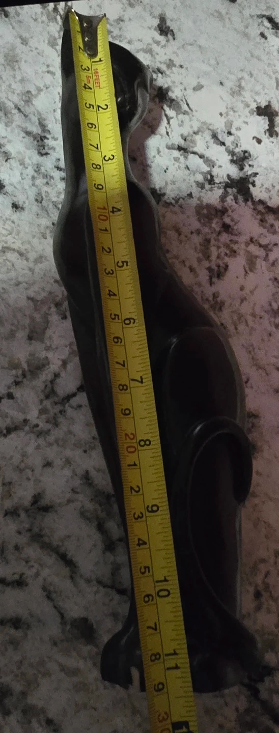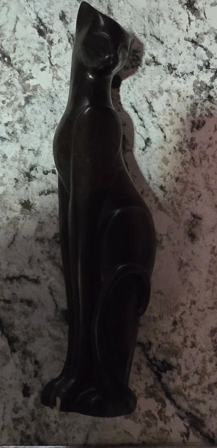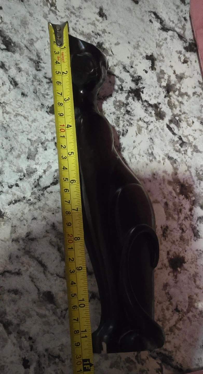 This is a vintage cat figurine with a bronze-like finish. Heavy solid piece It measures approximately 11 inches tall. It's a decorative piece that adds a touch of elegance to any space. Its sleek design makes it a lovely accent for shelves or tables.