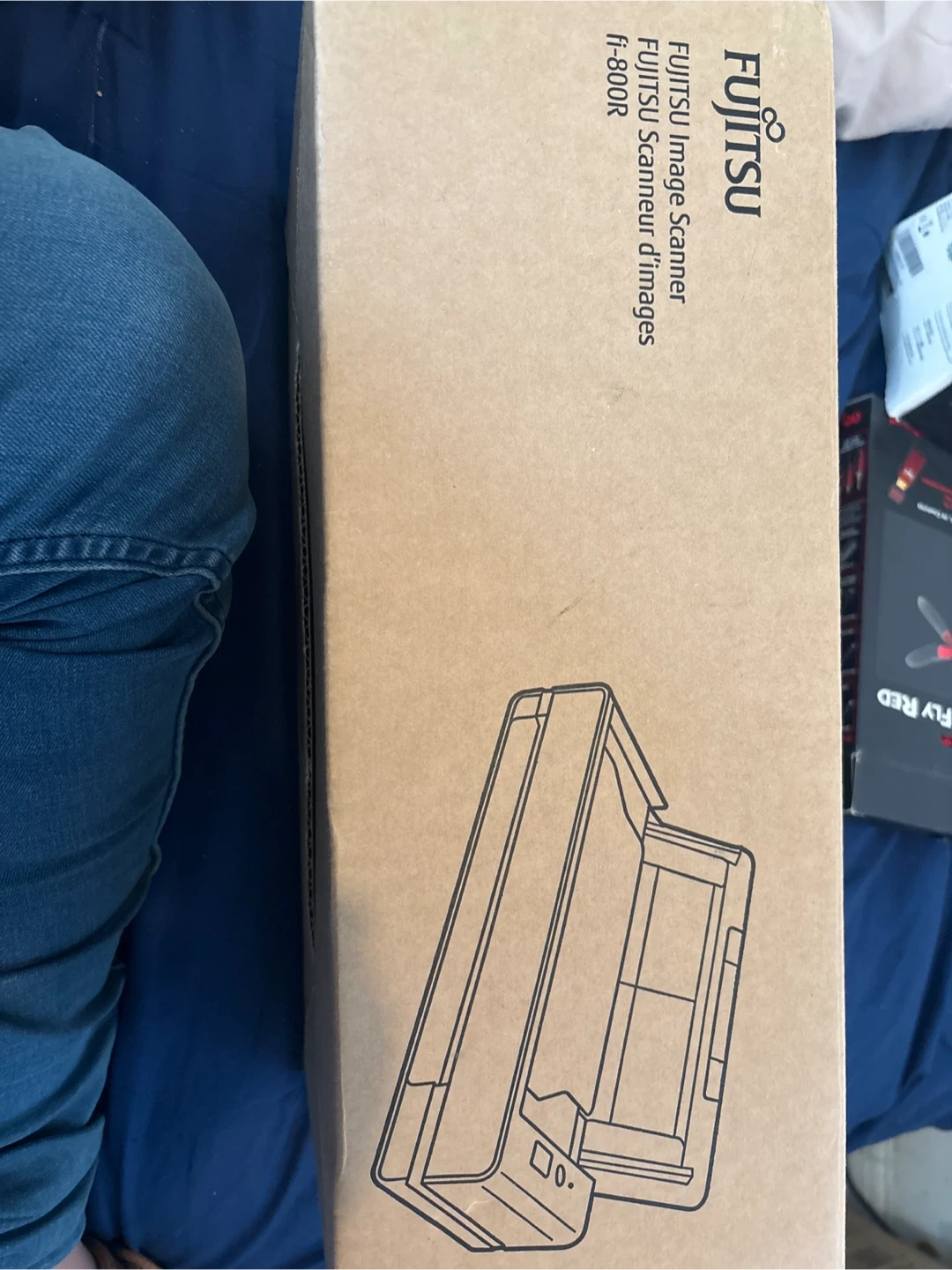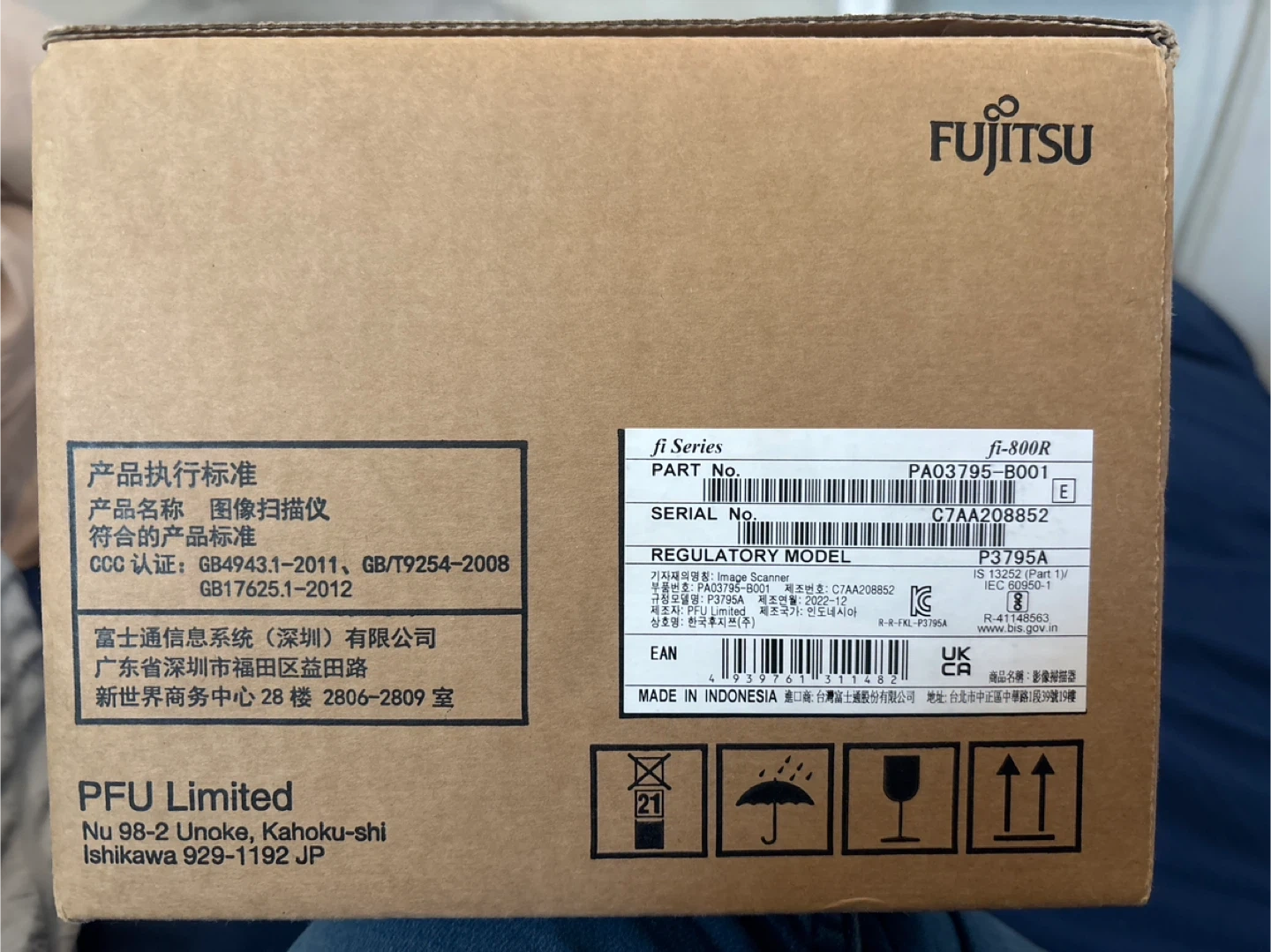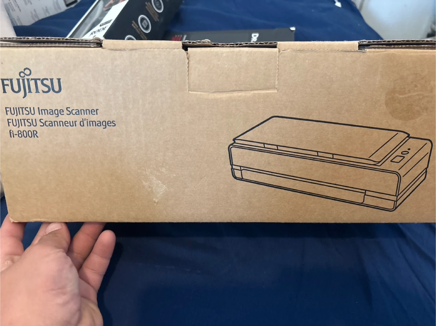 This is a Fujitsu fi-800R image scanner. It includes the main unit and accessories. It's designed for scanning documents quickly and efficiently.