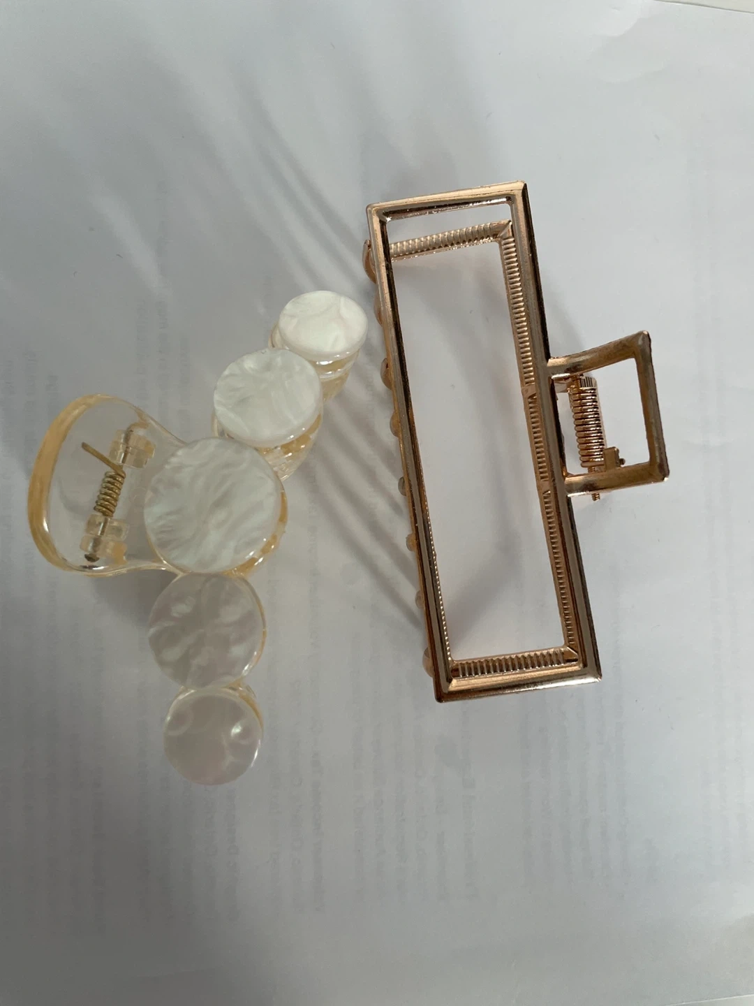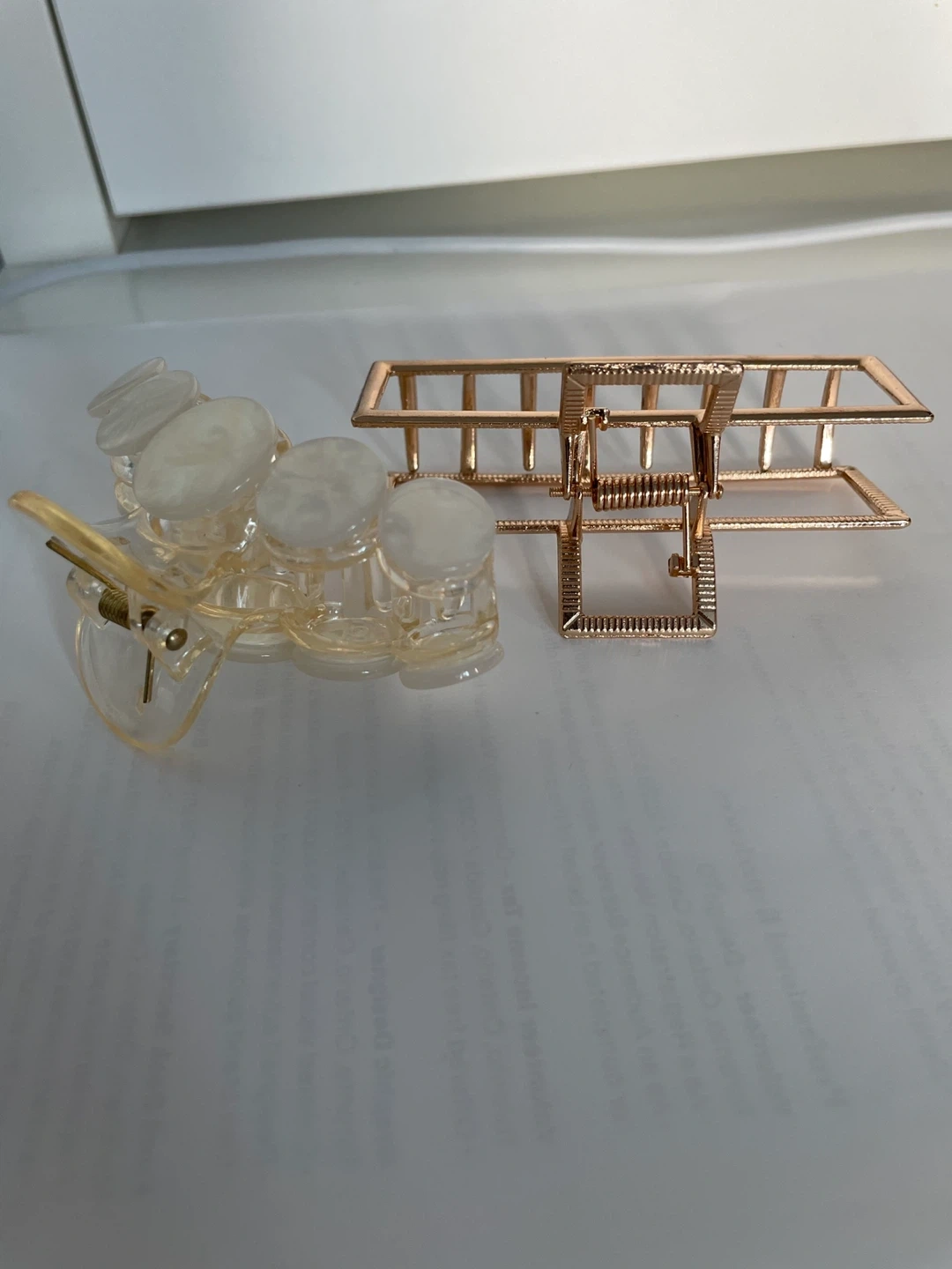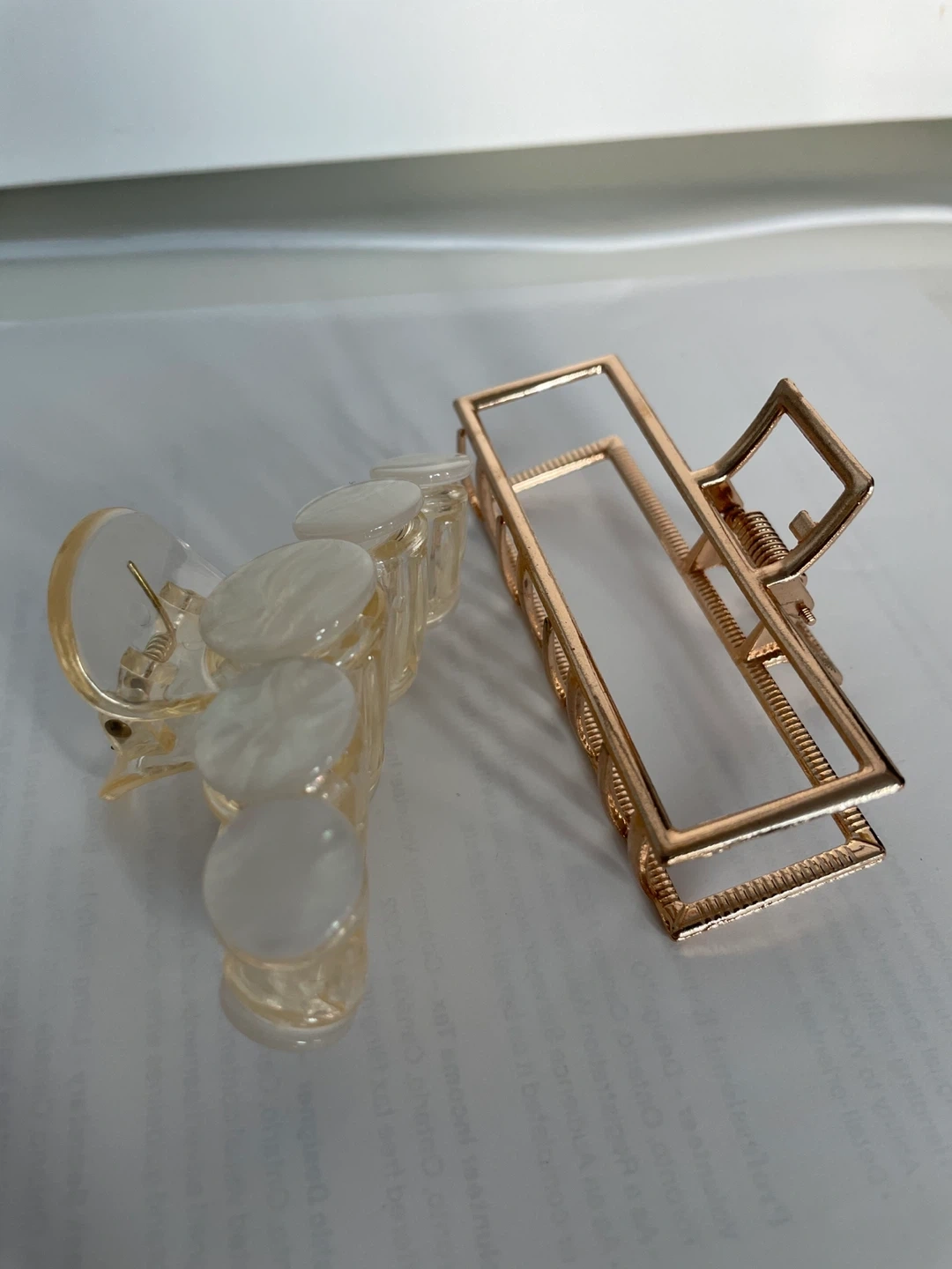 Selling a set of two stylish hair claw clips. One features a rose gold metal geometric design, while the other is a translucent clip with decorative pearl-like accents. Perfect for holding back hair!