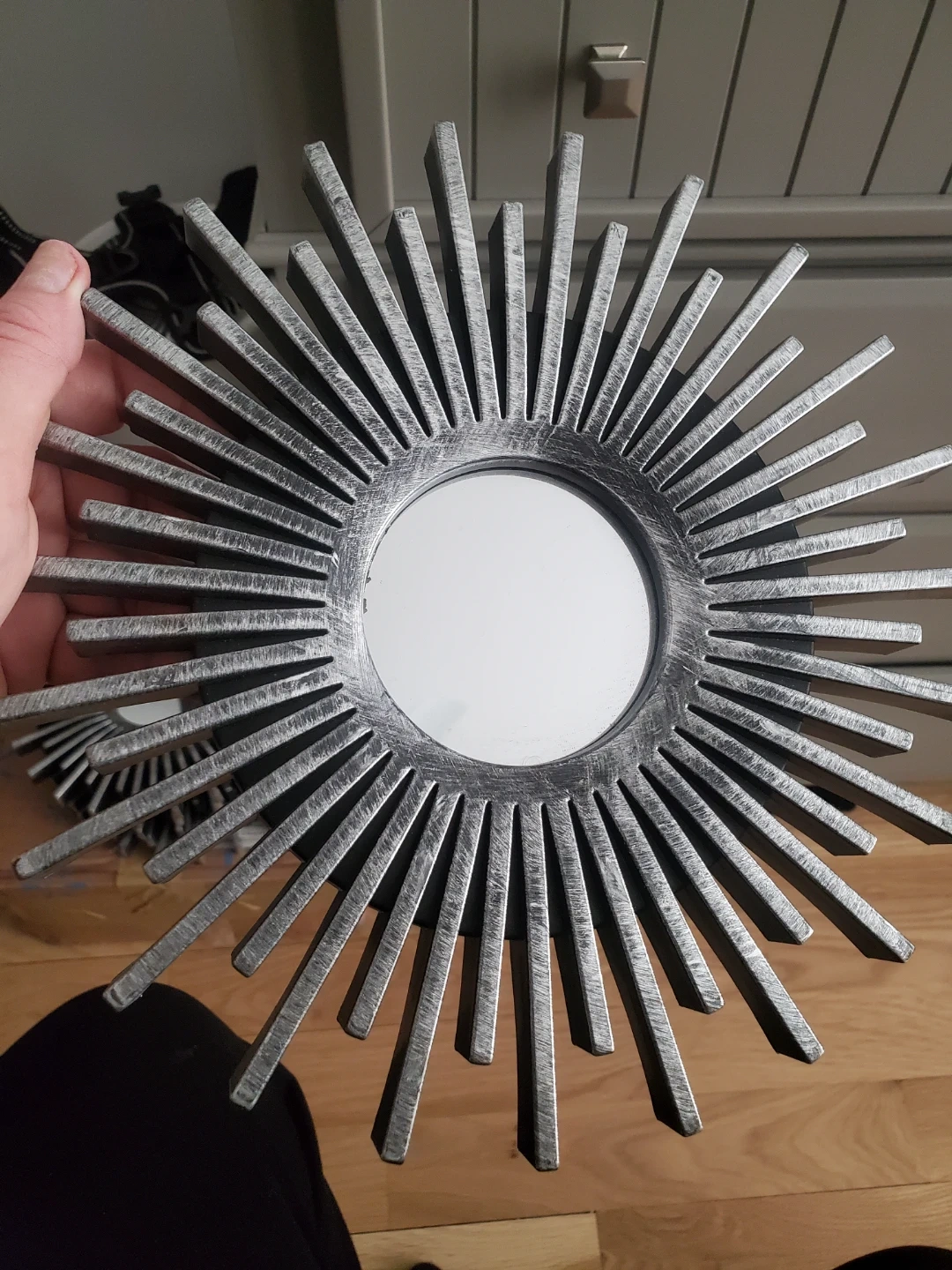 Decorative sunburst-style mirror. It's a unique accent piece with a silver-toned frame. This mirror's rays add a touch of vintage charm to any room!