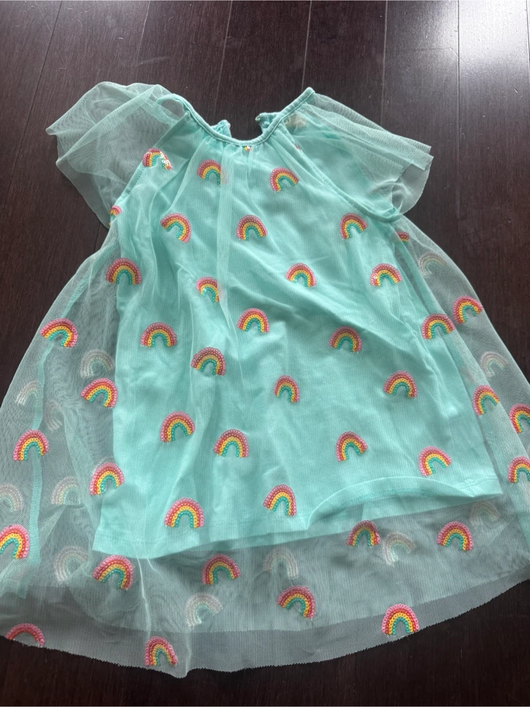 Sweet teal tulle dress for little ones. Features a fun all-over rainbow embroidered design. Made with a light, airy mesh fabric. Perfect for parties or dress-up fun!