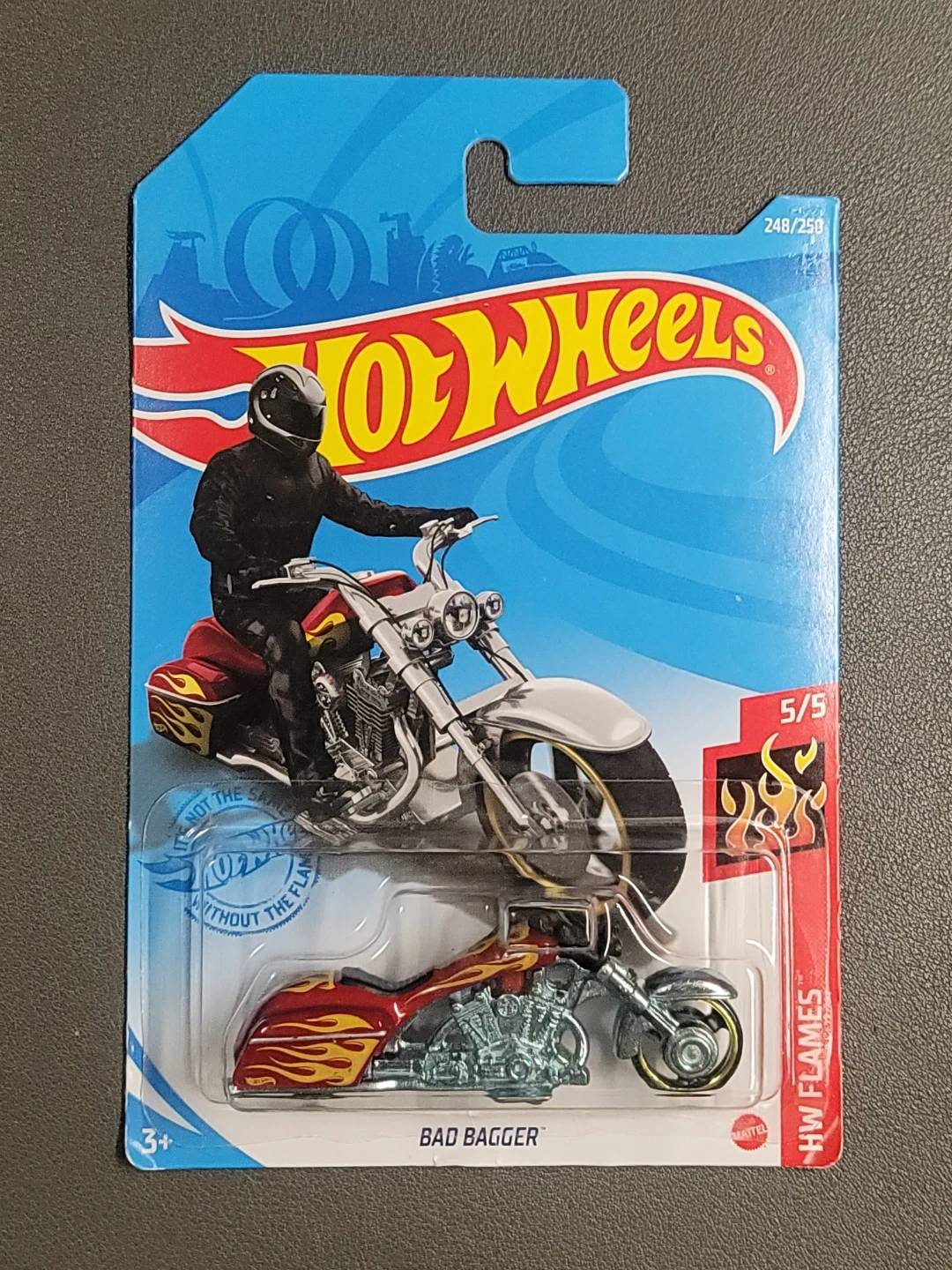 This is a Hot Wheels Bad Bagger toy motorcycle. It's part of the HW Flames series. This die-cast vehicle is great for collectors and kids aged 3 and up!