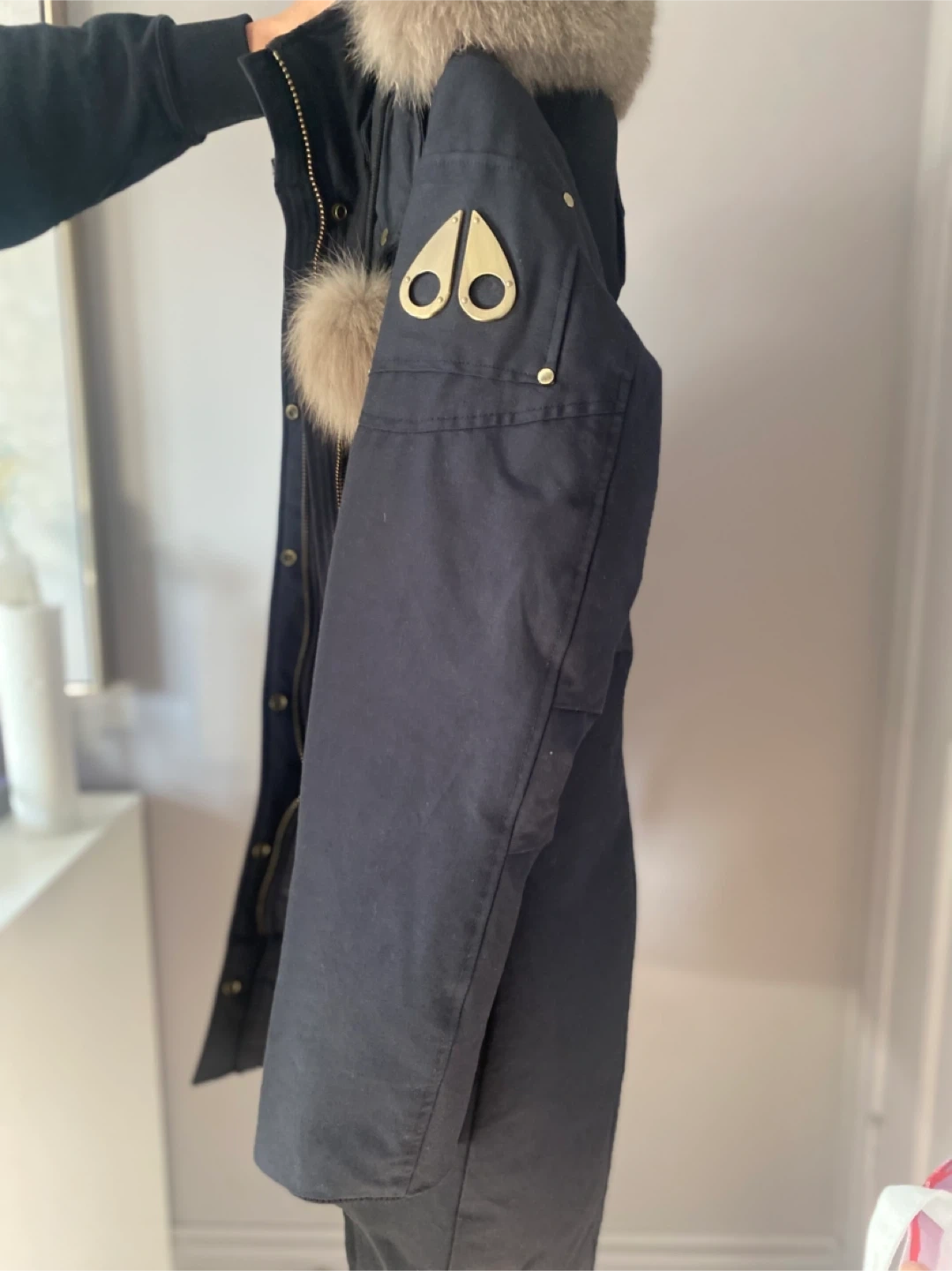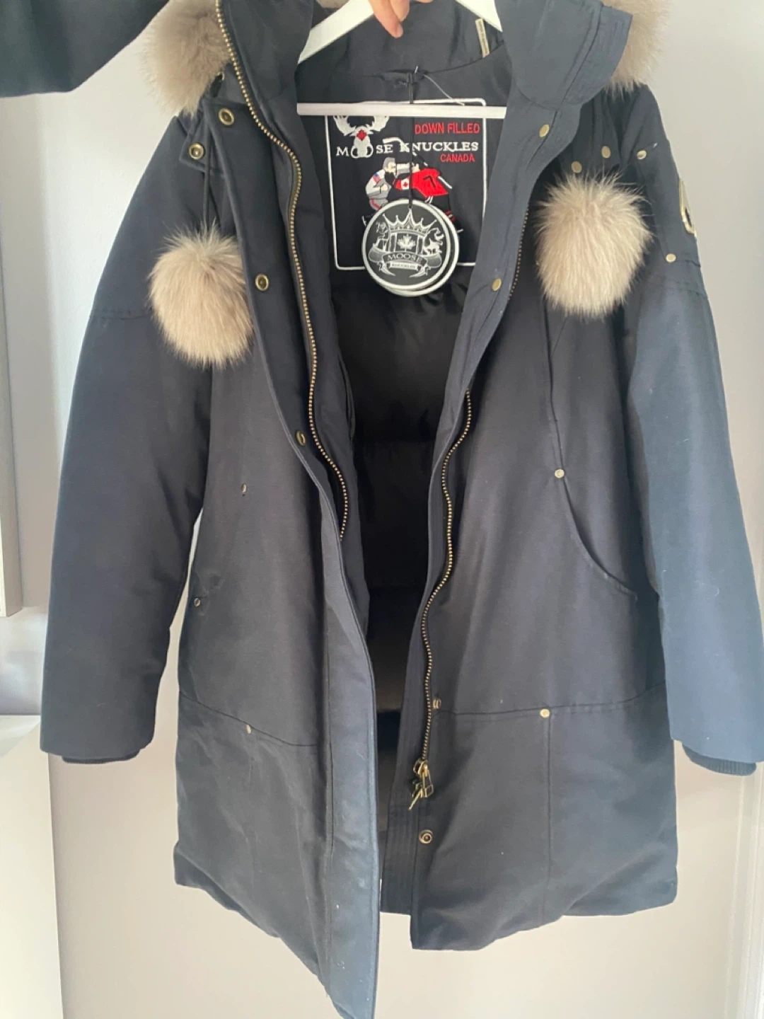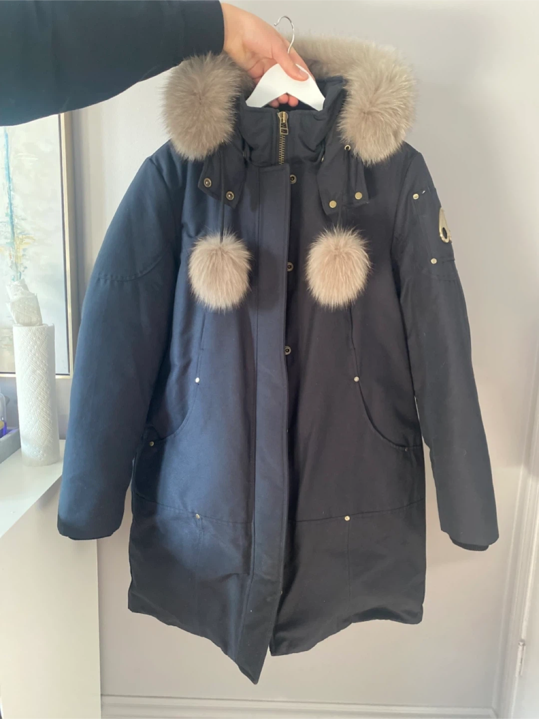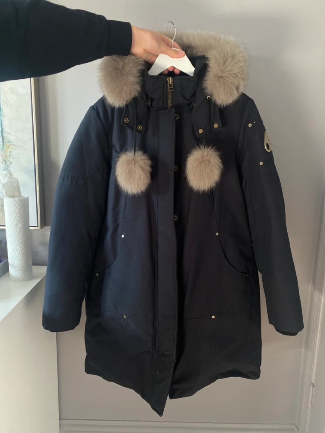 This is a Moose Knuckles parka. It features a fur-trimmed hood and detachable fur pom-poms on the front. The jacket is made from durable material to keep you warm. It's great for cold weather.