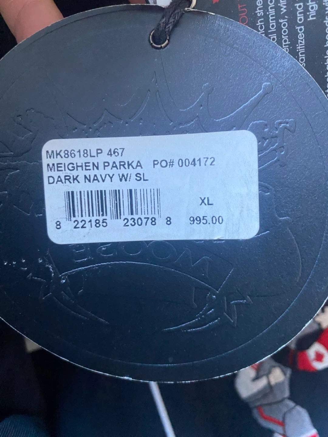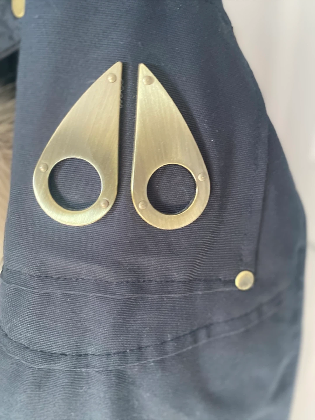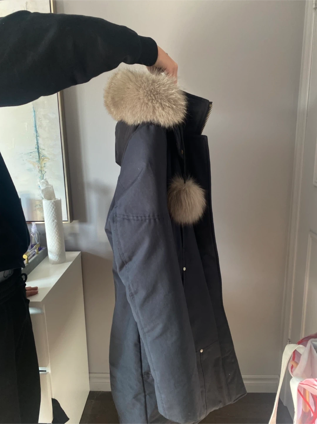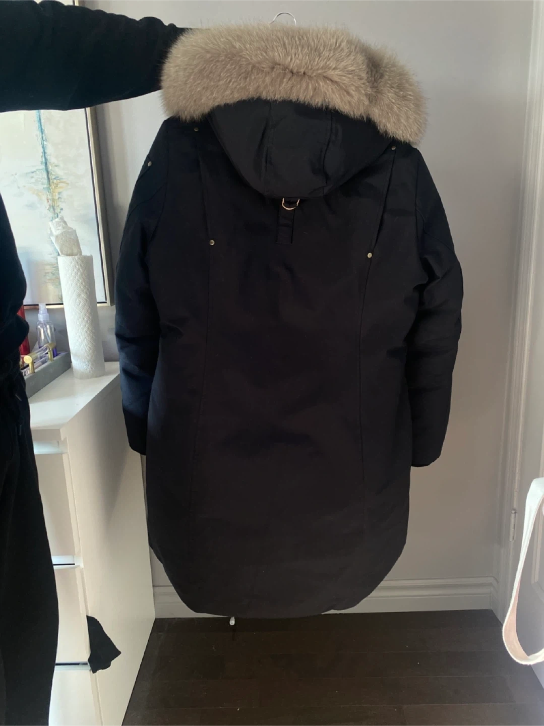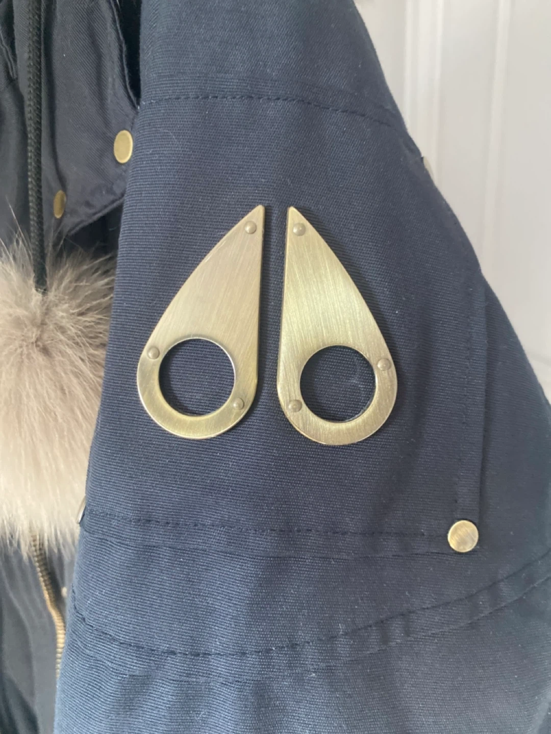 This is a Moose Knuckles parka. It features a fur-trimmed hood and detachable fur pom-poms on the front. The jacket is made from durable material to keep you warm. It's great for cold weather.