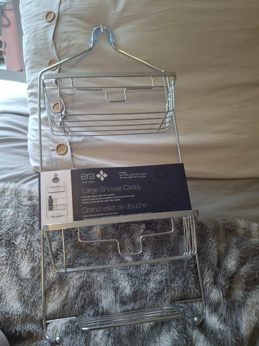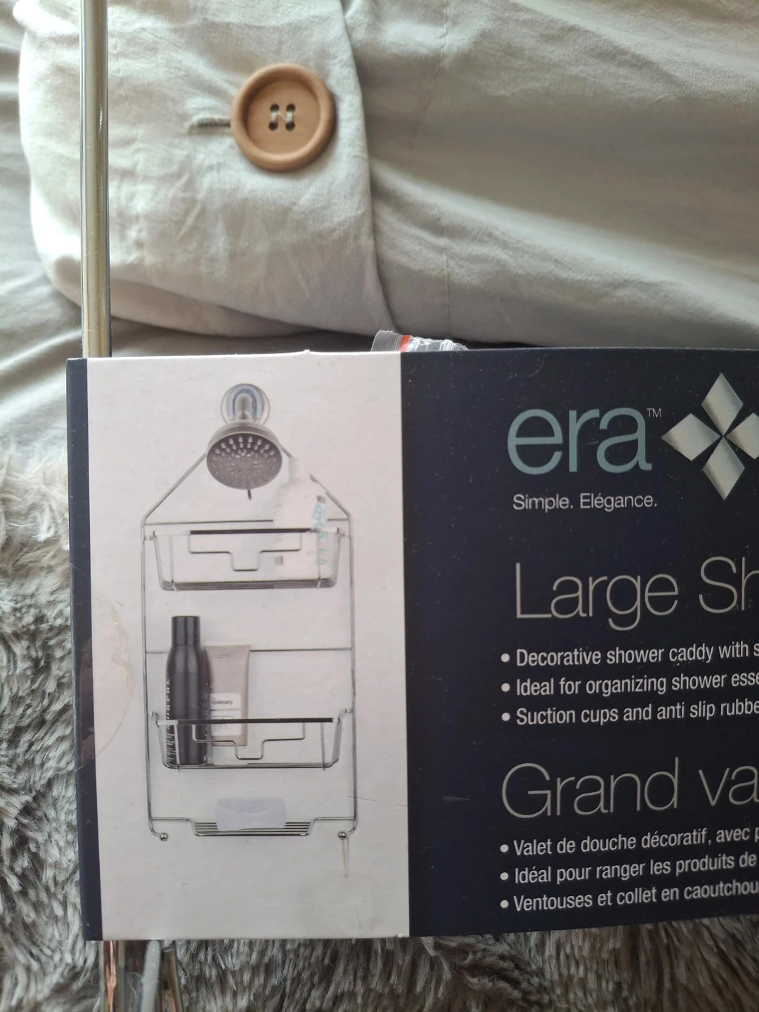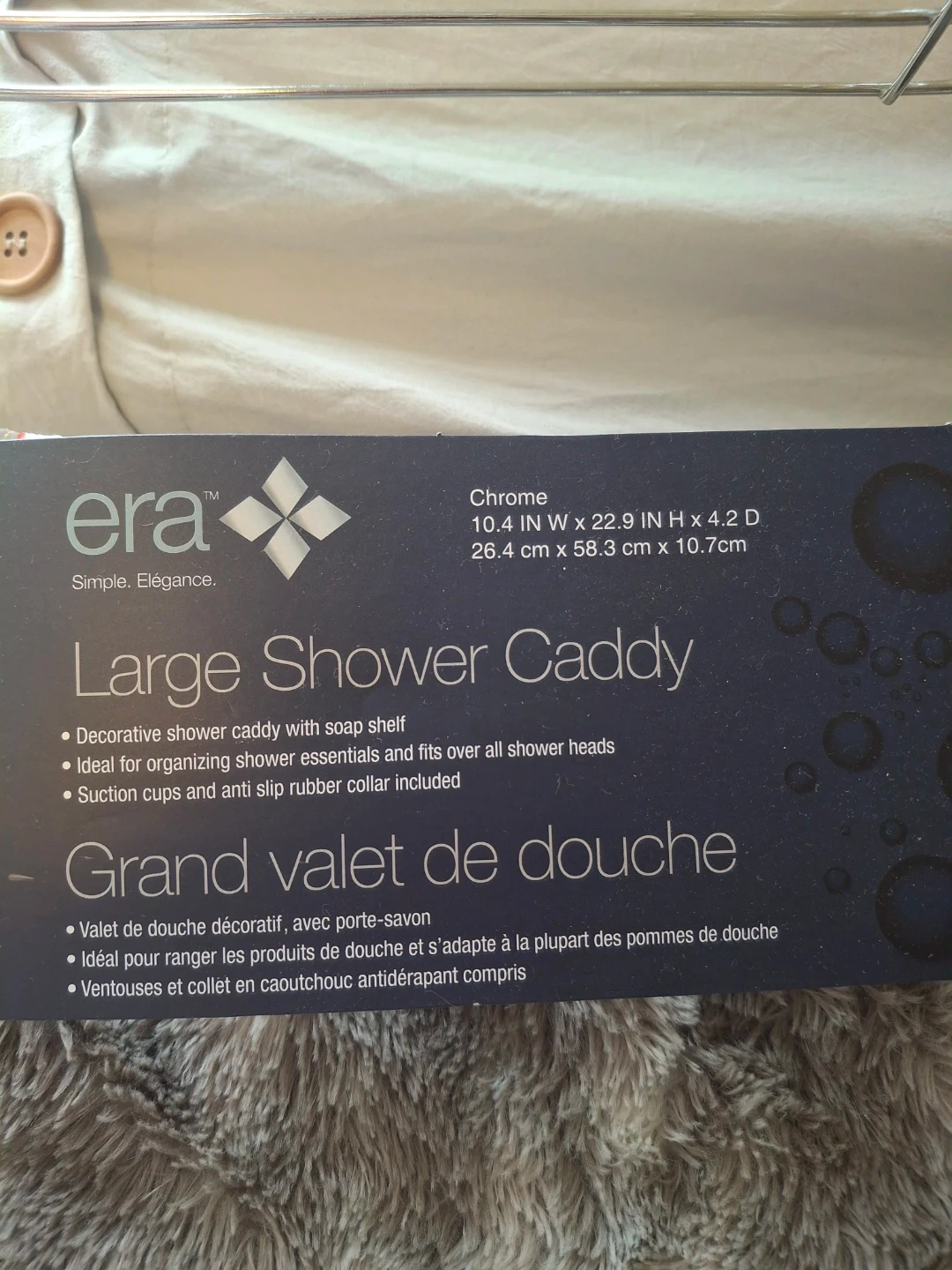 This is an Era brand large shower caddy in chrome. It's decorative and ideal for organizing shower essentials. Suction cups and anti-slip rubber collar are included for secure placement.