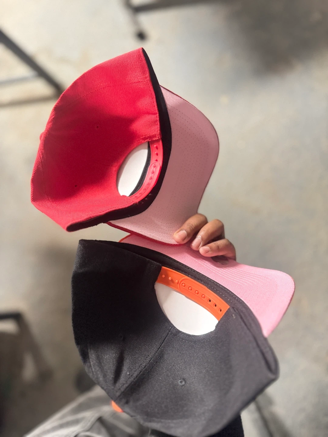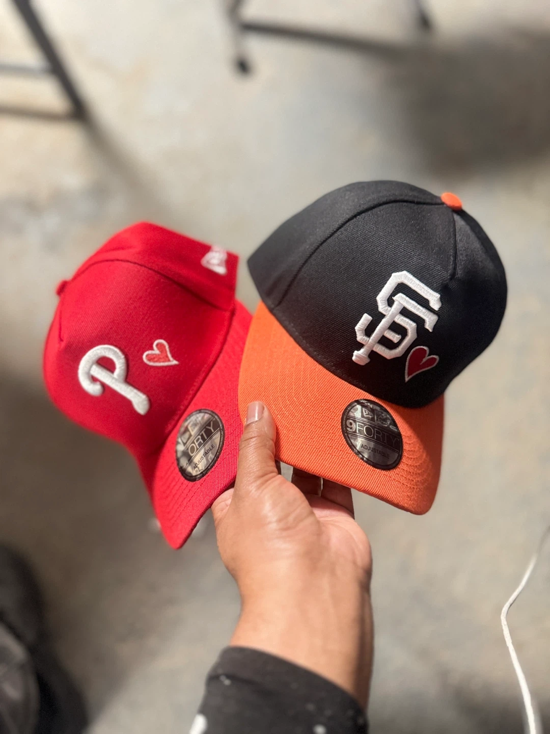 Two New Era baseball caps. One red Philadelphia Phillies cap with a white P and heart. One black San Francisco Giants cap with a white SF logo and orange brim, plus a heart detail. Both are adjustable 9FORTY models.