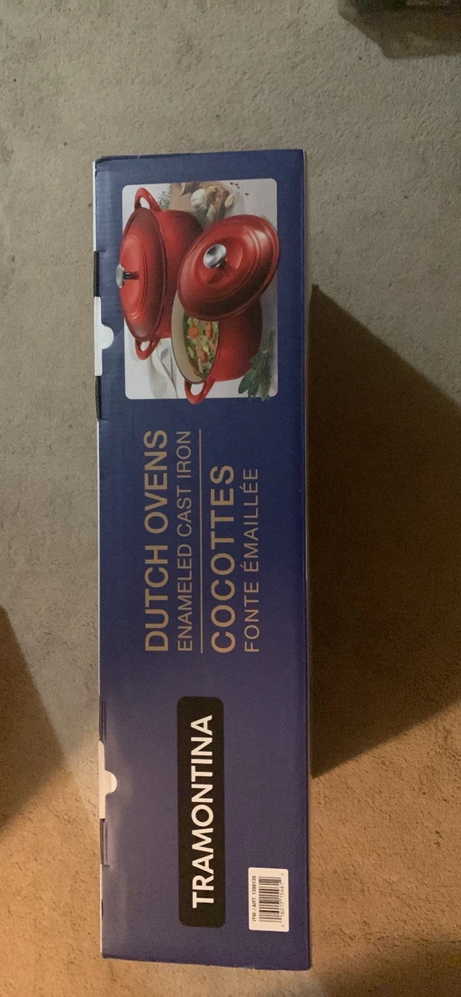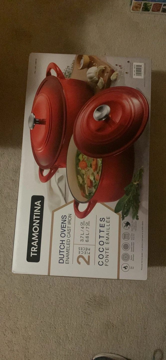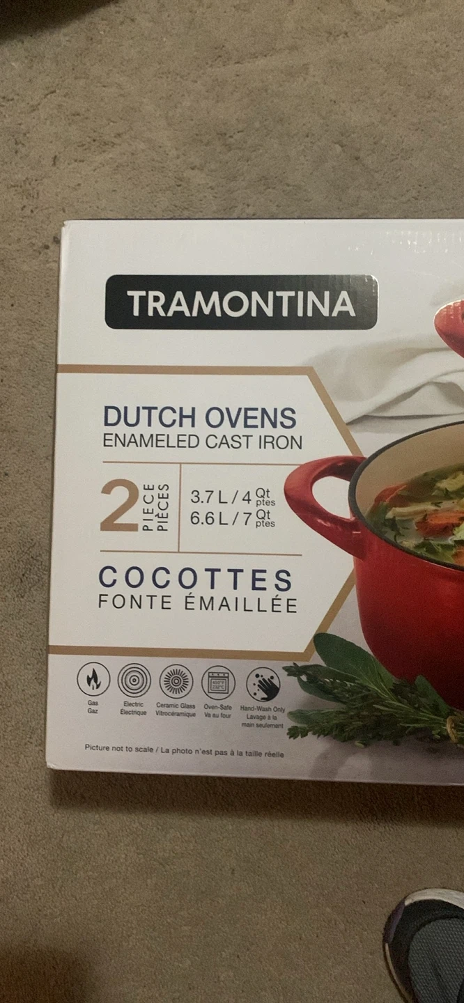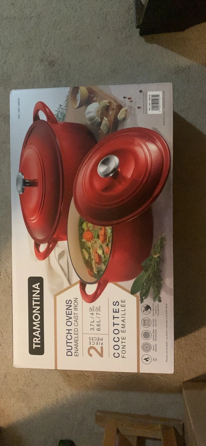 This is a Tramontina 2-piece set of enameled cast iron Dutch ovens. It includes one 3.7L/4 Qt pot and one 6.6L/7 Qt pot. These pots are suitable for gas, electric, and ceramic stovetops, as well as oven use. They require hand washing only.