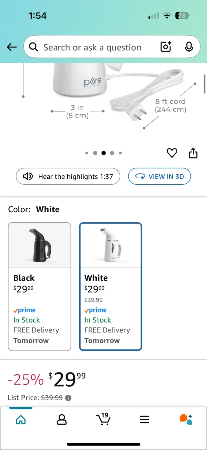 This is a Pure Enrichment PureSteam portable fabric steamer in white. It's a handheld travel garment steamer that removes wrinkles and is safe on all fabrics.
