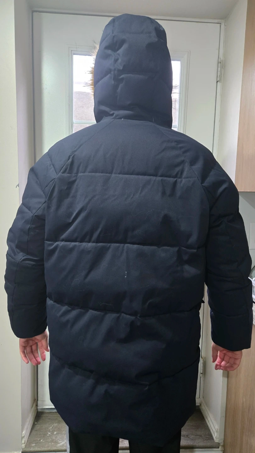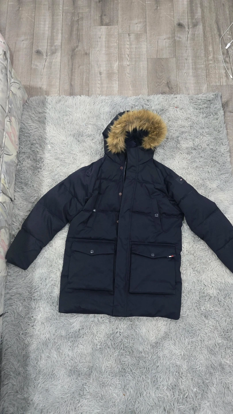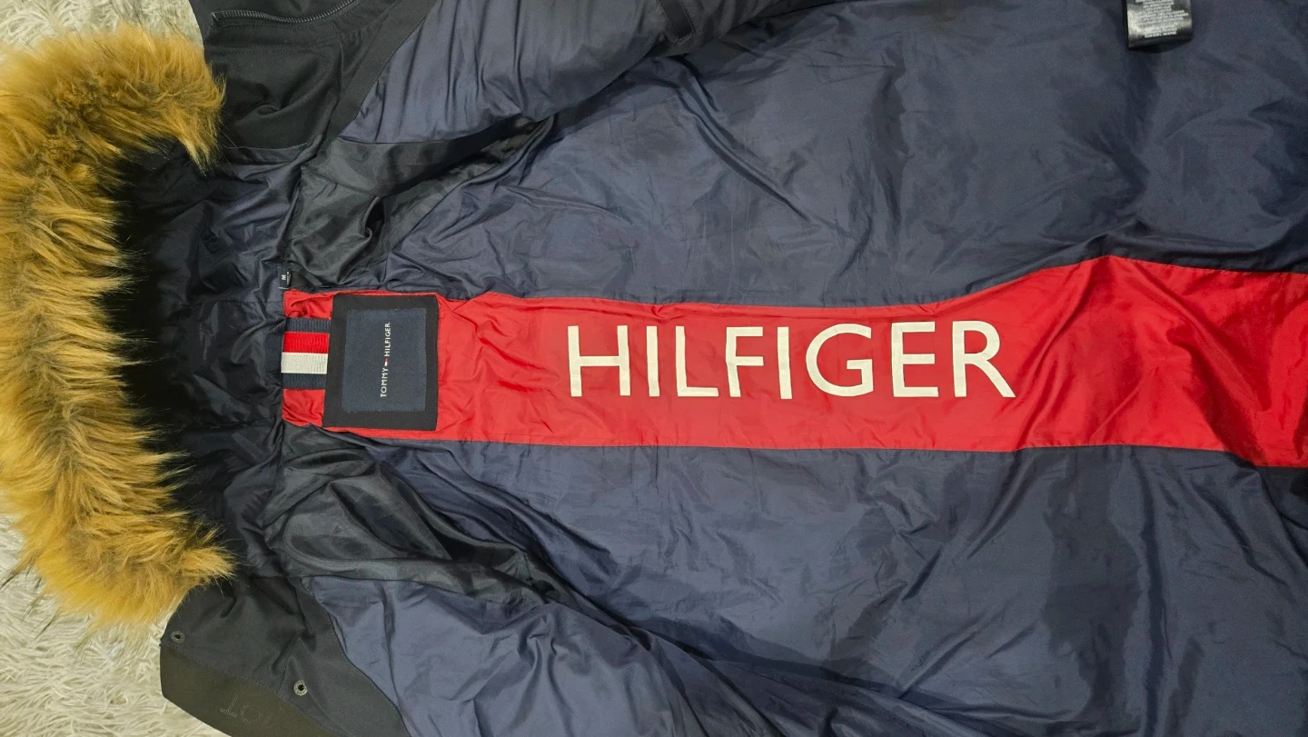 Here's a Tommy Hilfiger Winter Jacket in navy blue. It has a fur-trimmed hood and is perfect for staying warm during the colder months. It's in great condition and almost like new and ready for a new owner! The size is Medium but it's big in size and very cozy. It is enough alone as a layer. Barely worn and new one of these costs 450.