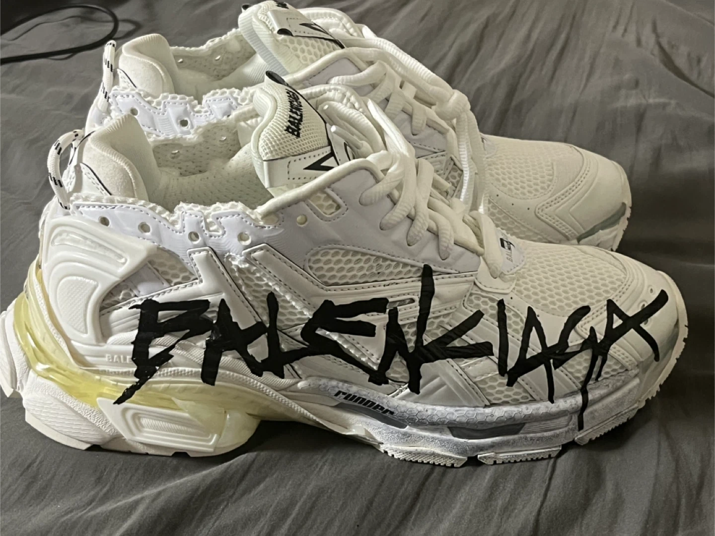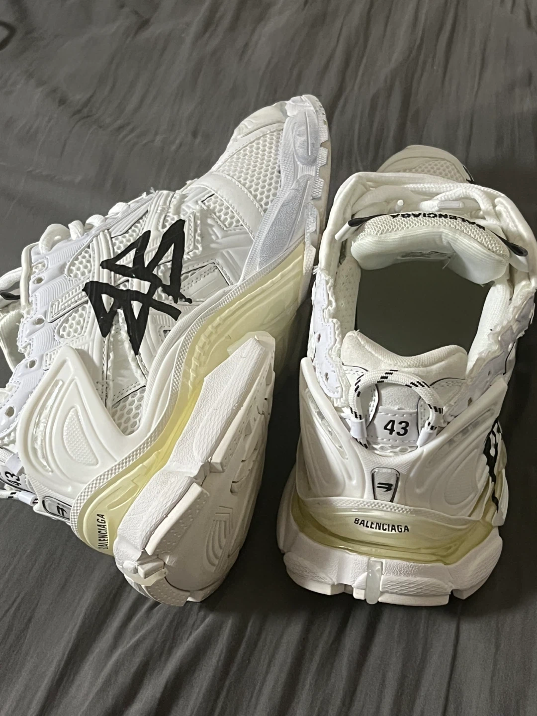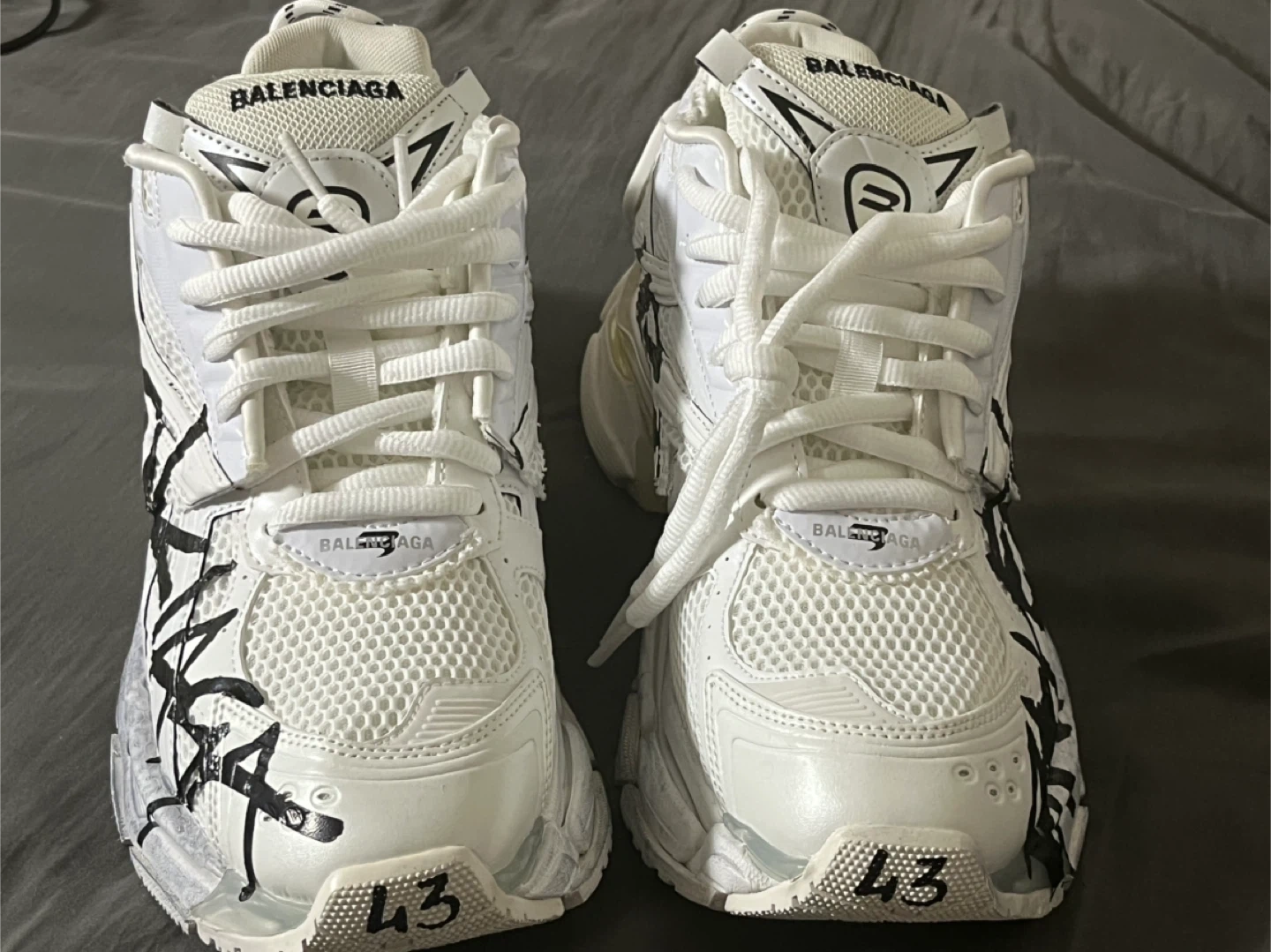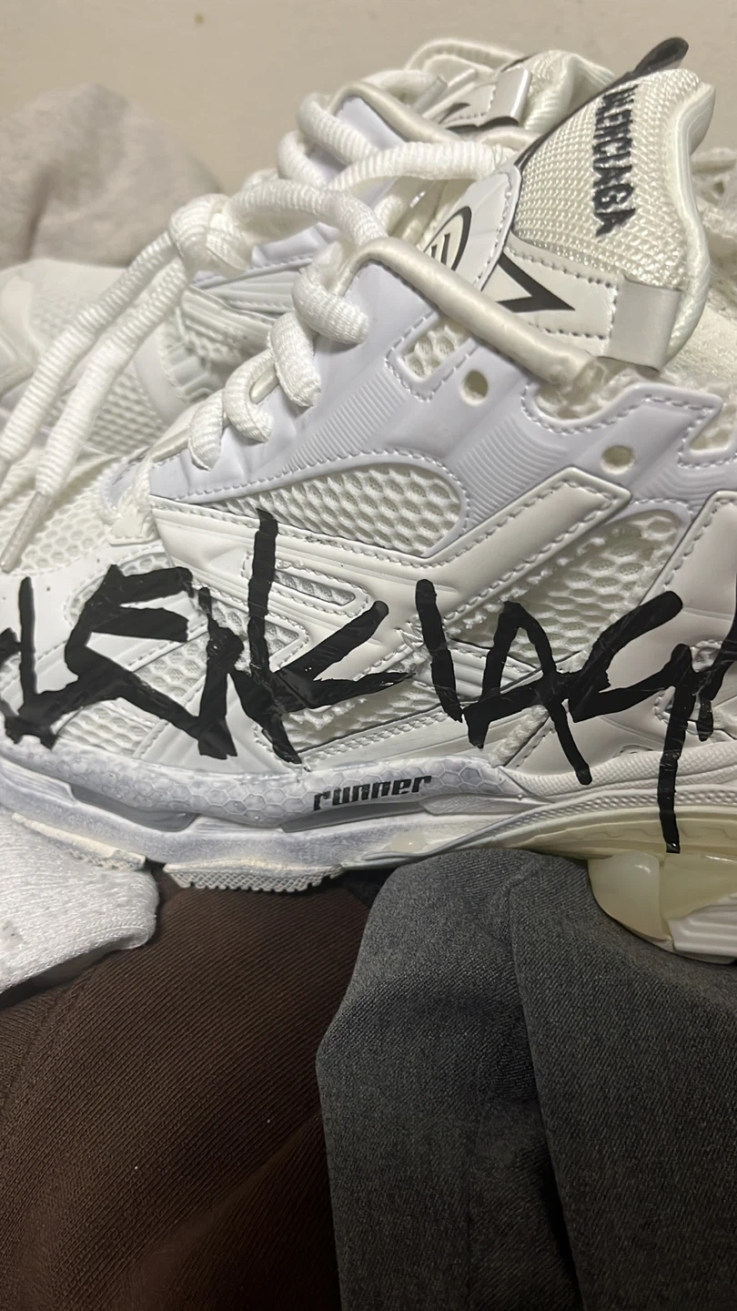 Balenciaga Runner sneakers in white with graffiti detailing. Features a chunky sole and athletic design. Size is 43. These shoes are perfect for a fashion-forward look.