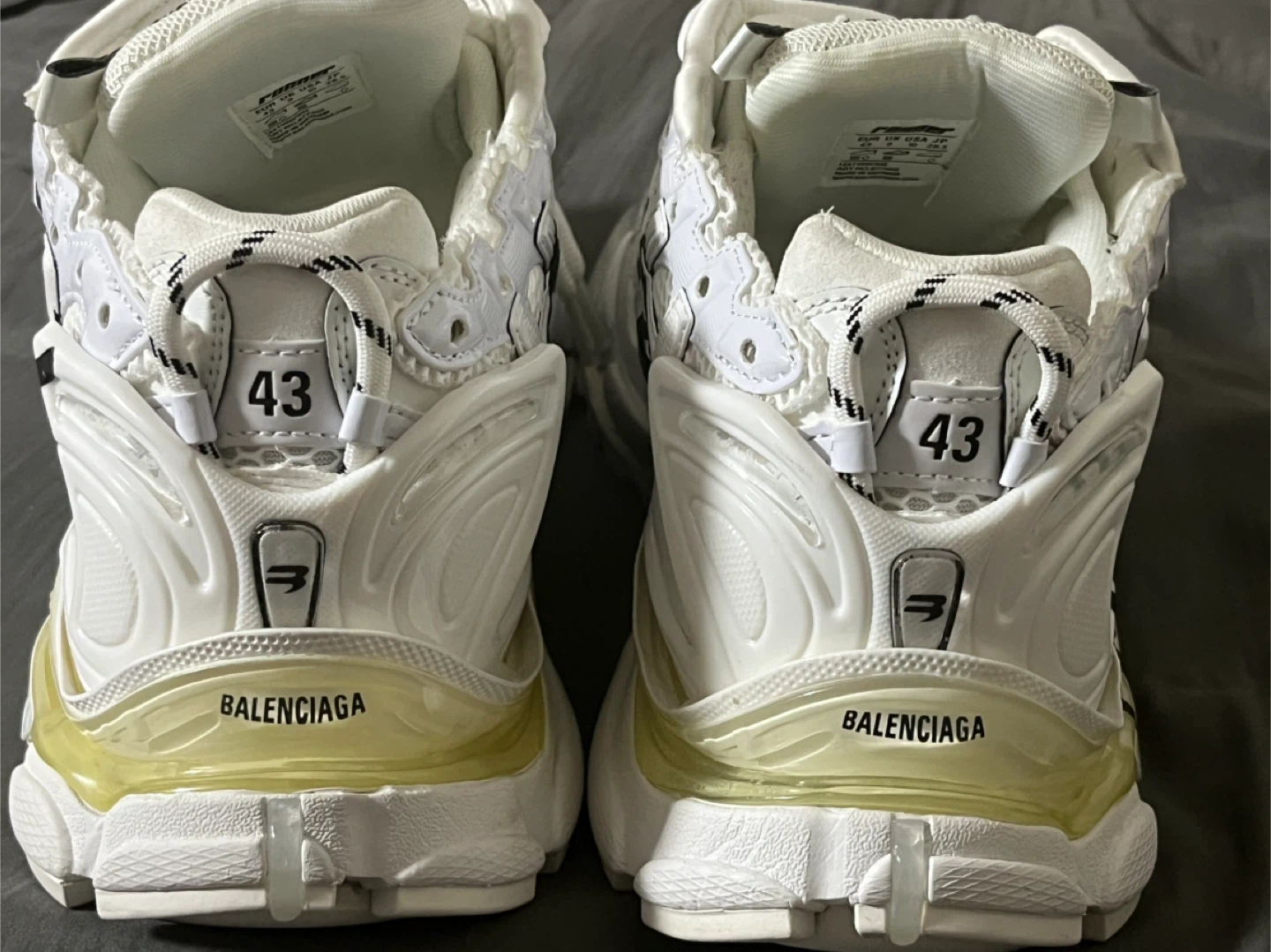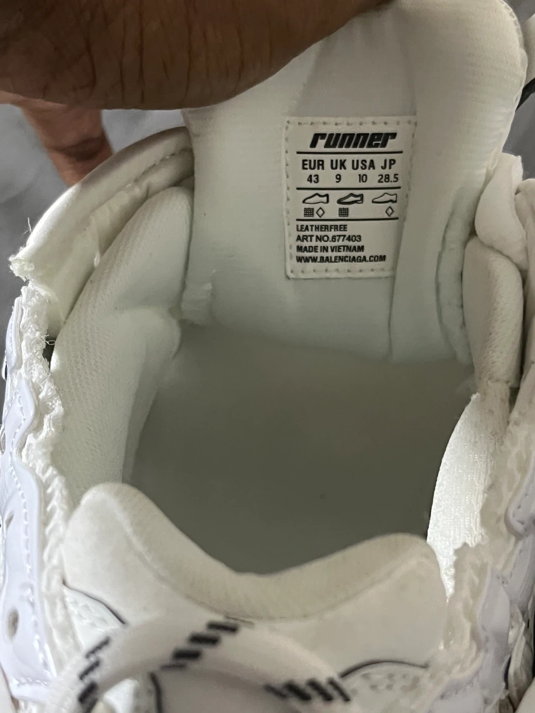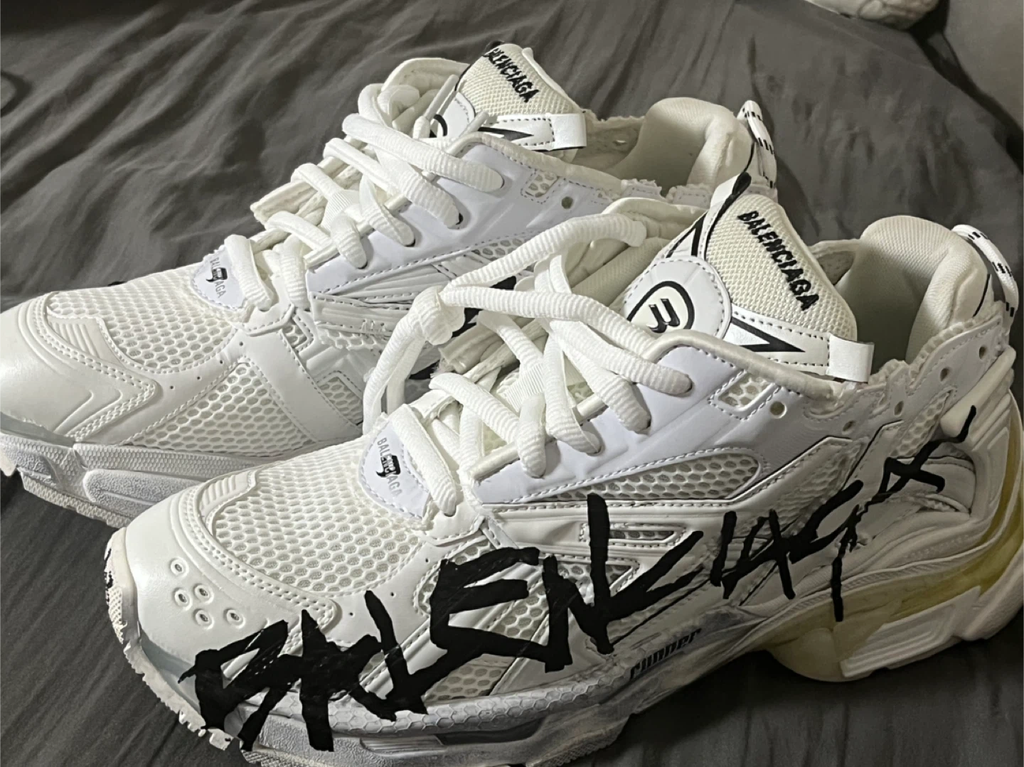 Balenciaga Runner sneakers in white with graffiti detailing. Features a chunky sole and athletic design. Size is 43. These shoes are perfect for a fashion-forward look.