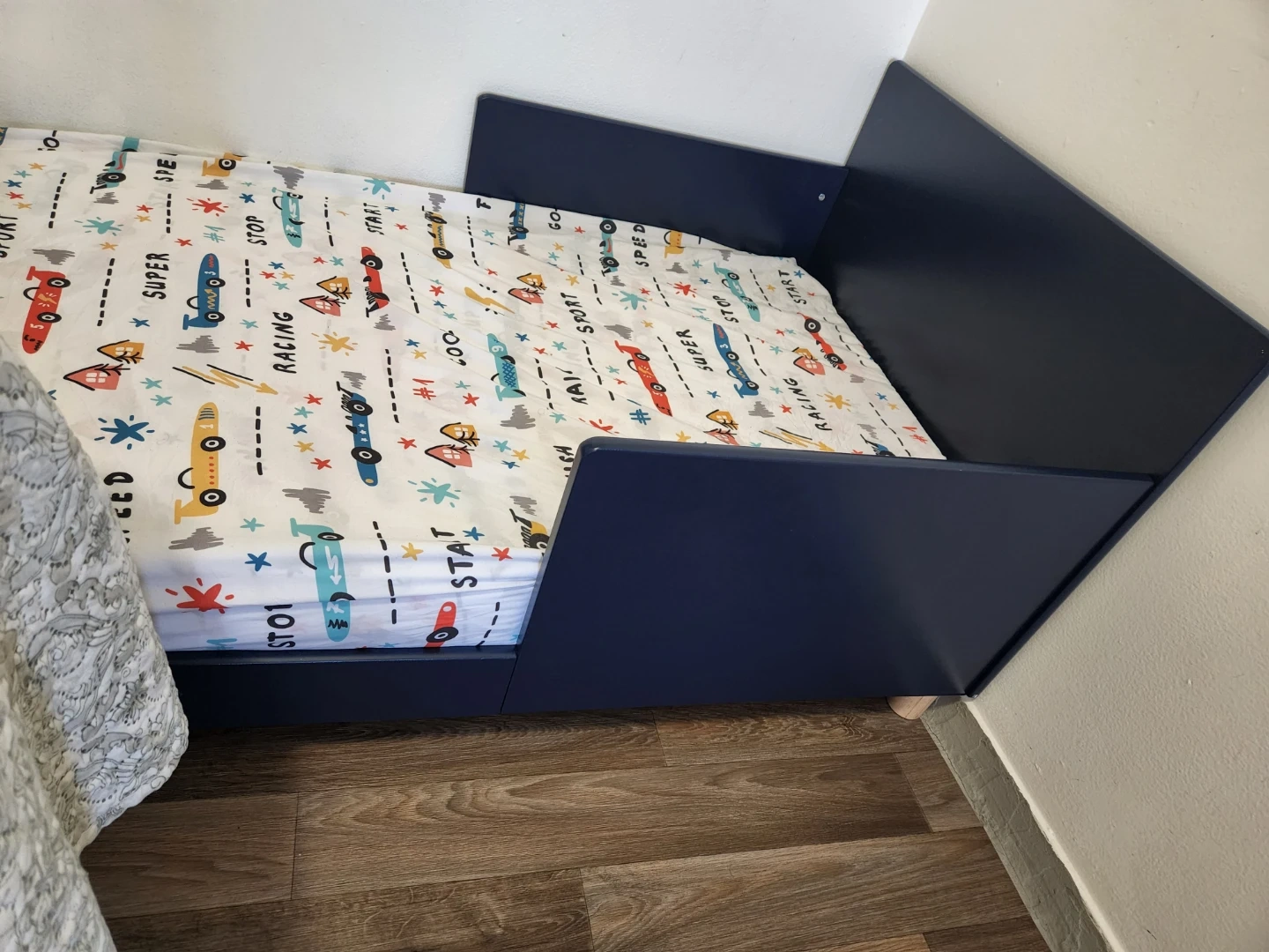 This gap navy blue toddler bed is perfect for a little one transitioning to a bigger bed. It features protective side rails and comes with fun race car themed sheets. The sturdy construction ensures it's a safe and exciting addition to any child's room!cash only